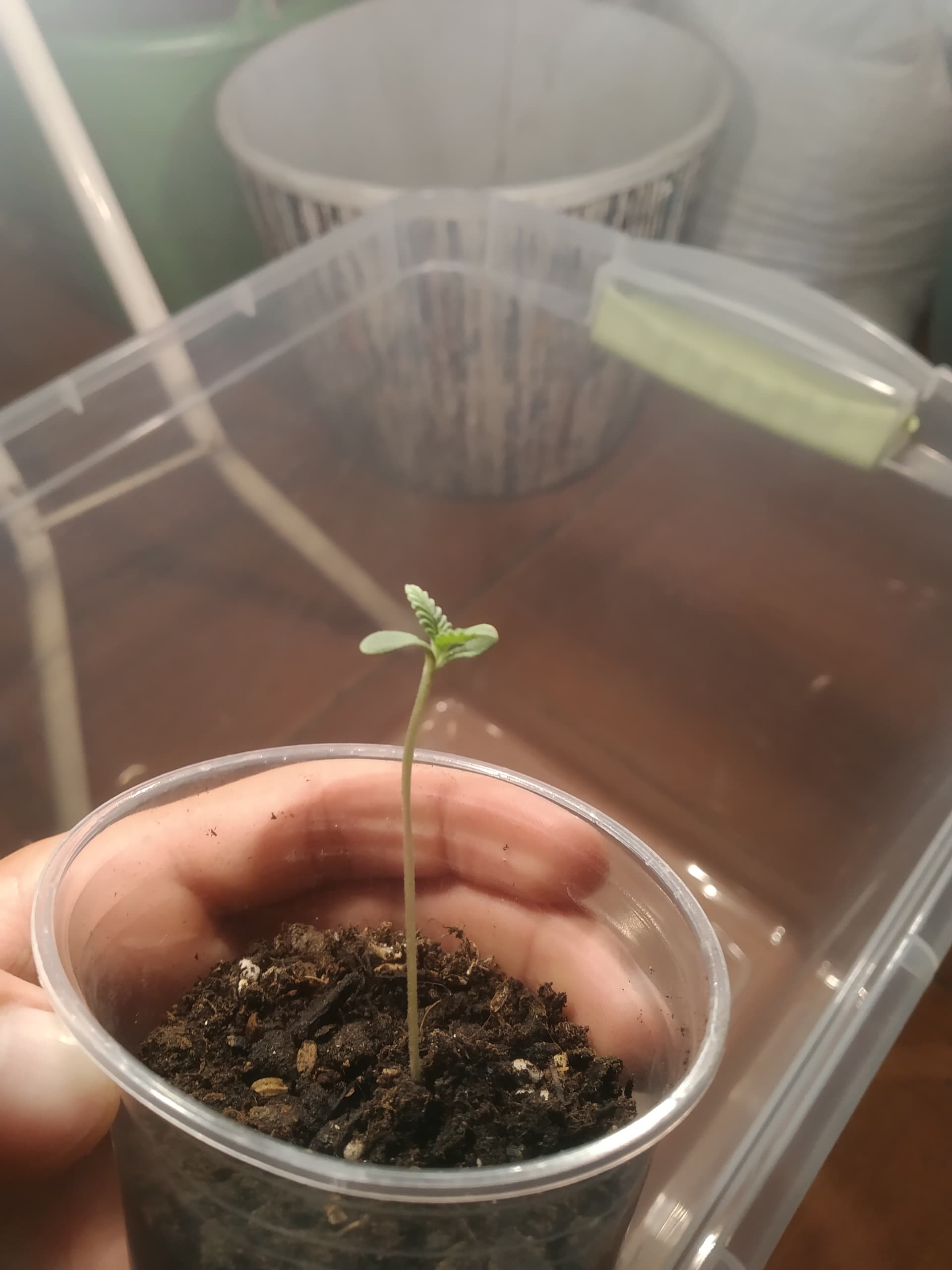Buenas soy nuevo en esto les dejo una foto de mi planta, tiene 5 días post germinación y transplante a tierra, es una amnesia Haze auto y está con dos focos de 100w incandescentes