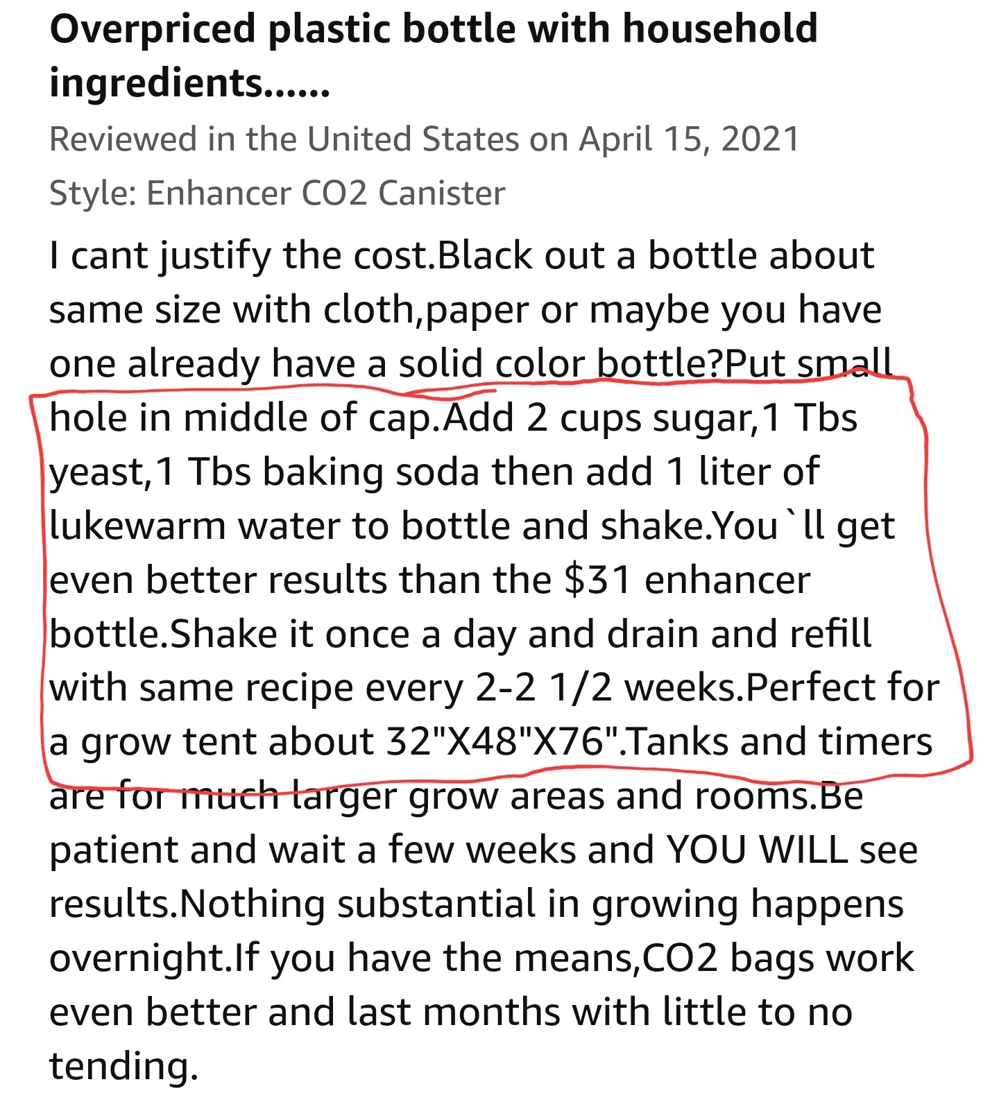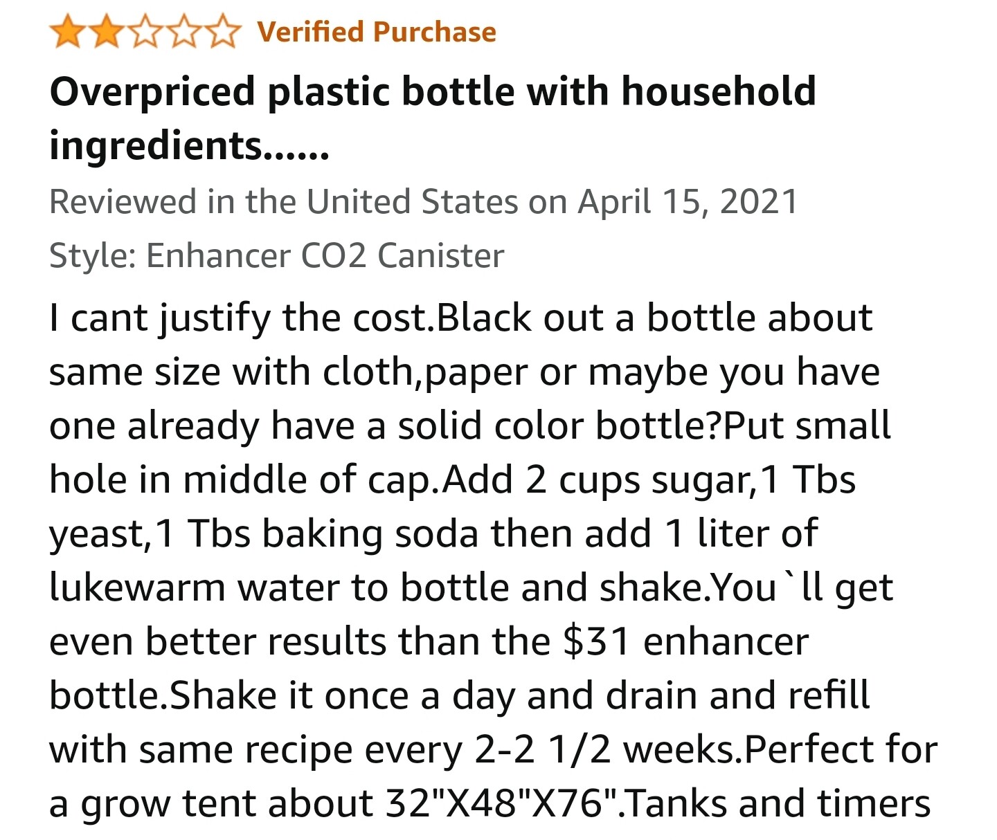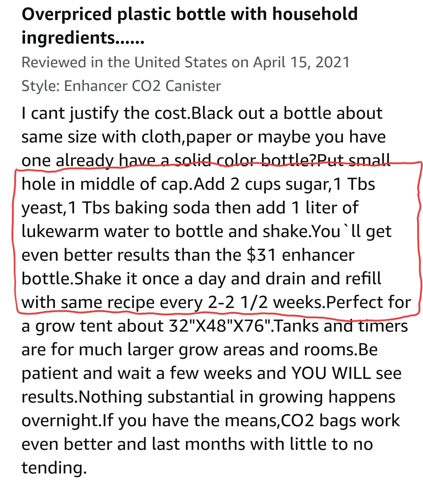 The best recipe that works for me is 1.5 or 2 Liter bottle That’s not clear or see-through because yeast doesn’t like light so make sure you got something that doesn’t let in your light in, then add two cups of sugar which is 16 oz, 1 tbst active yeast, 1 tbsp baking soda. Pop a small hole on top like 3-5 millimeters radius, add 1 Liter of warm water 101 to 110° F, Mix it all up and put it in your tent. After about 15 to 30 minutes it’ll start producing CO2 for a couple of weeks. Watch that CO2 video so you can have a better understanding on how much CO2 to add depending on the light intensity you’re using.