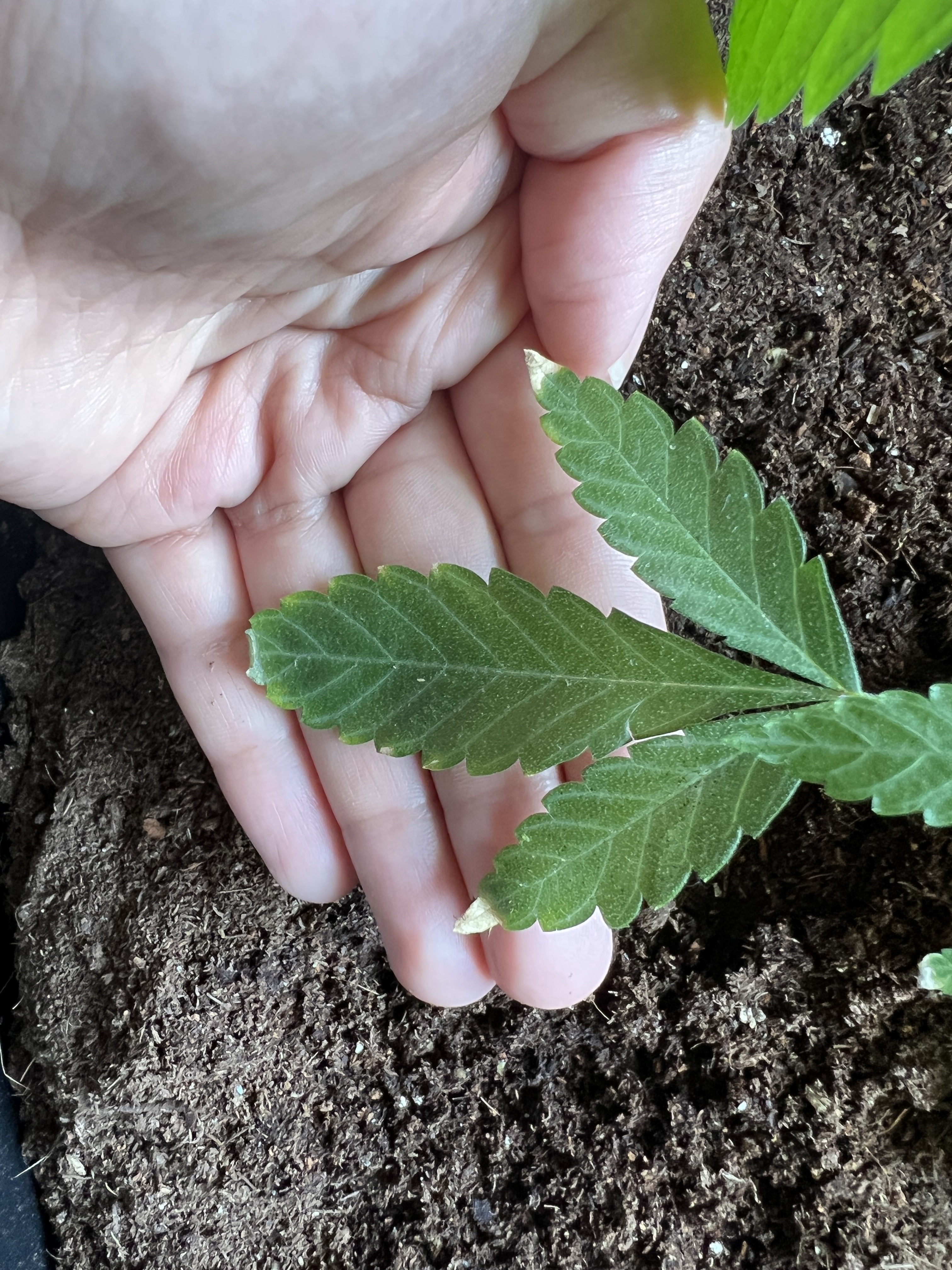 Hola. Tu plantas se está quemando por exceso de nutrientes. Riega con agua desmineralizada en los siguientes días hasta que muestre mejoras (que no hayan quemaduras y empiece a crecer sin problemas). El exceso de minerales puede retrasar el crecimiento o la absorción de otros nutrientes. También cuida el pH del agua de riego, entre 6 y 7. También cuida su temperatura, entre 18 y 25 °C. También veo que le falta algo de luz, la tienes en exterior? Cuál su fuente de luz? Saludos.