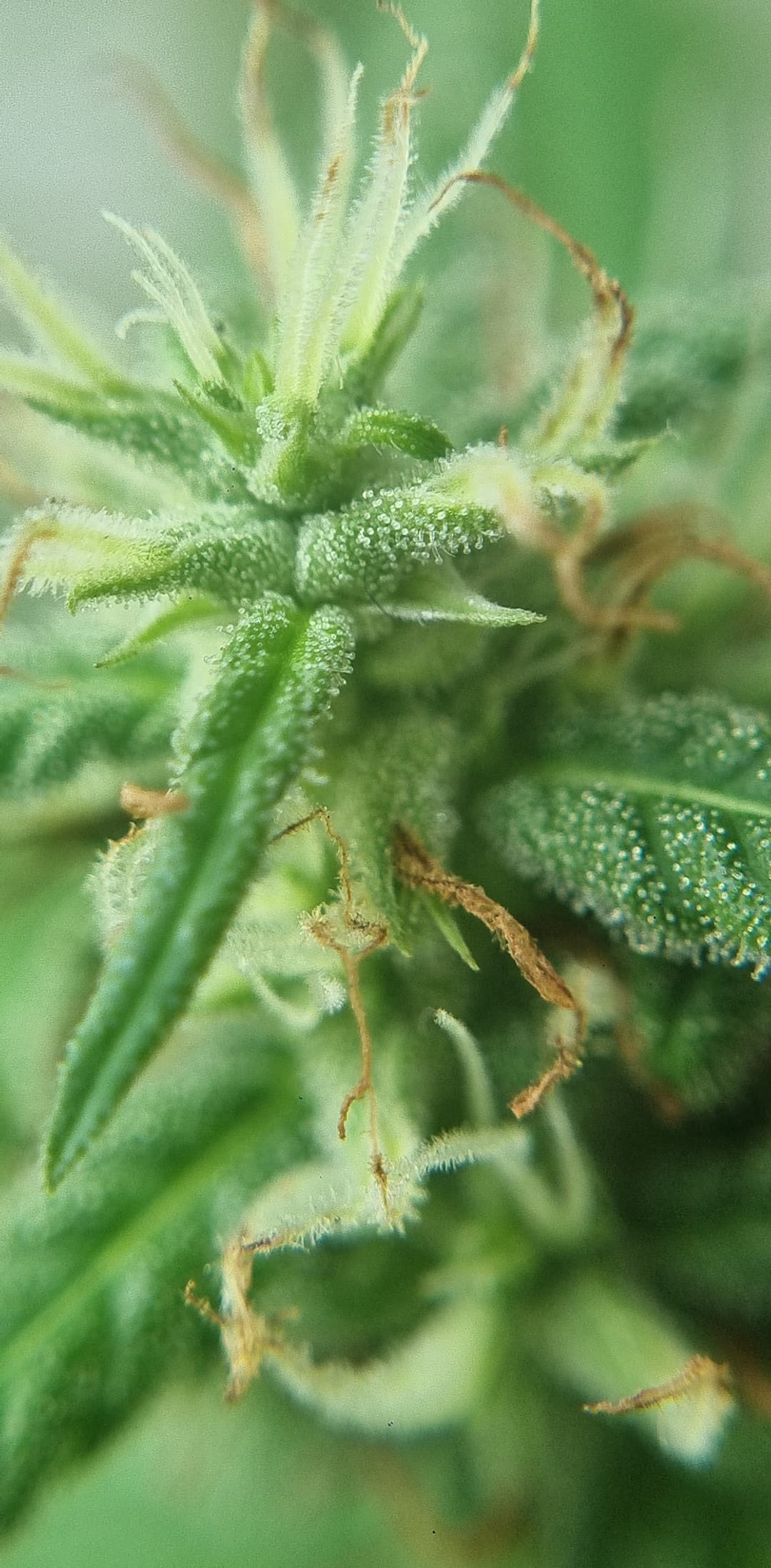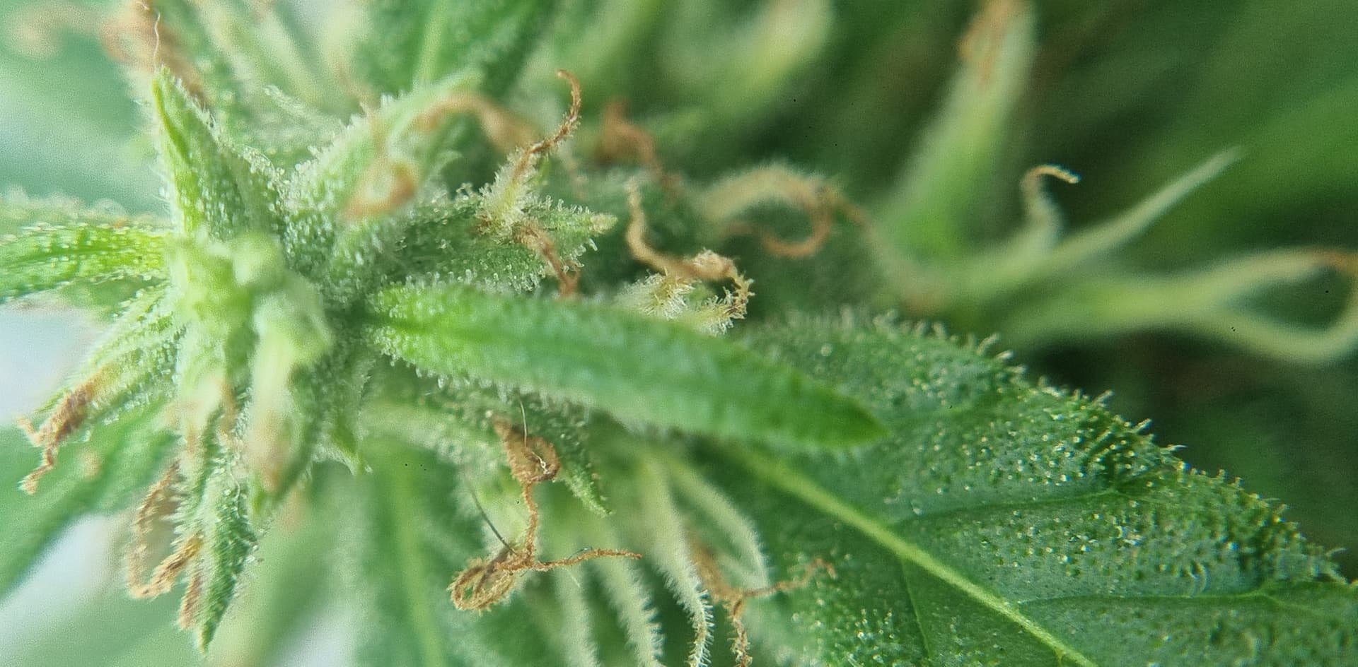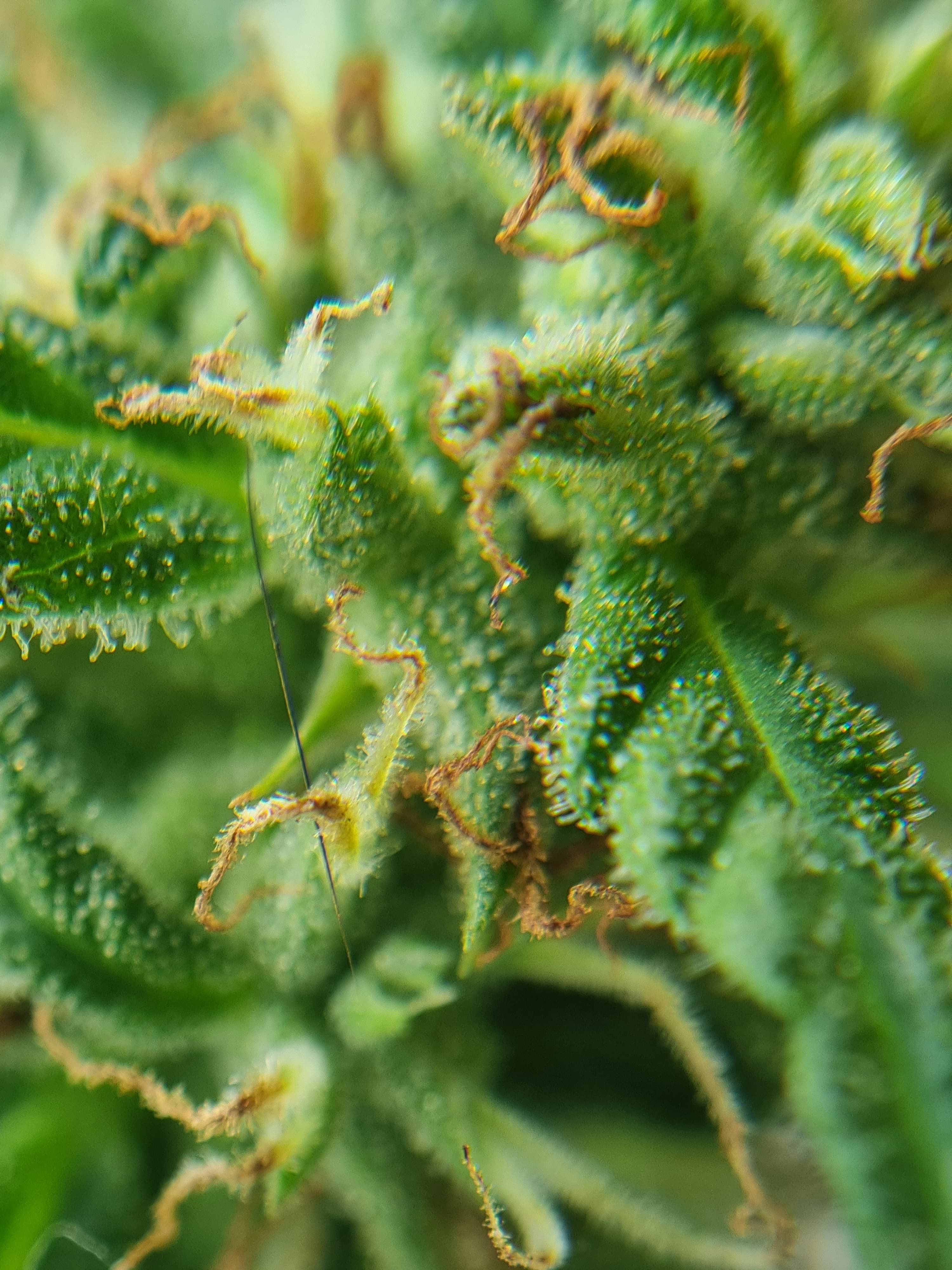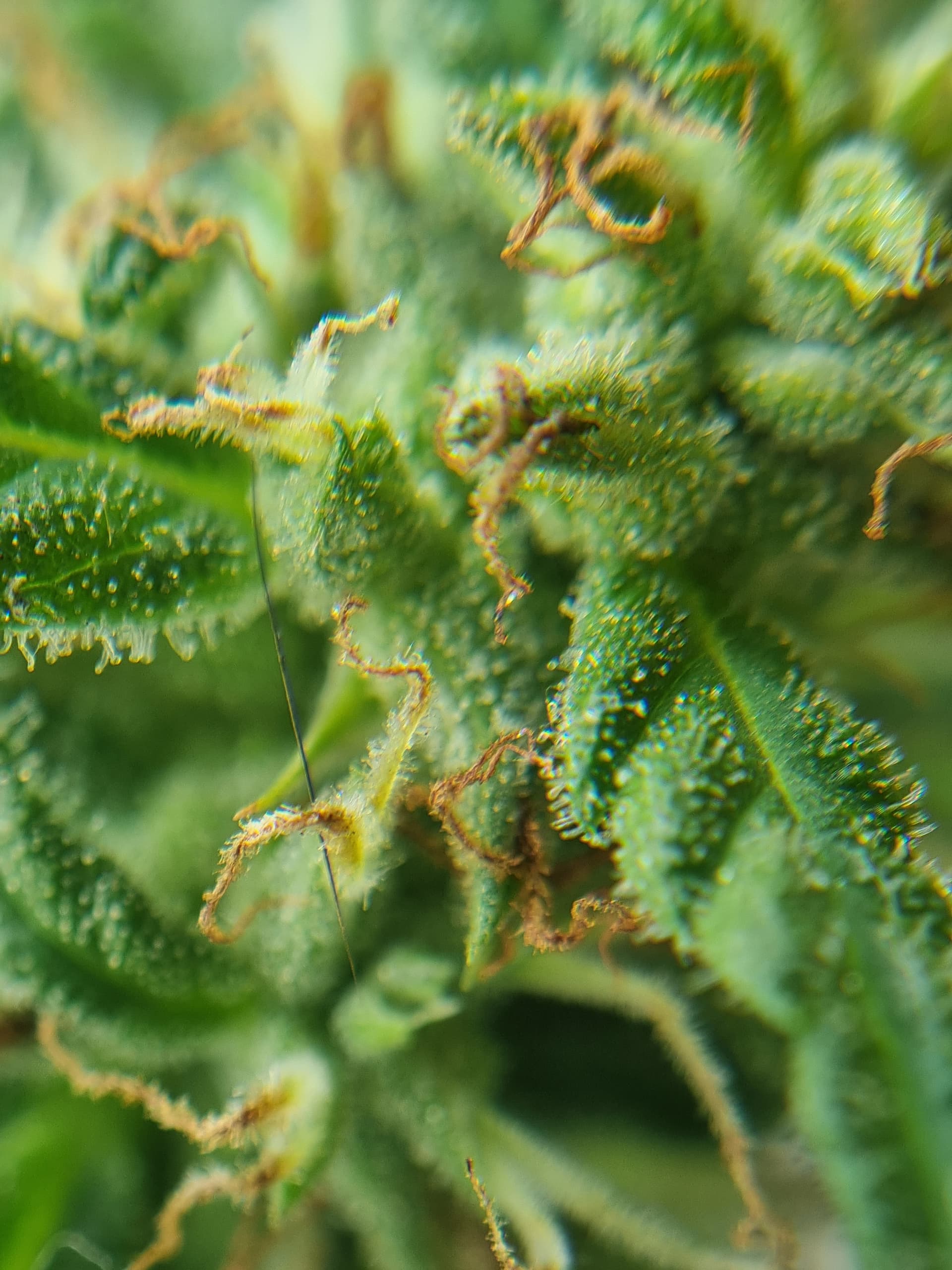 Esta es una vista a traves de una lupa y observo algunos tricomas amarillentos o ambar aunque son mas los blancos transparentosos