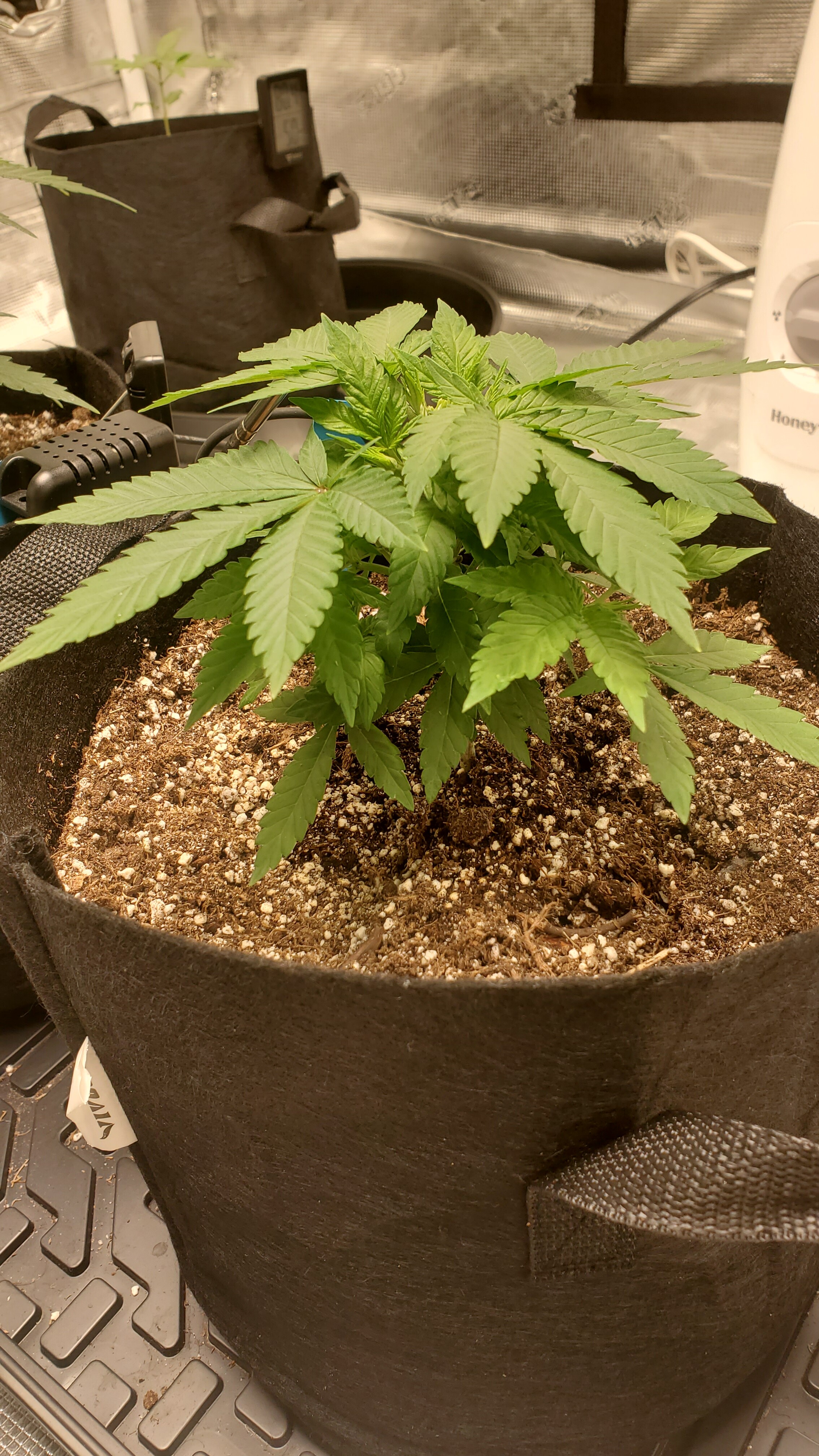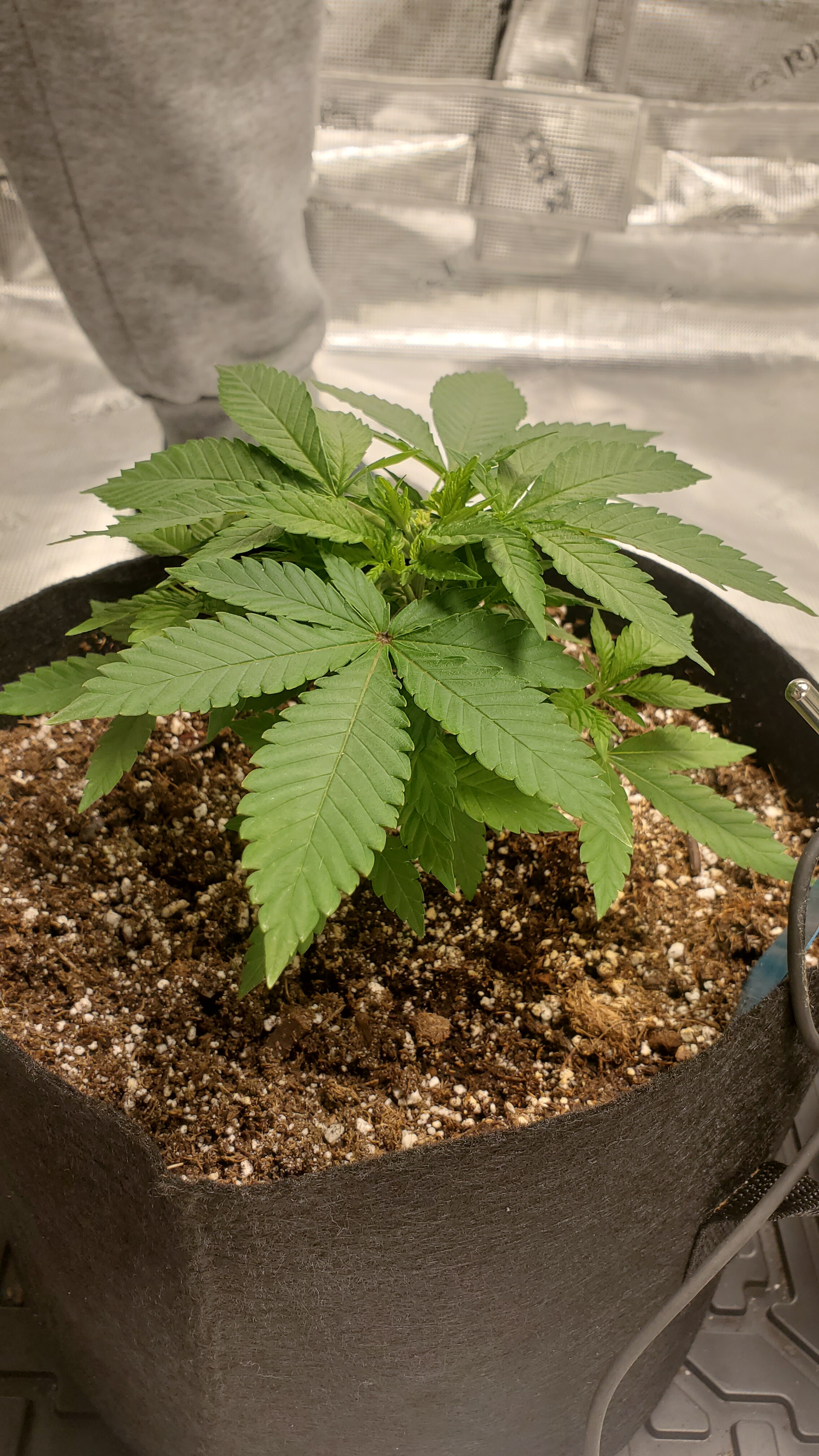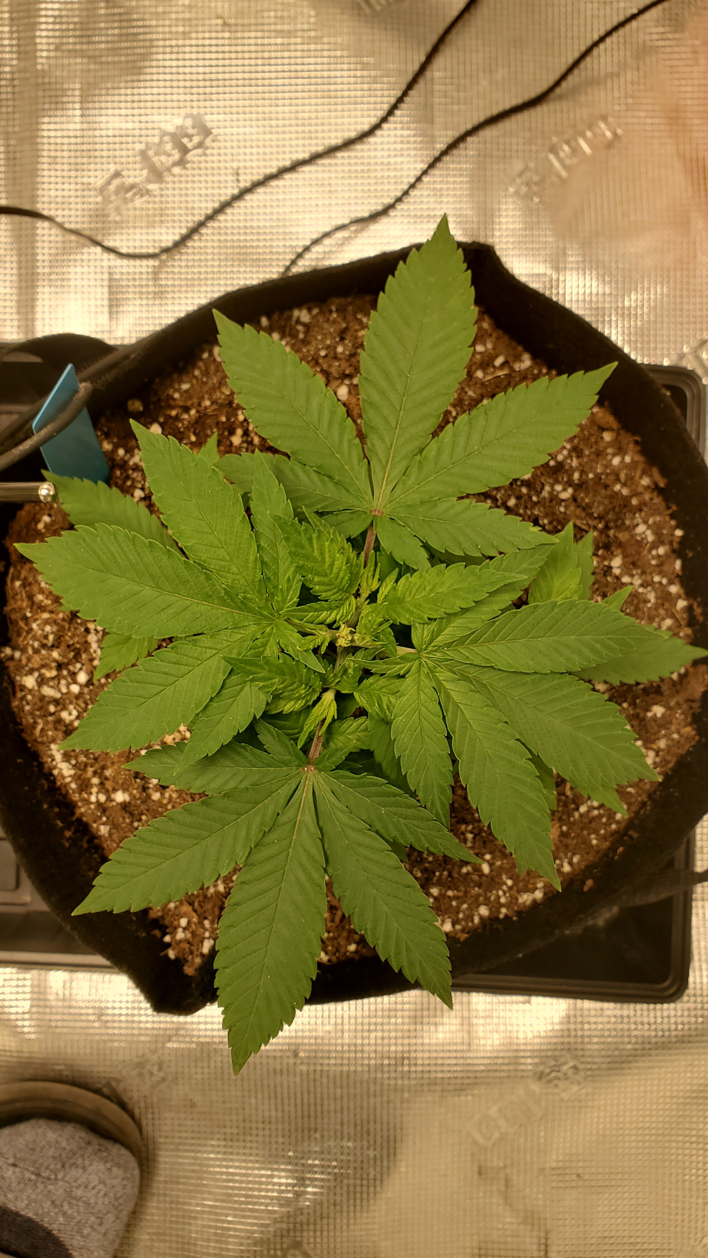 You’re doing good, nice setup but one Black Dog LED PhytoMAX-2 400 for 5x5 tent is not enough! You should add another one and hand them side by side. You’ll have a bigger yield this way because the light is more intense. Black Dog uses their PhytoMAX-2 1000 in 5x5 tent so you plenty of room to add more light. I’m using BudBox 4’x2.5’ tent and just switched from PhytoMAX-2 400 to PhytoMAX-3 8SP that uses same wattage 410w but outputs light equivalent to PhytoMAX-2 600. I’m in week 3 Veg under that light and it’s a bit smaller but noticably brighter. Black Dog LED is top in the industry right now so you’re doing great💪🏼