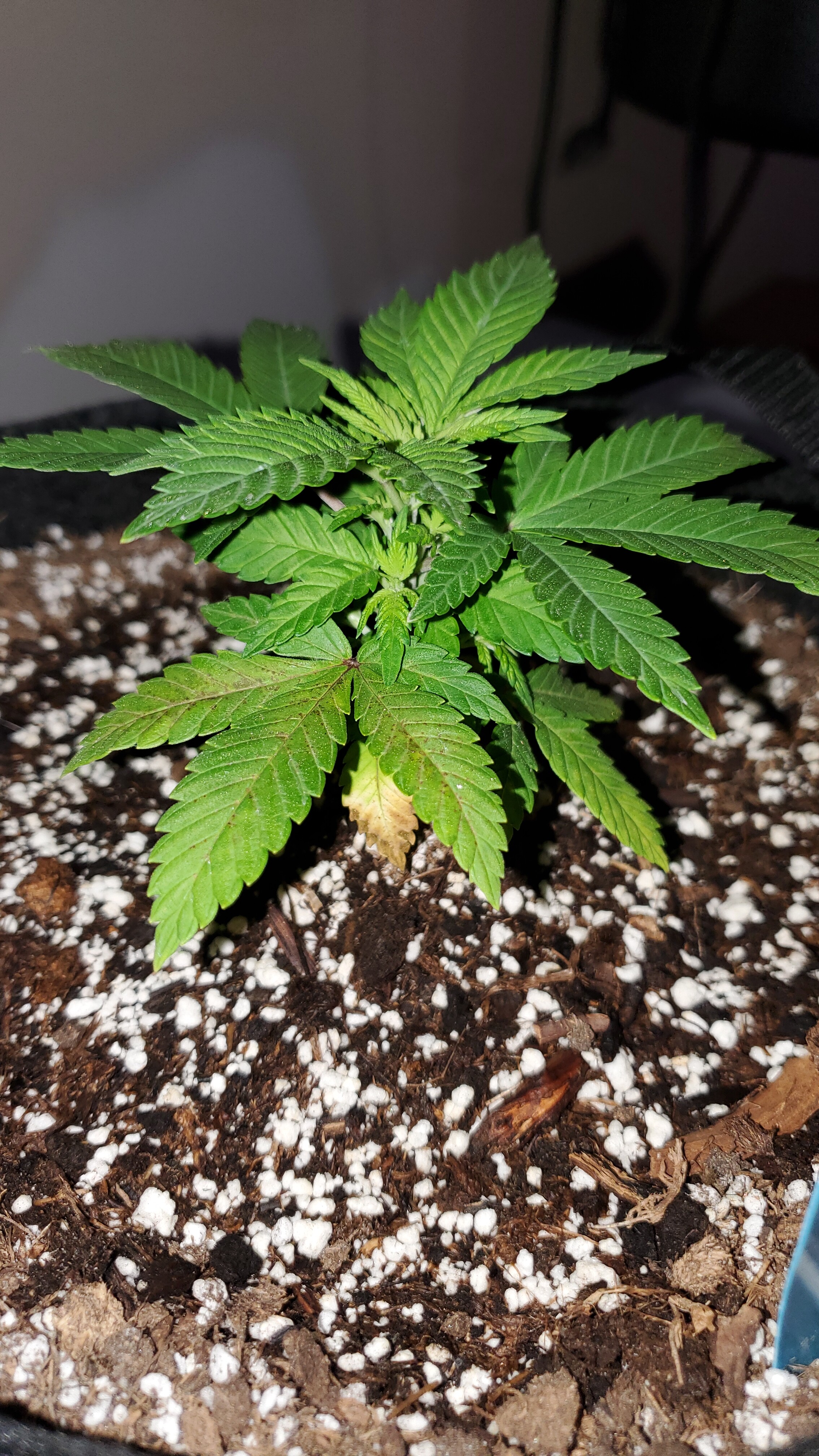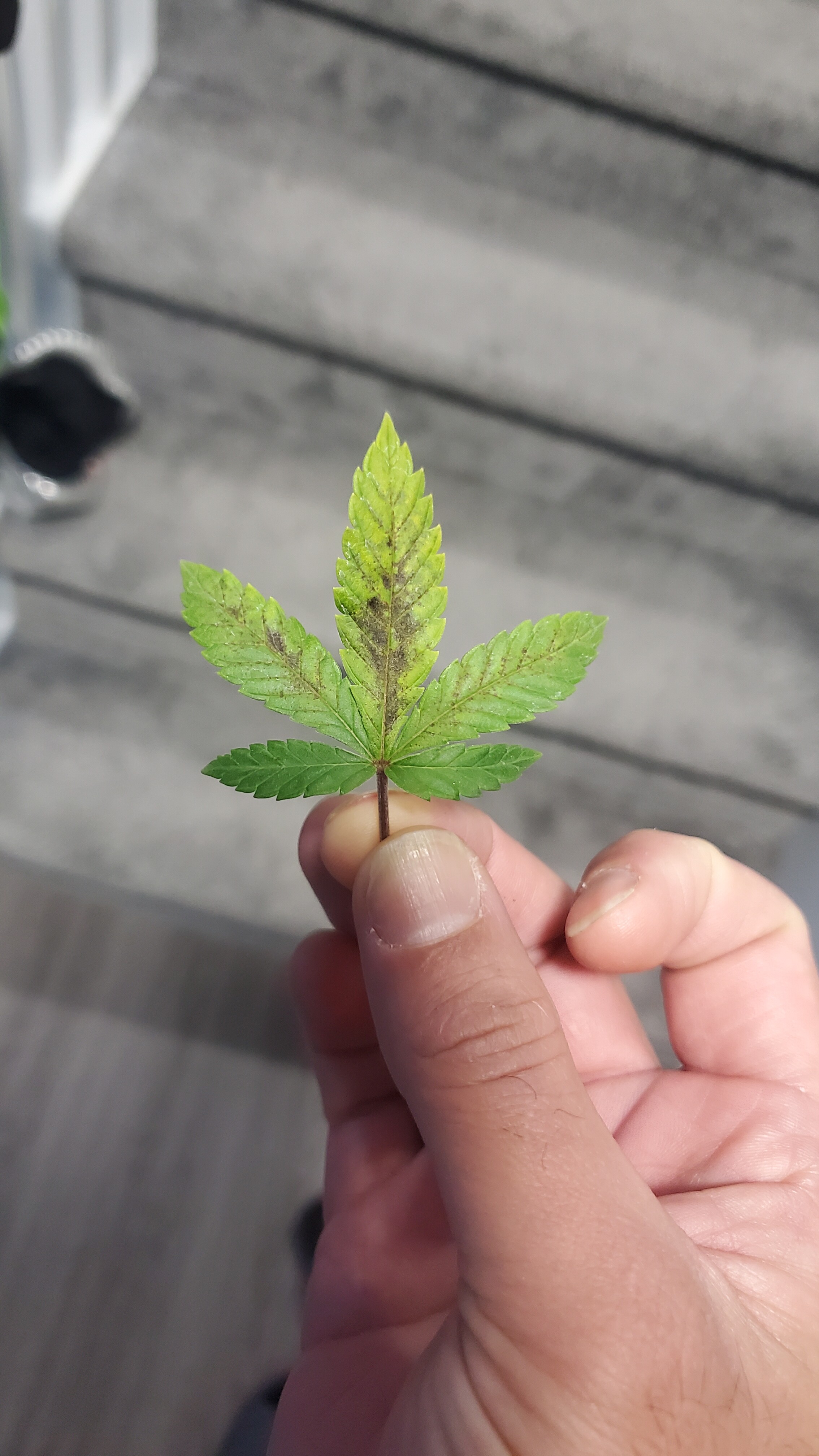 @voicelesspilot It doesn’t come off. I took another picture out of the tent and you can see a lower leaf that’s dying and then one more that’s in an earlier stage. I did some googleing and maybe phosphorus deficiency?
