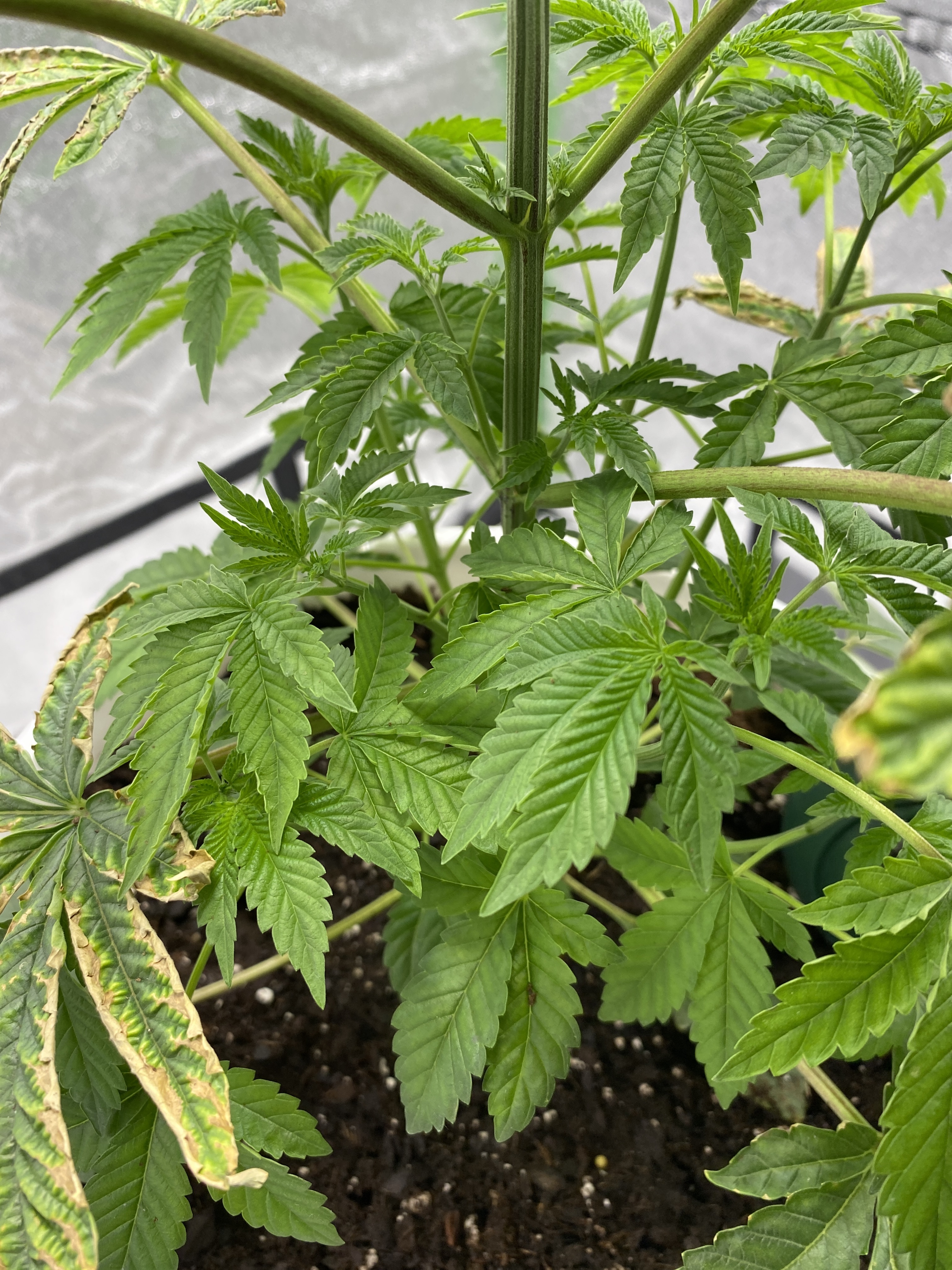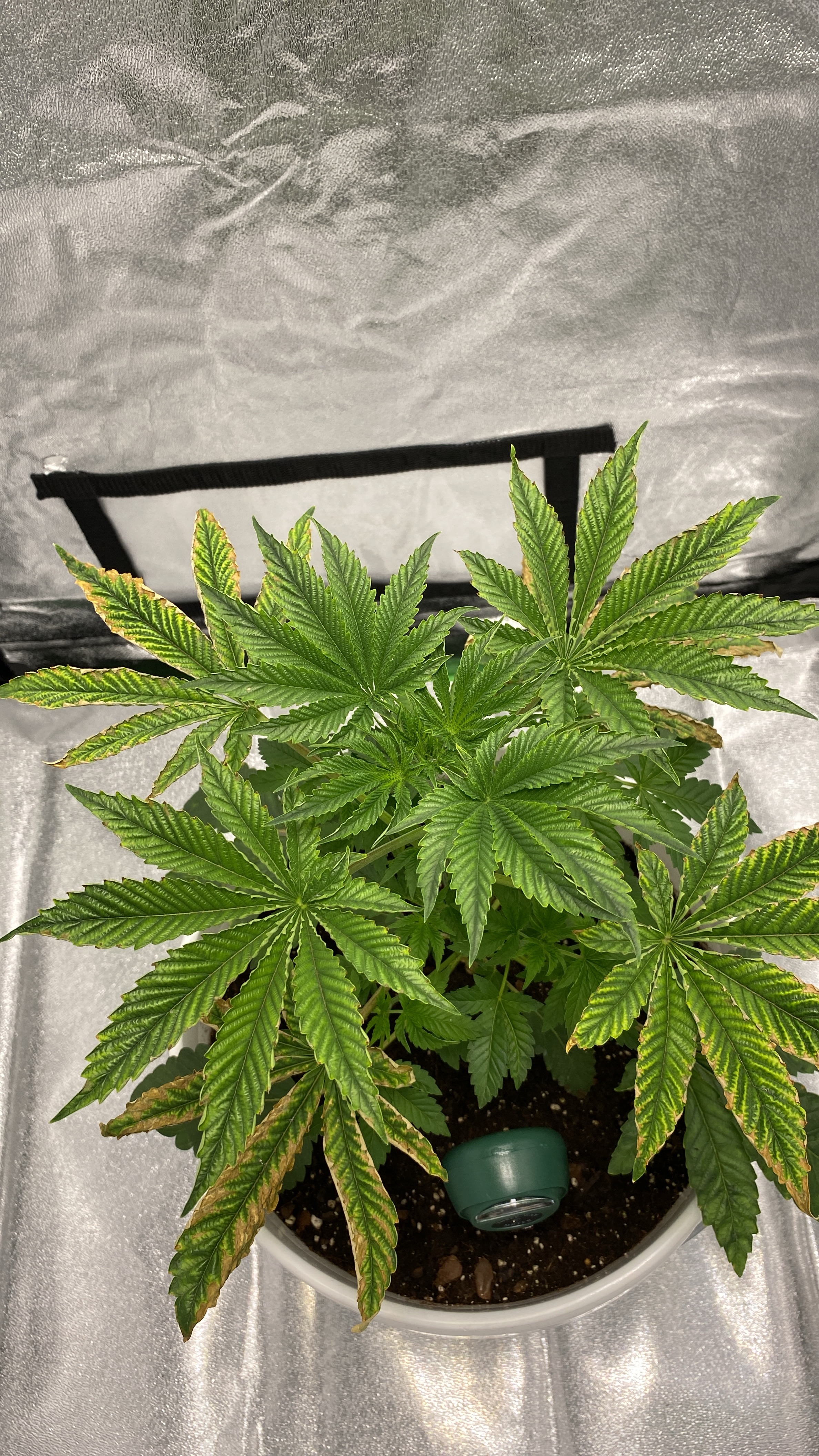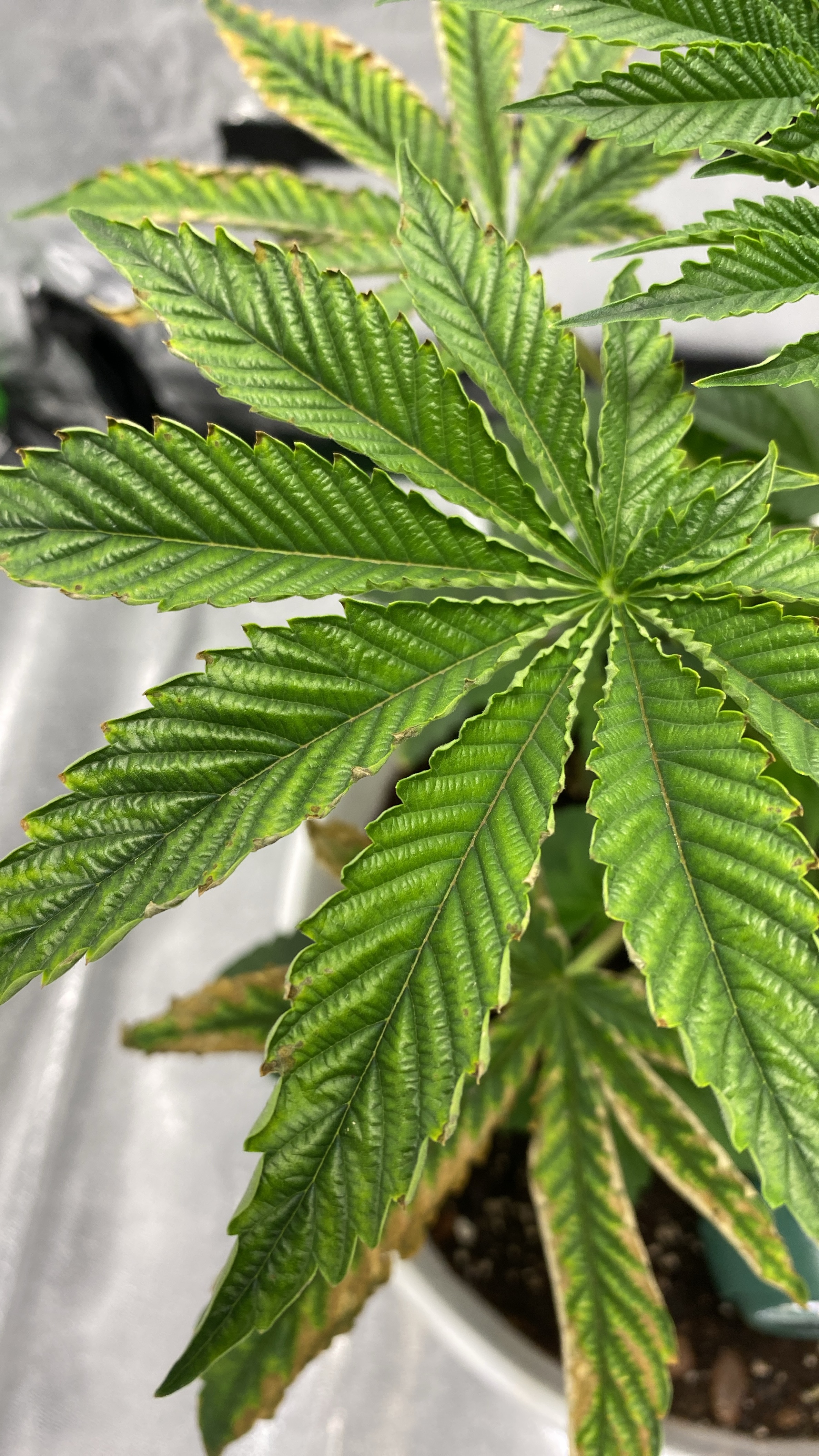 My plant is about 3 weeks into veg when the leaves started turning yellow, i thought it was a nitrogen deficiency but they started curling and turning “crisp”. All new growth growing from stems has yet to be affected