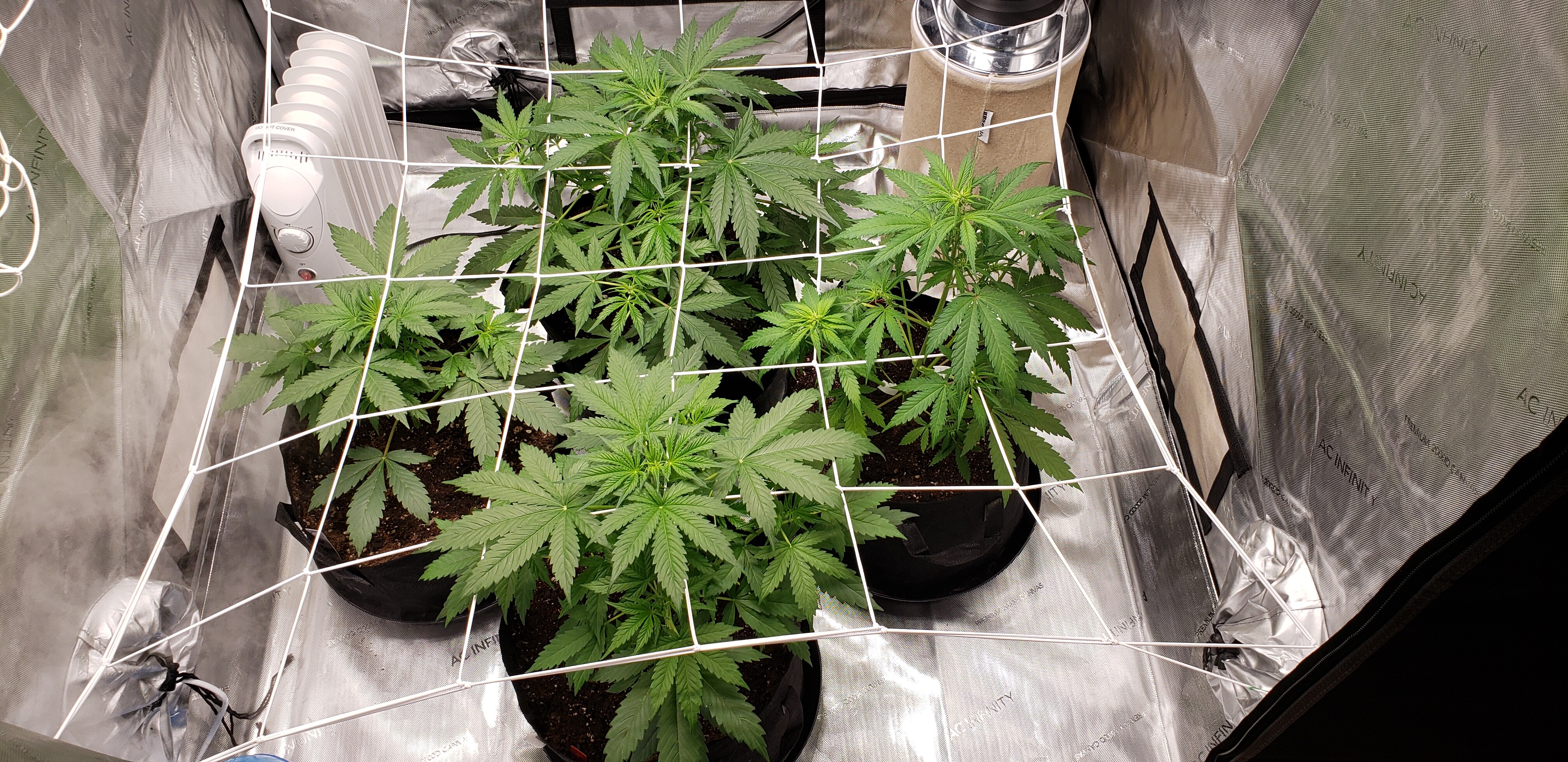 There was no scrog net in the previous tent so I doubt that, but something is wrong. Suddenly the plants are all drooping. Especially the one on the right. They were great for 6 weeks and now they’re struggling.