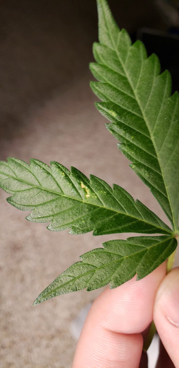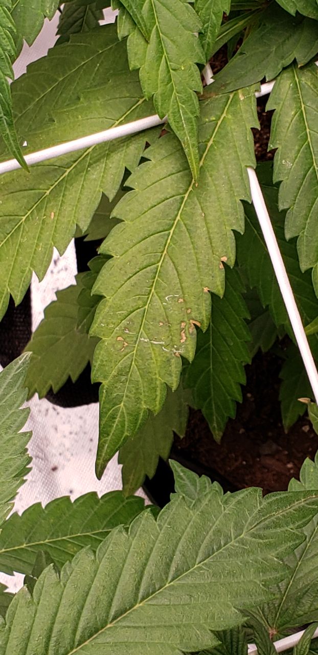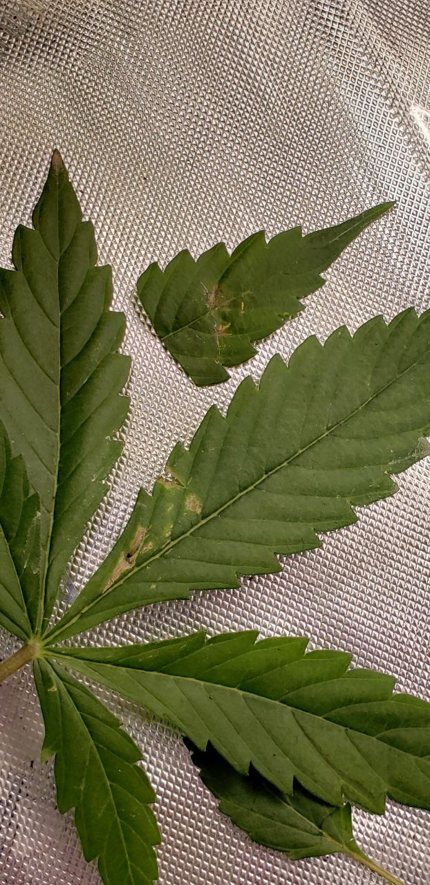 The only difference with this plant is that it was left in the veg tent because of space issues and it didn’t get overwatered (because it never looked sad/in bad shape). It also only got trifecta crop control, not either of the stronger sprays. Idt the sprays are related because I dim my lights before applying. So I doubt it’s burns caused by liquid on the leaves. It looks like either a tiny pest issue or viral/microbial/fungal issues but none of the marks or discolorations rub off.