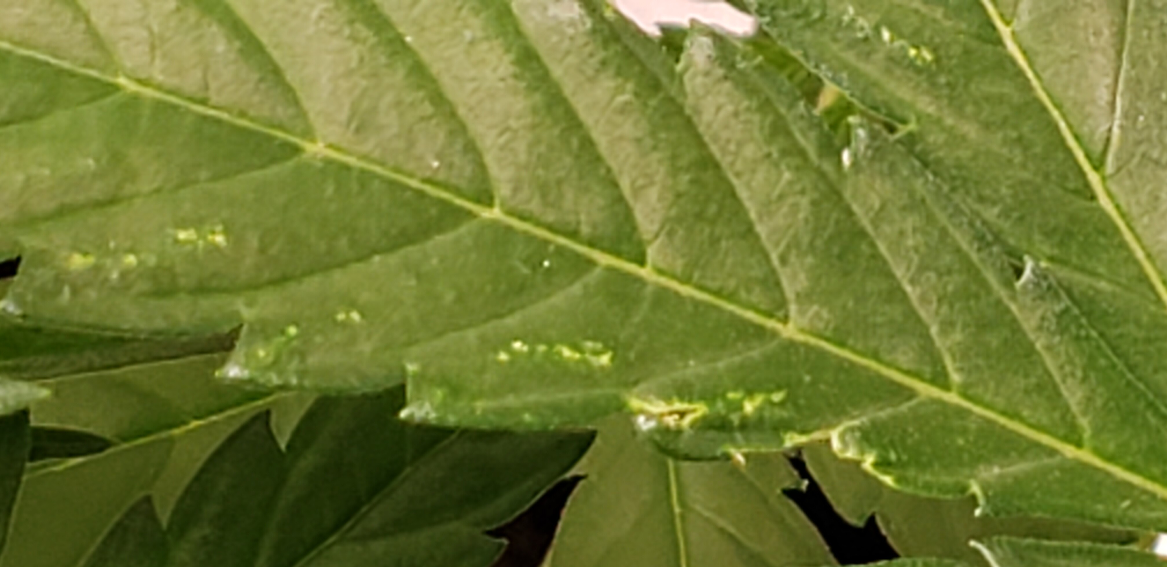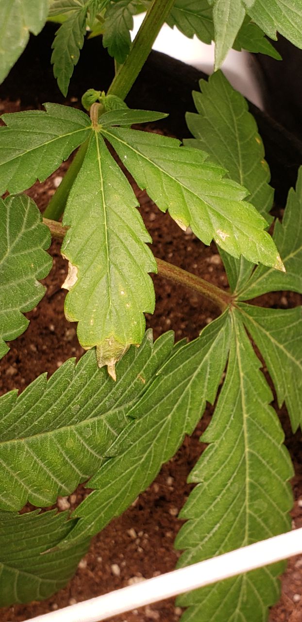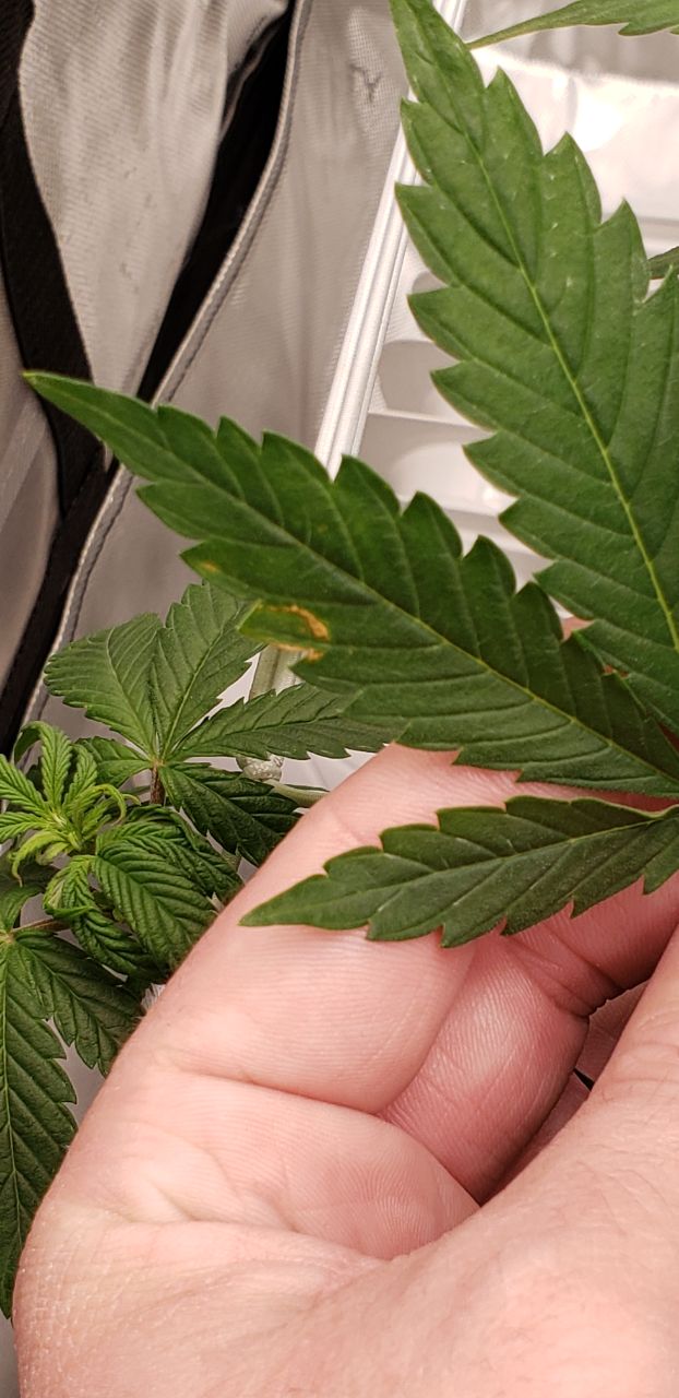 Probably worth noting this was the most robust plant of 5. Wasn’t the tallest but had massive growth. So for several weeks some leaves were resting on each other, allowing moisture to collect. I was worried about possible mold or fungi and so kept the clip fan blowing on high directly at the plants to combat it. I’m not certain these areas were the ones touching other leaves but I wonder if there could be a connection?