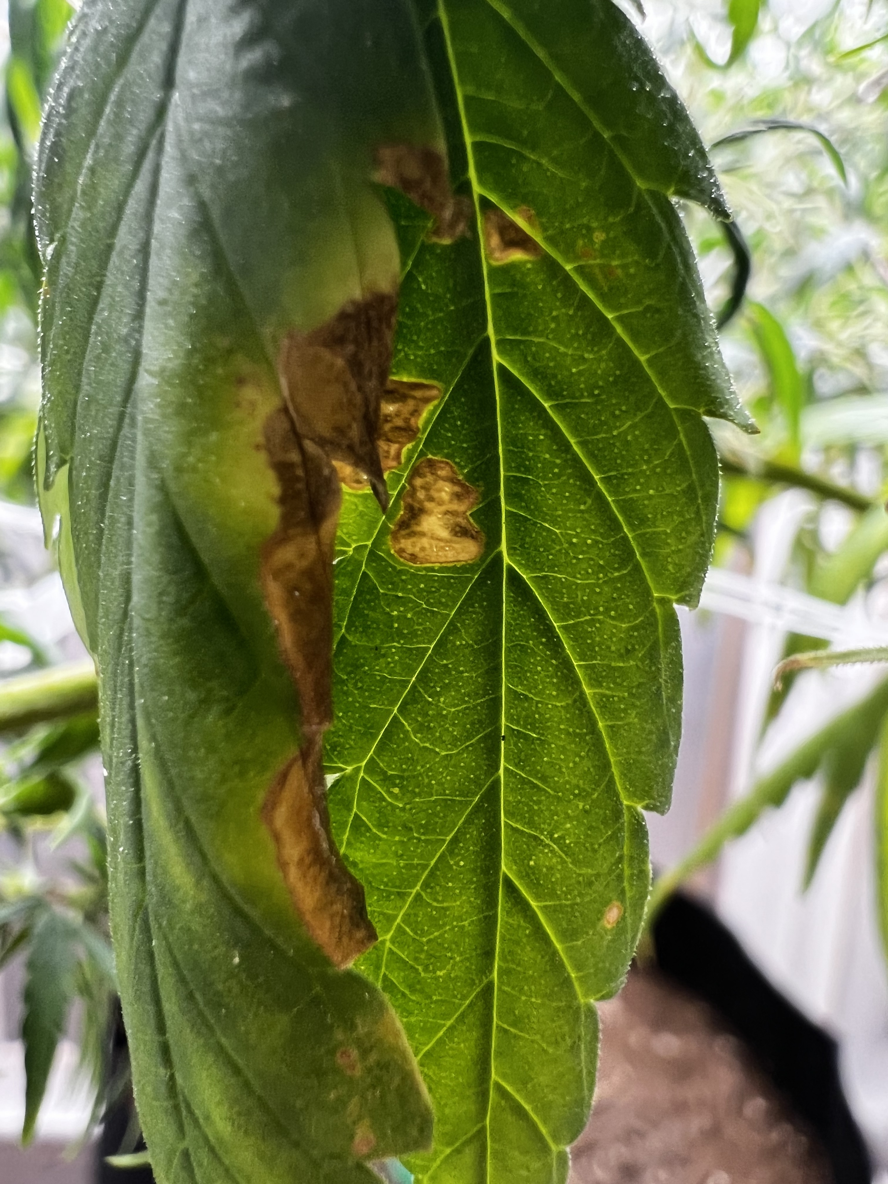 All was going well until I noticed brown patches on leaves and then a few days later clawed leaves. Tried flushing as it didn’t look like over watering but hasn’t helped. Watering every two days usually with approx 1 liter water. PH of water is 6.1 and soil show roughly same.