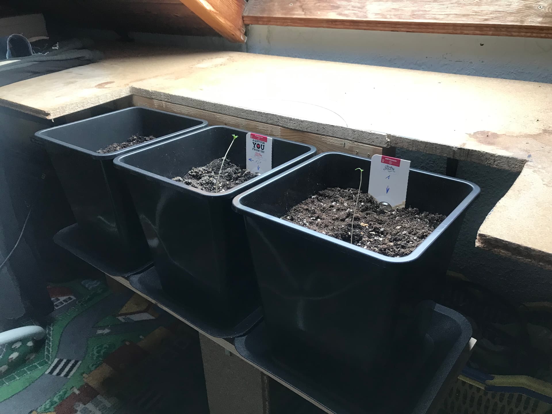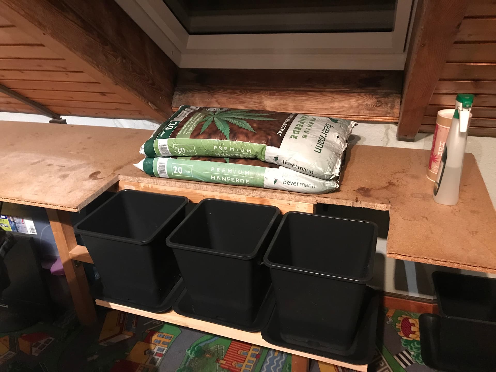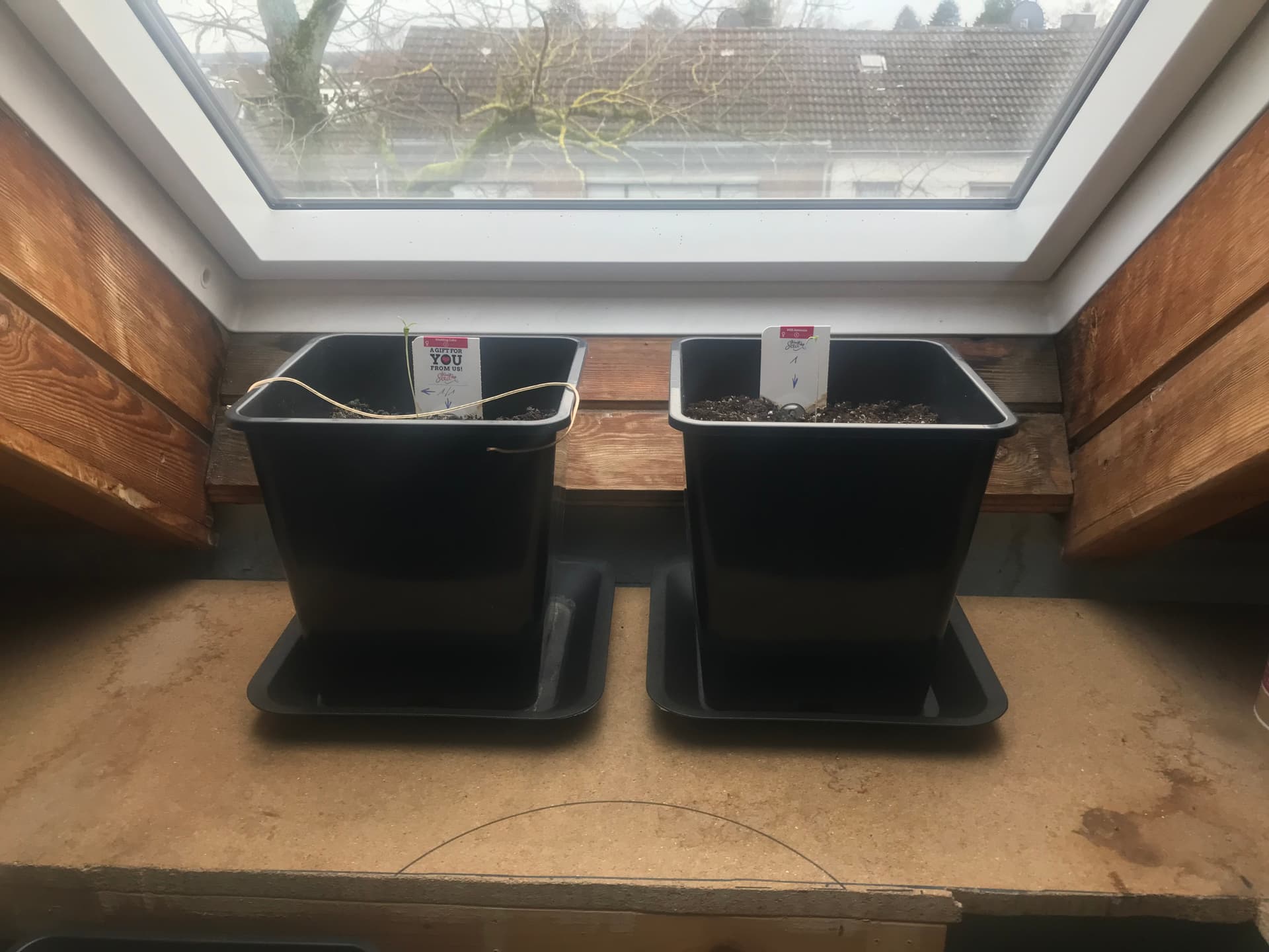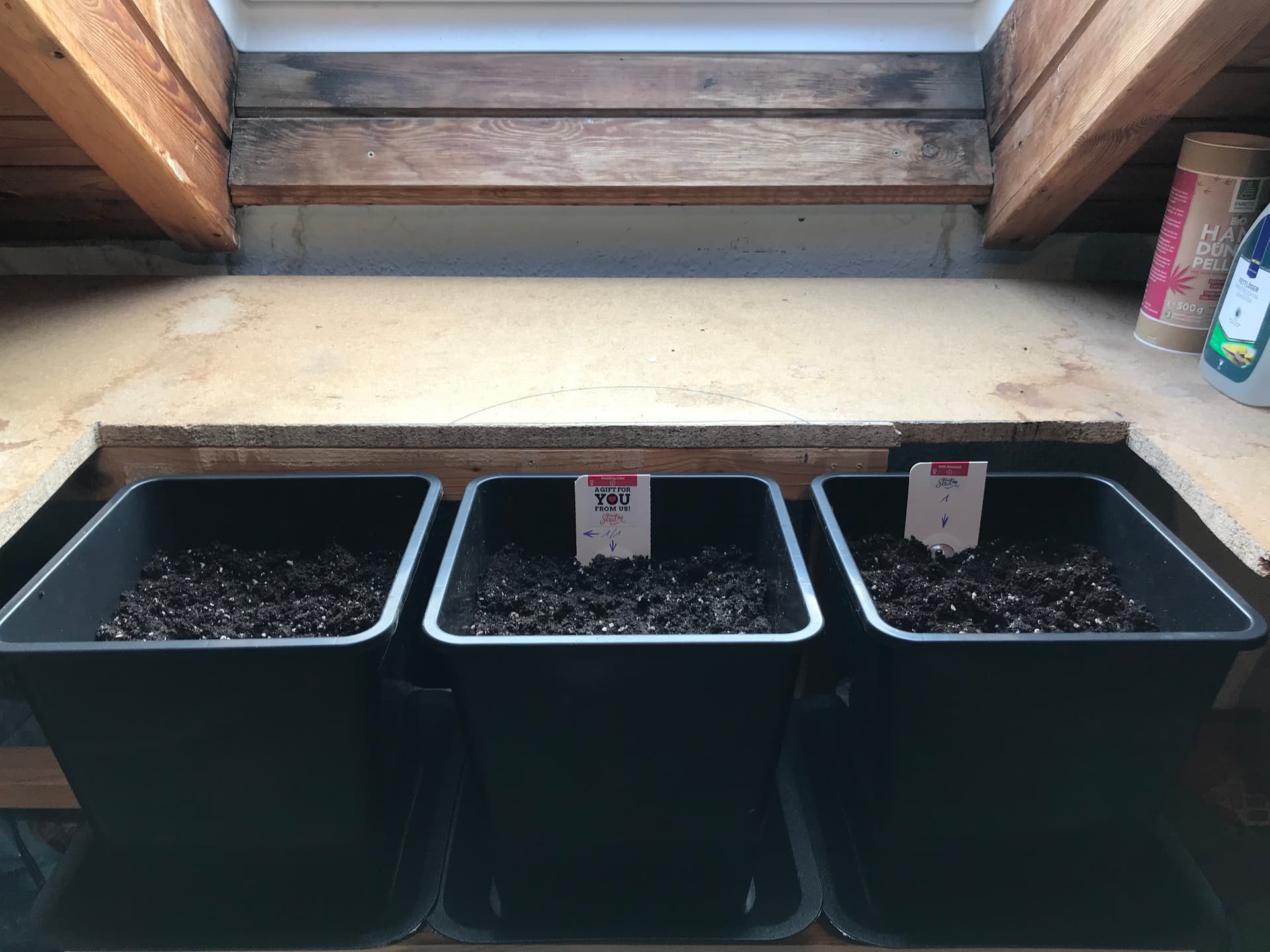 In absehbarer Zeit drei Pflanzen in je einem 11Liter-Topf, jetzt im Winter am Dachfenster.