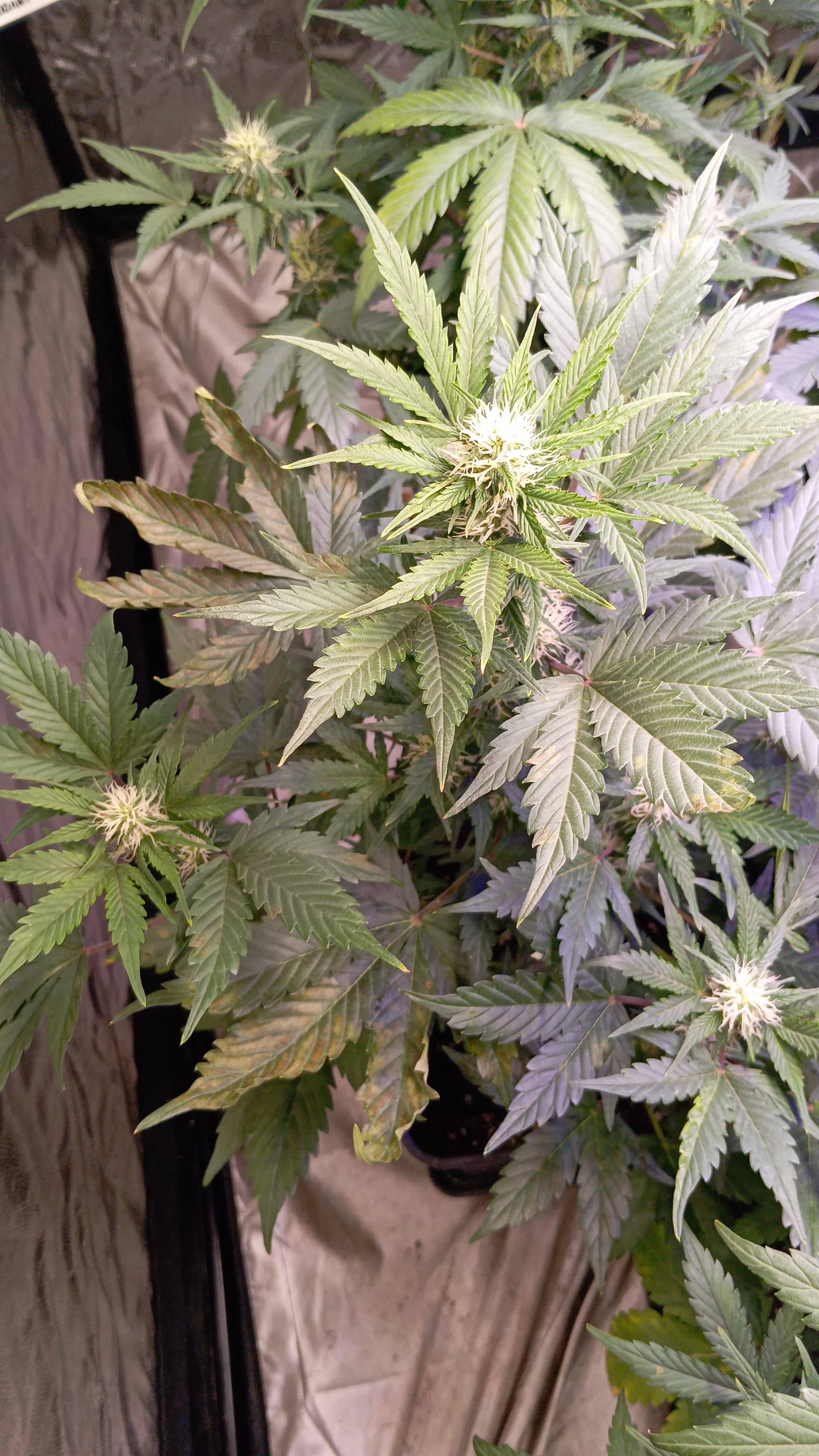 Creo que quizás el problema puede estar relacionado con una deficiencia de nutrientes, probablemente magnesio o potasio. Las áreas amarillas con bordes secos en las hojas inferiores son signos típicos de una carencia de magnesio, mientras que los bordes quemados podrían indicar también una deficiencia de potasio, algo común en esta etapa de floración si no se está aportando lo necesario.