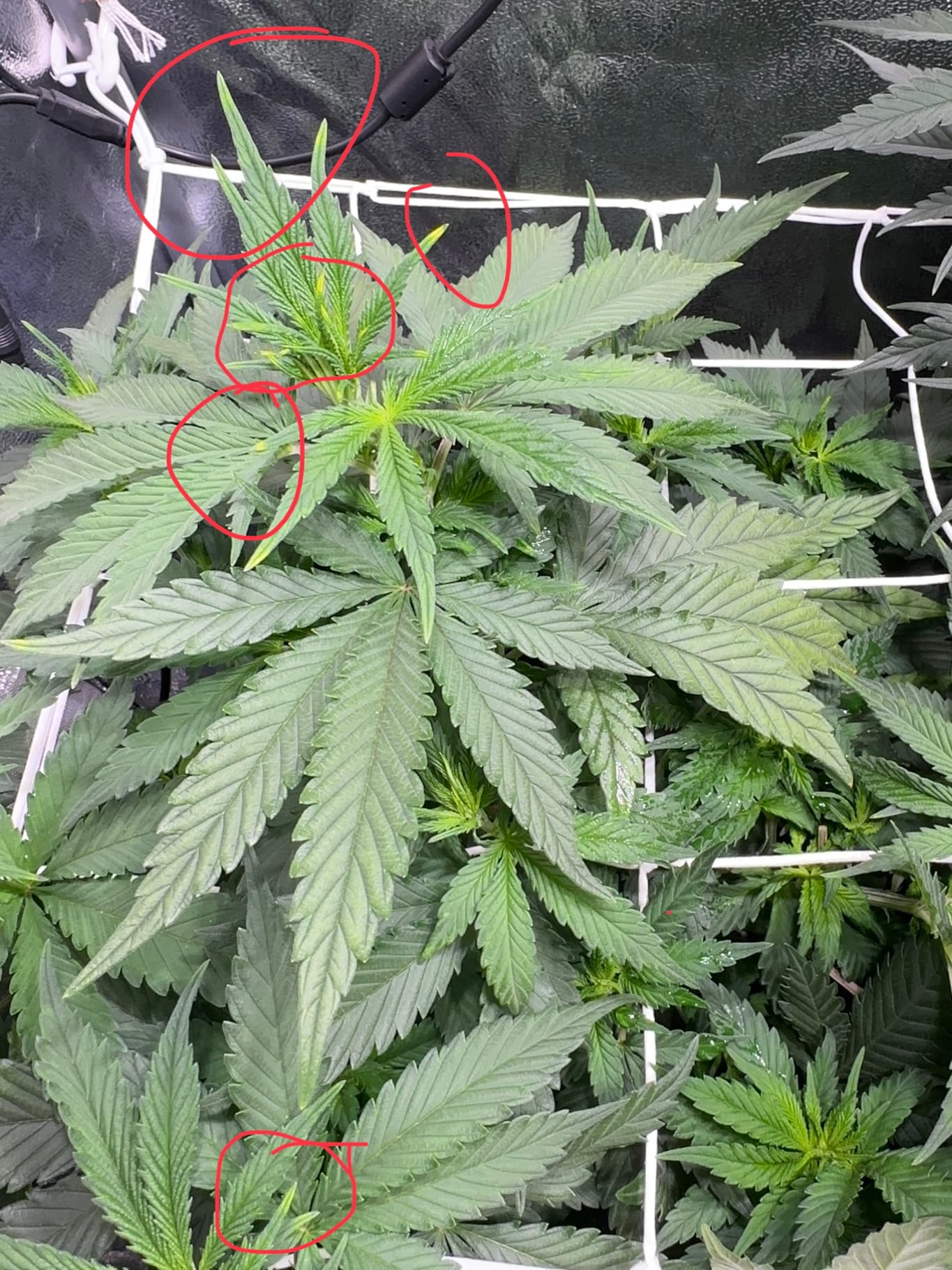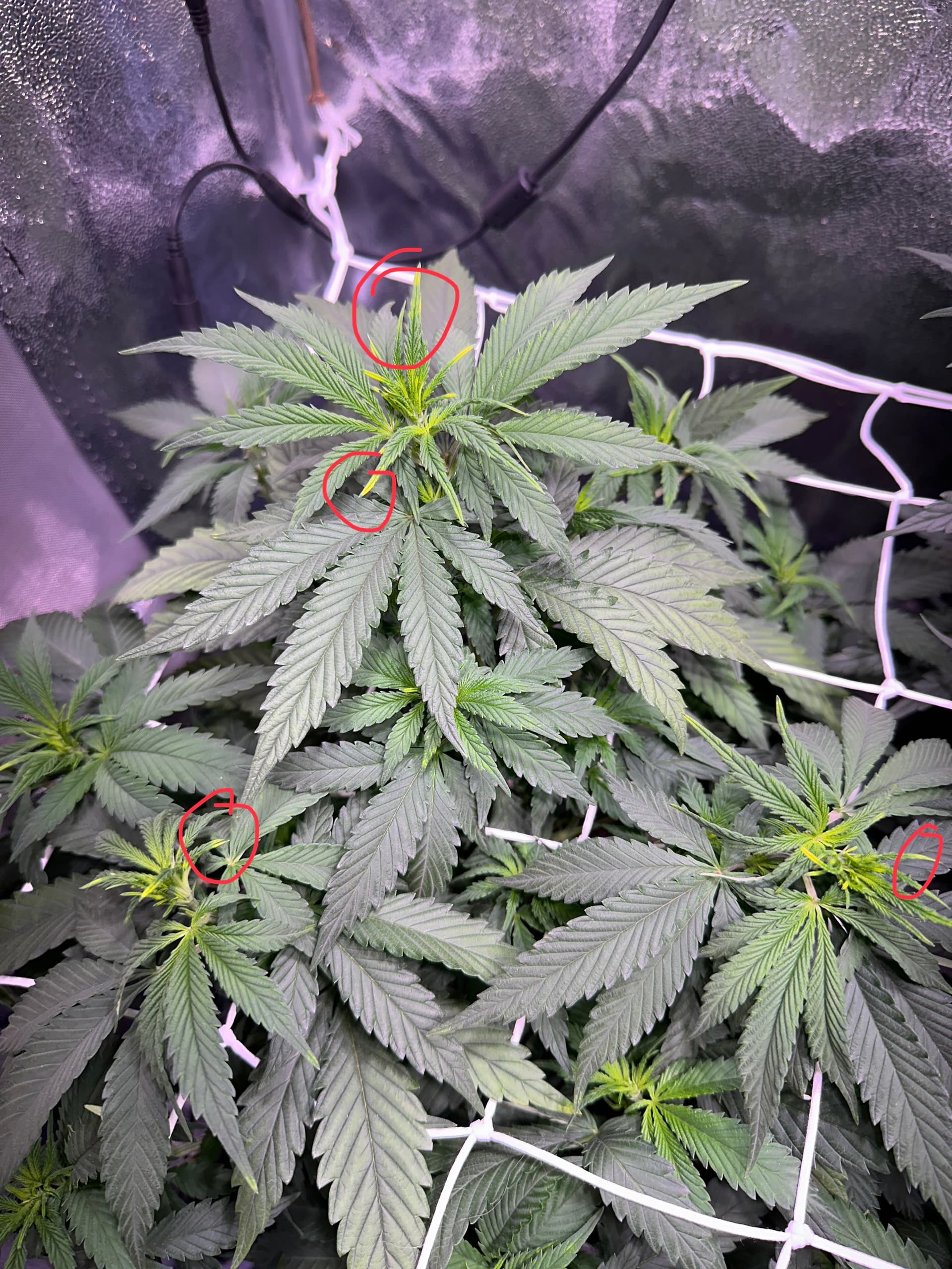 This is a Purple punch in soil, in its 6. week of veg. Been using Advanced nutritions, as adviced, and suddenly this discoloration appeared on the new springs. I think it’s lacking nitrogen, but I’m not sure. Can anyone help me out,please😊