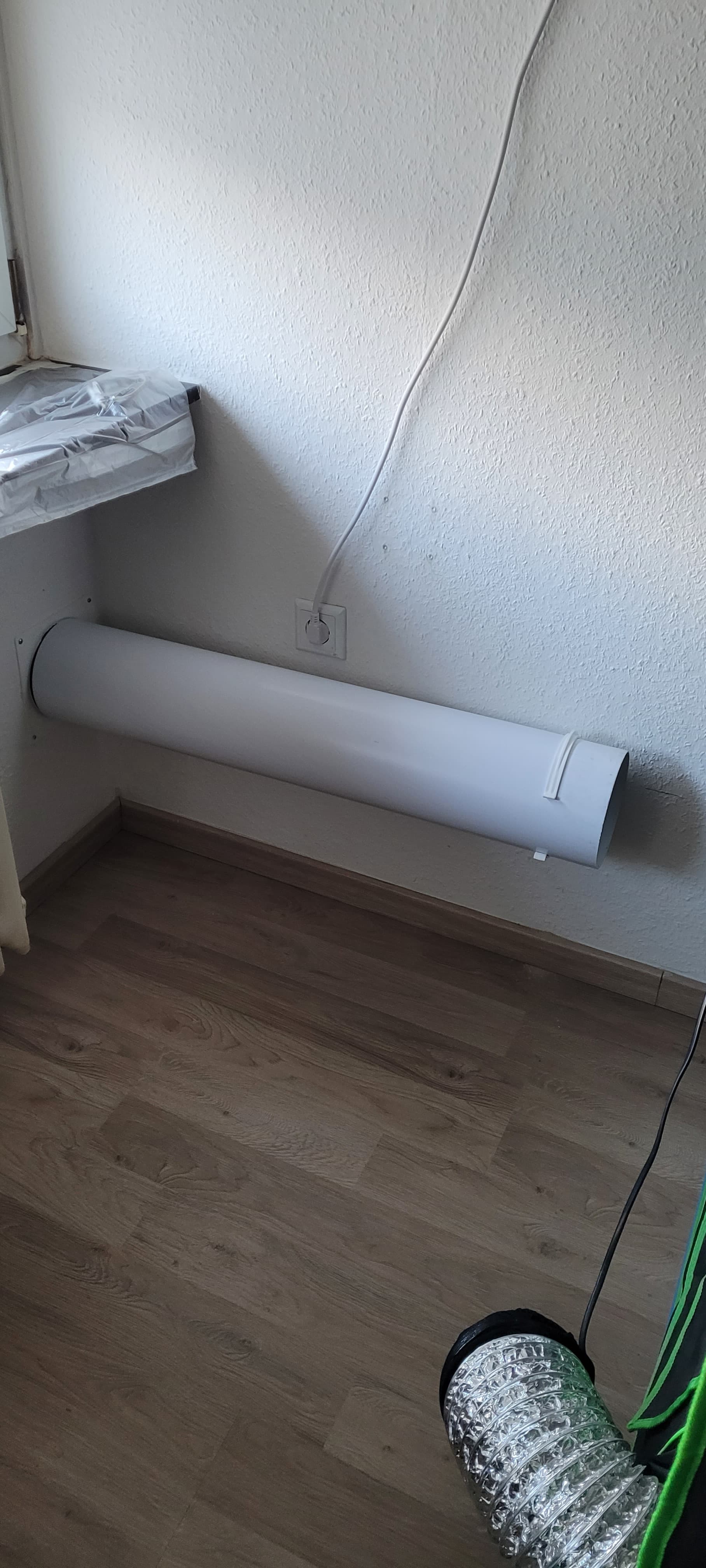 Das Holz am Fenster muss noch geschliffen werden , will das weiß lackieren . Dann schöne Rollläden dran damit man von außen nicht mehr rein gaffen kann . Jo und mit der Abluftleitung ging es denn gestern auch weiter , die ersten 2 mtr von der Wand in Richtung Motor sind fertig .