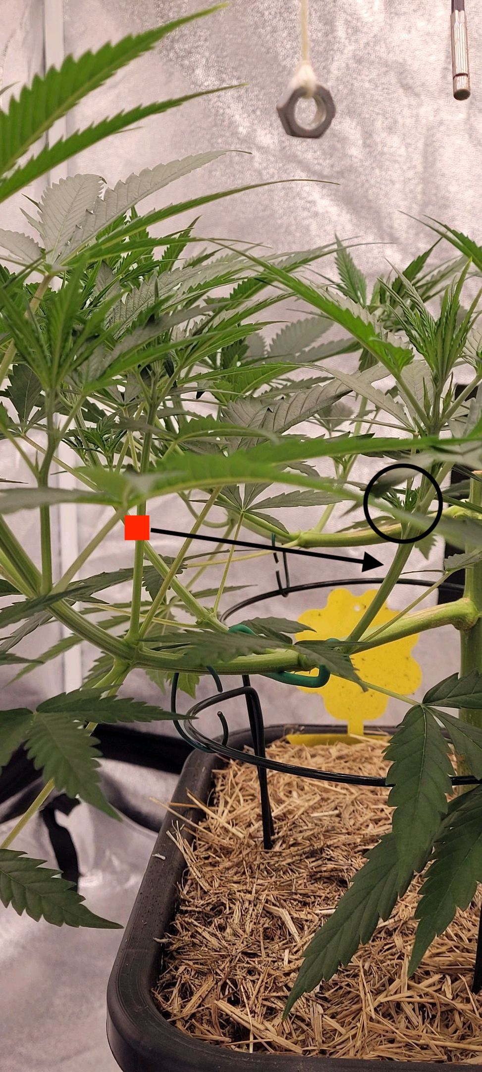 Beispiel: "diese Seitentriebe noch nach unten, damit dann der obere im Kreis markierte Trieb noch nach oben geht, bis dahin haben sich die gefimmten Triebe auch erholt und es kann endlich nach oben gehen, wenn es Pompi’ös werden soll
