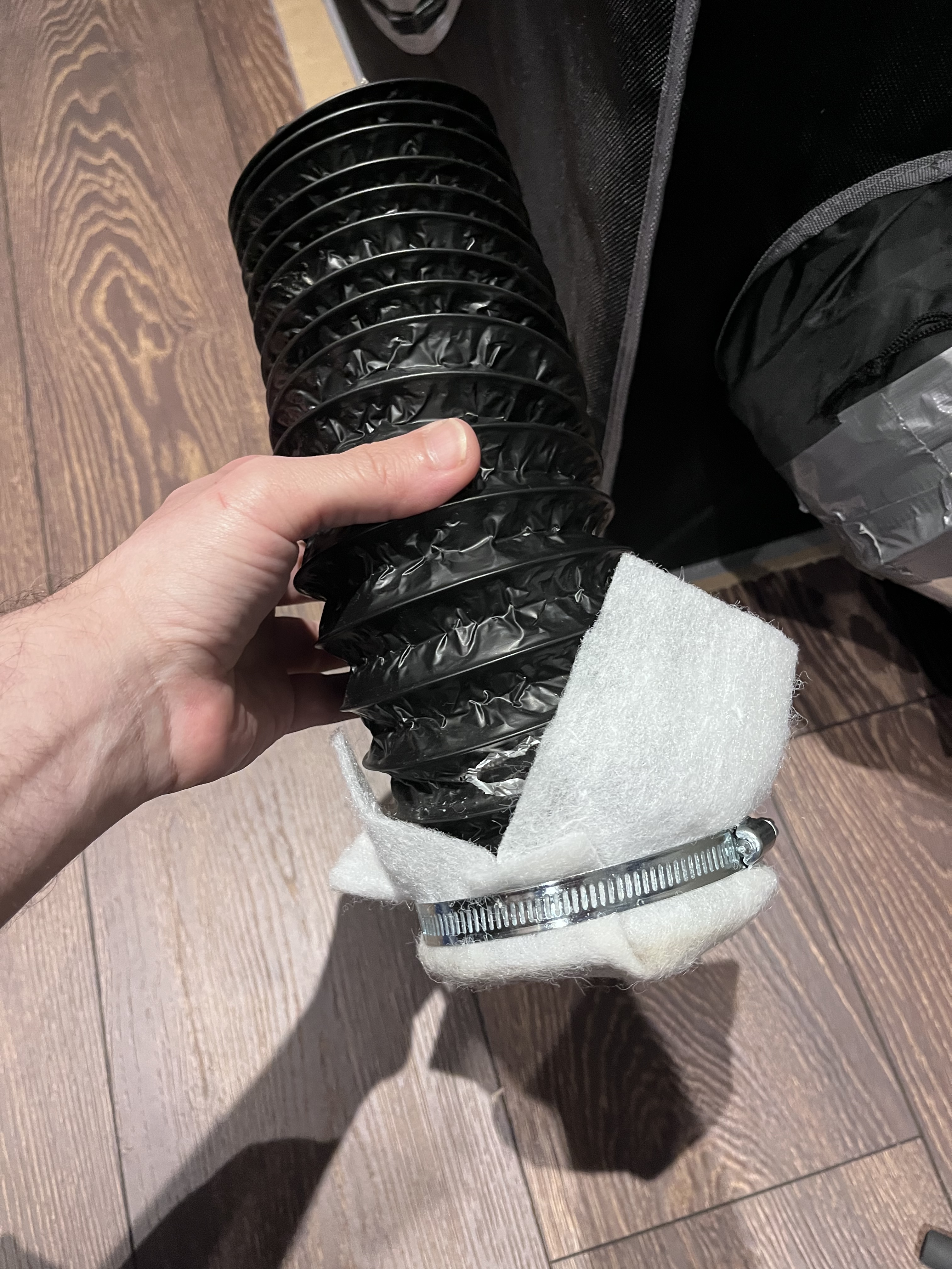 I previously had 4 inch ducting with a filter on it, entering the tent on each side. This was working OK, however, I had an insane amount of negative pressure in the tent.
