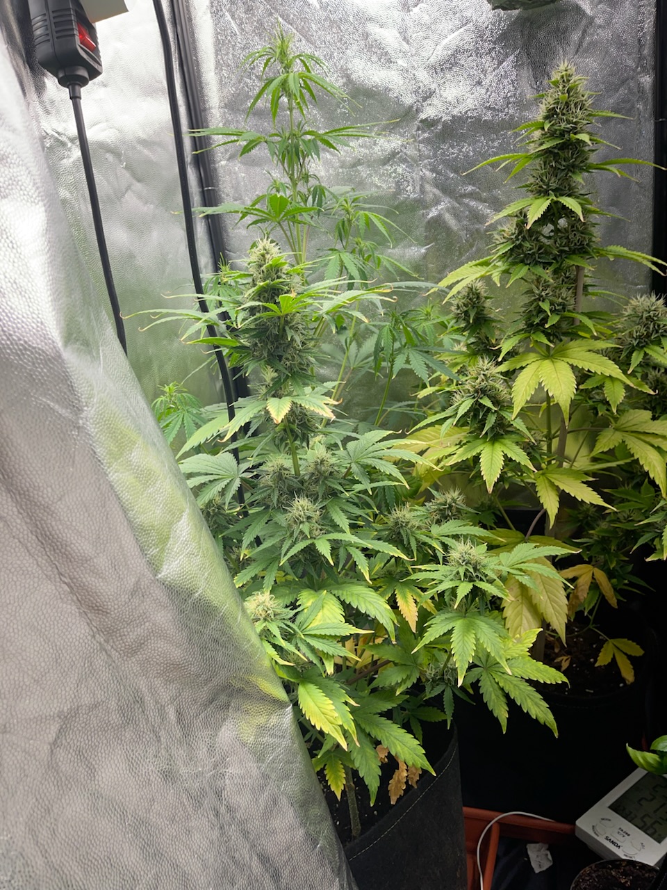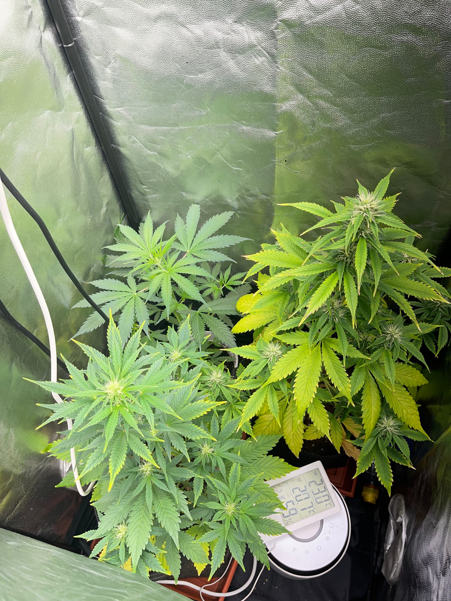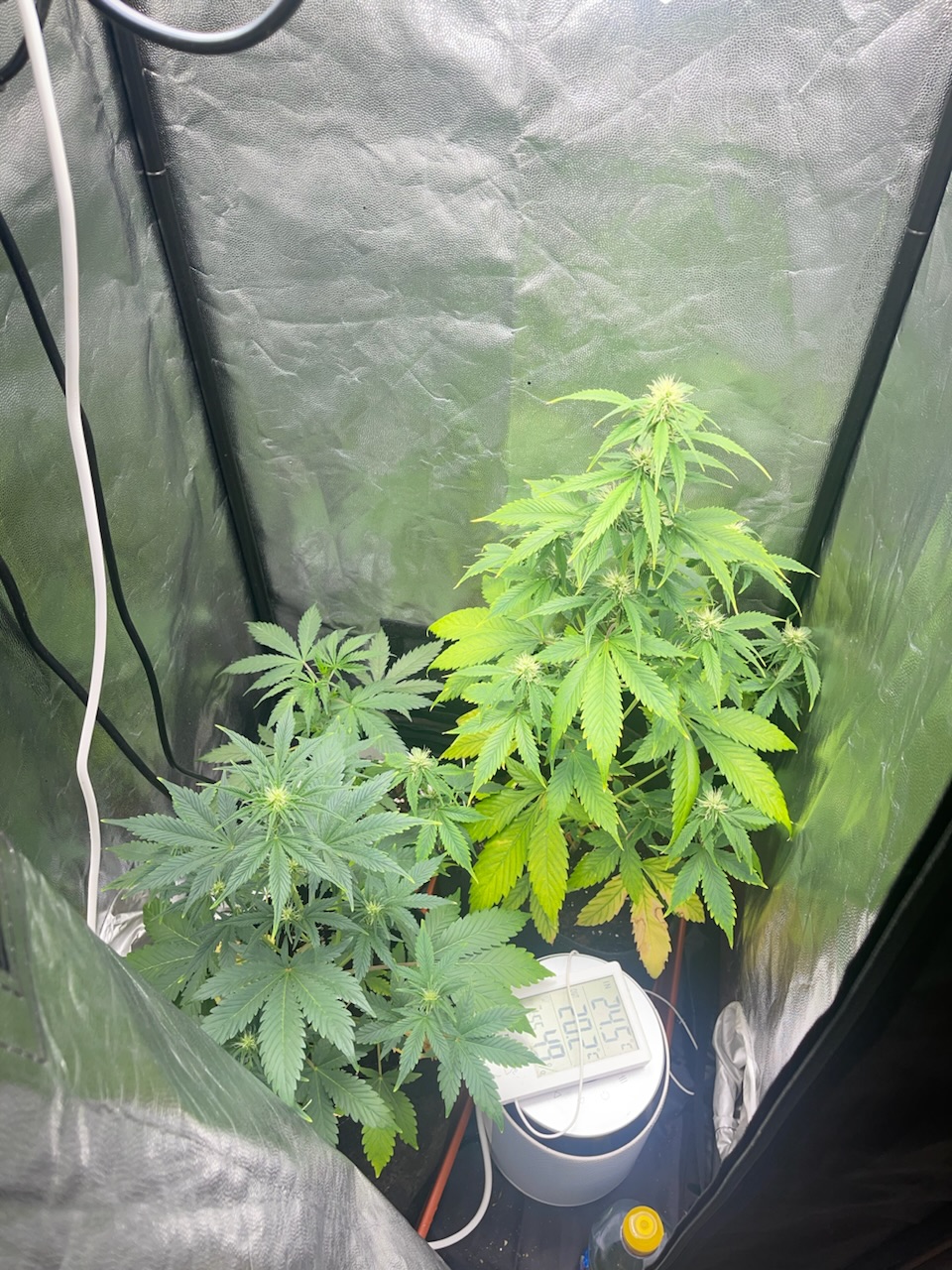 No consigo aclarar que puede estará pasando dudo que se exceso de nutrientes pues estoy usando todo biológico de rqs los potencia dores de floración y sus pastillas de rqs para floración y veg, también usa de vez en cuando cannazim y ahora en floración candy bud de advanced nutrients, which vivamente espaciados y no todo a la vez.( pero todo puede ser)
