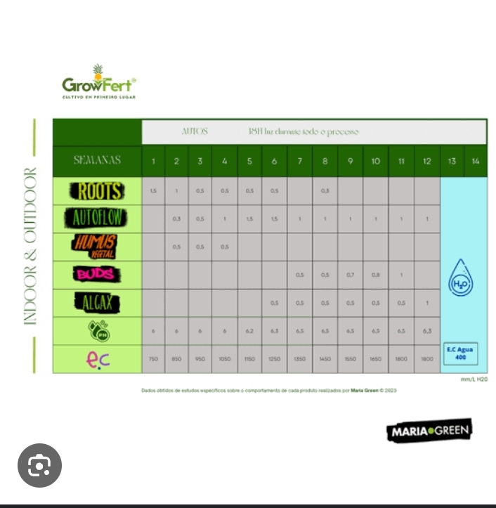 The easiest thing to start is to buy algae plagron grow, power root plagron and algae bloom. Also an organic acid to lower the pH which is Lemon kick from Plagron and follow a nutrient table with this everything will go great for you, always calculate the pH at 6.0 as seen here piss yellow color. and follow a table of nutrients that if you grow outdoors with these 3 is perfect for you. If you don’t want to spend so much money and start with the power root, always agree to half the doses recommended by the merchant, the power root from the first week, 1 ml, works well. and after 15 days he starts to add 1ml grow algae to L and until they do not bloom and he removes the grow and gives it bloom until you see that the hairs have folded and turned brown and then he gives it 1-2 weeks only water and ph.