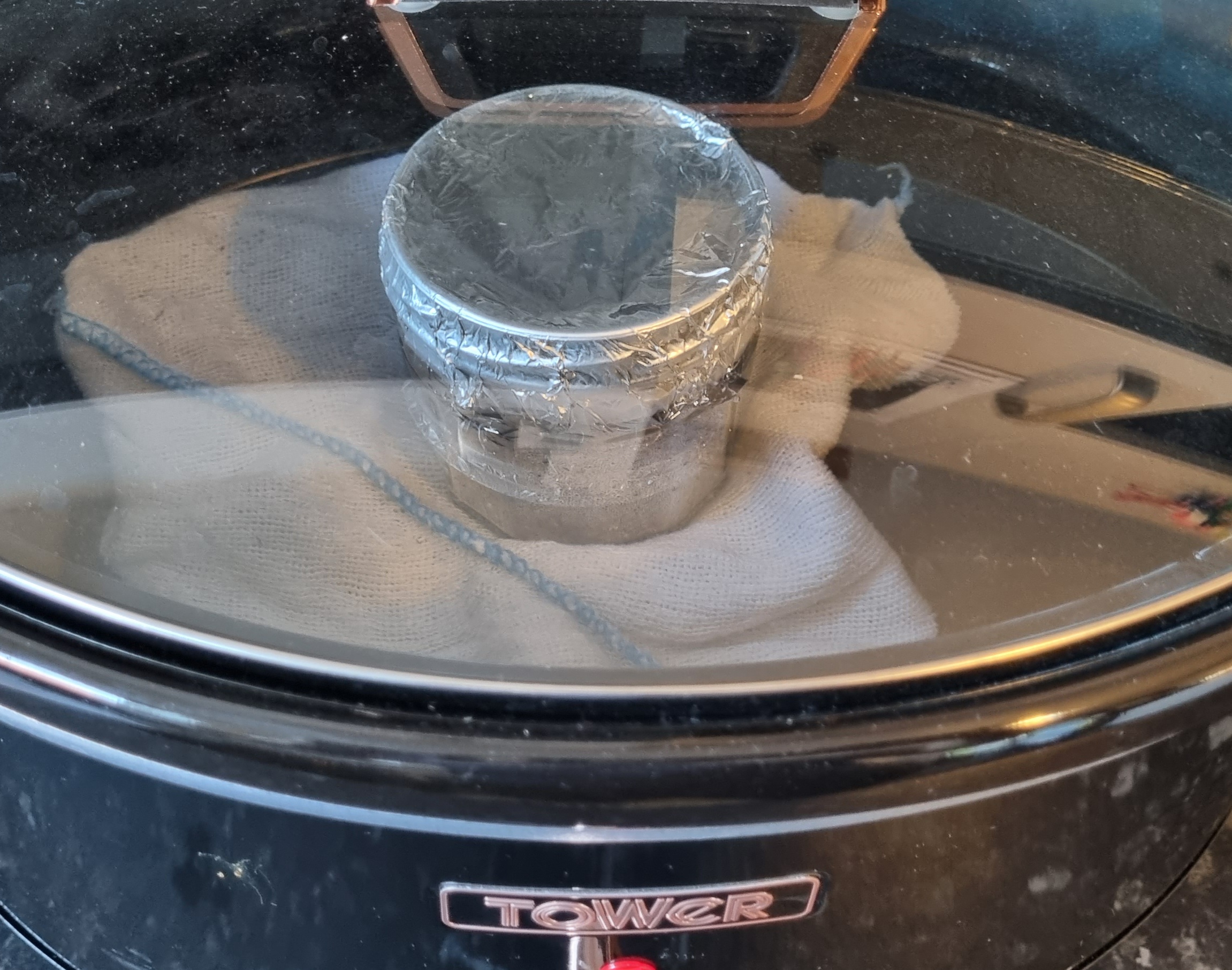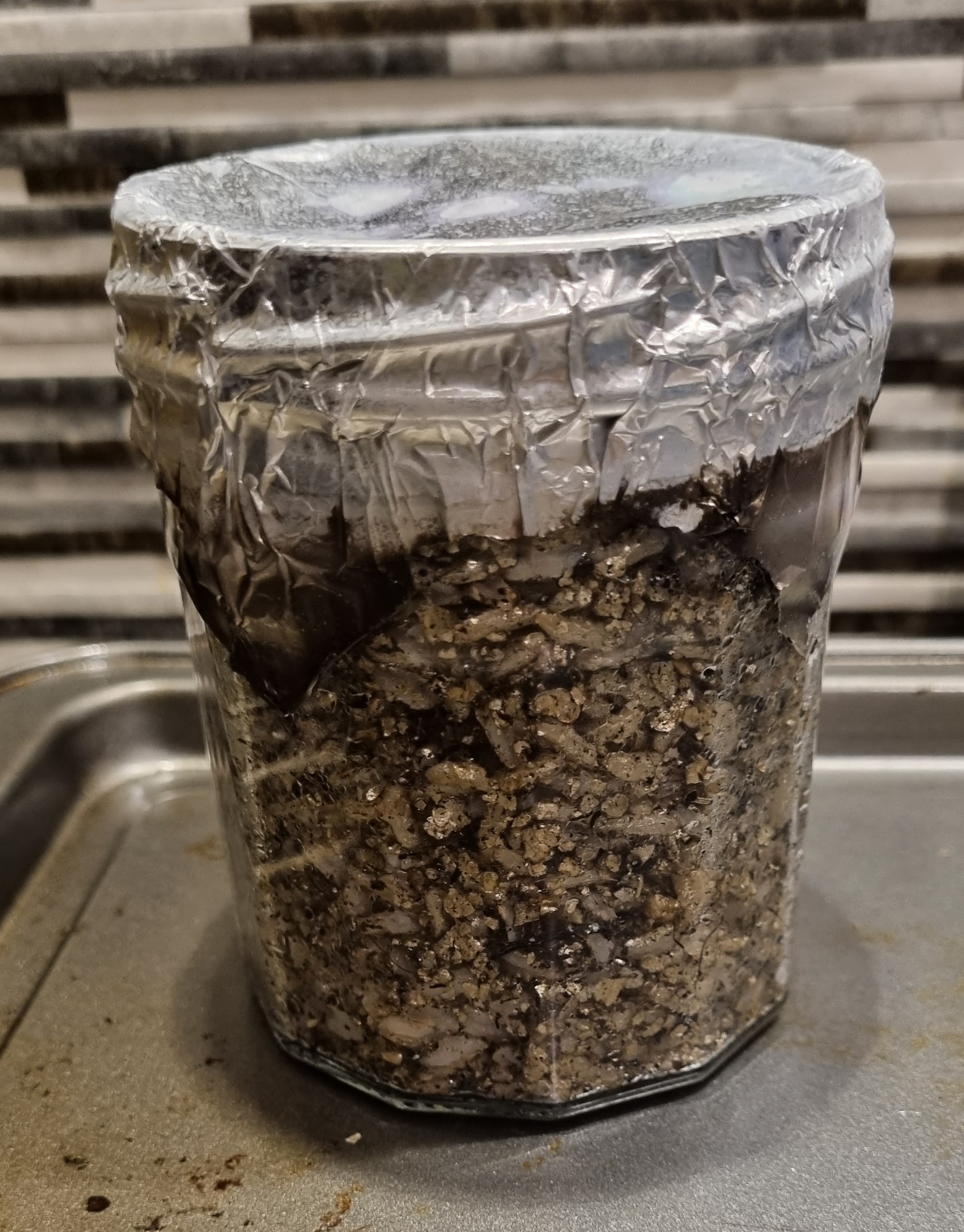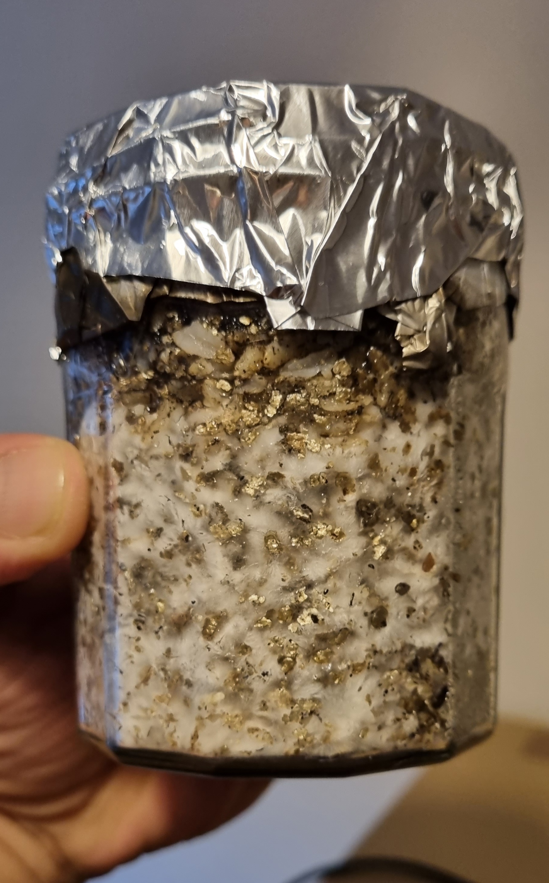 So since then I’d looked more into doing things from scratch so to speak, youtube videos and books etc and decided with a straggling 1ml of spore solution left I’d saved to do some experimenting. I didn’t want to spend any extra cash so I resided to using what I had round the house to get it done. I used a 330ml straight edged jar as the vessel for my substrate and brown rice (cooked for about 8 mins), vermiculite and some organic bat guano enriched soil as my substrate mix at a ratio of about 50% rice, 40% verm and 10% compost, mixed it all up using some boiled water to moisten the vermiculite and packed it into the jar, sealed with some tin foil. I don’t have a pressure cooker so I sterilised the jar in a slow cooker on high, waiting until the water round the jar bubbled and giving it about 90 mins from then (about 4 hours in total). Once it cooled I innoclulated the jar with the solution through the foil with a syringe and covered again with more foil and placed it into the very simple homemade incubating chamber I made.