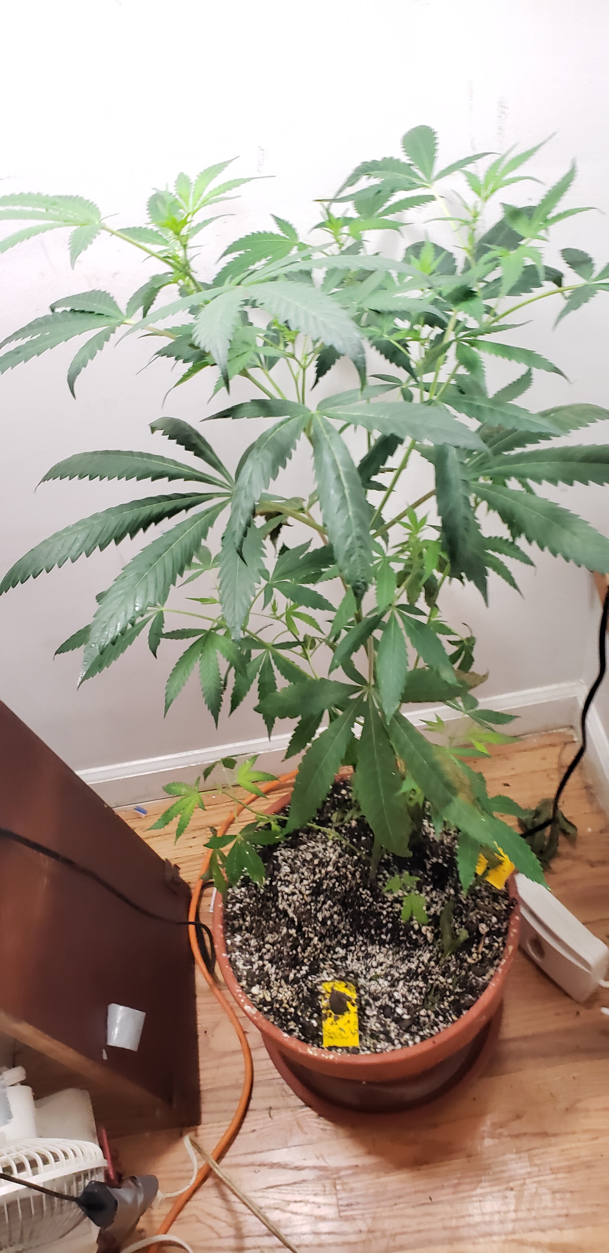 Before I could really see what happened with this one of my lights fell and snapped the plant in half. I did want to flower soon since this was at like 8.5 weeks of veg but I figured I obviously had to wait for the plant to heal. Over the next week I babied the plant while it healed. I reduced the lights for a bit as I heard this was good to do and I saw 2 white pistils on a bud site. I didn’t realize that this was a bad thing at the time. It was also at this time that it got plagued by fungus gnats. It turns out the pot that I moved it to had horrible drainage (it had an attached drainage tray). So I figured I have to repot to better drainage but first I had to let it heal and kill the bugs.