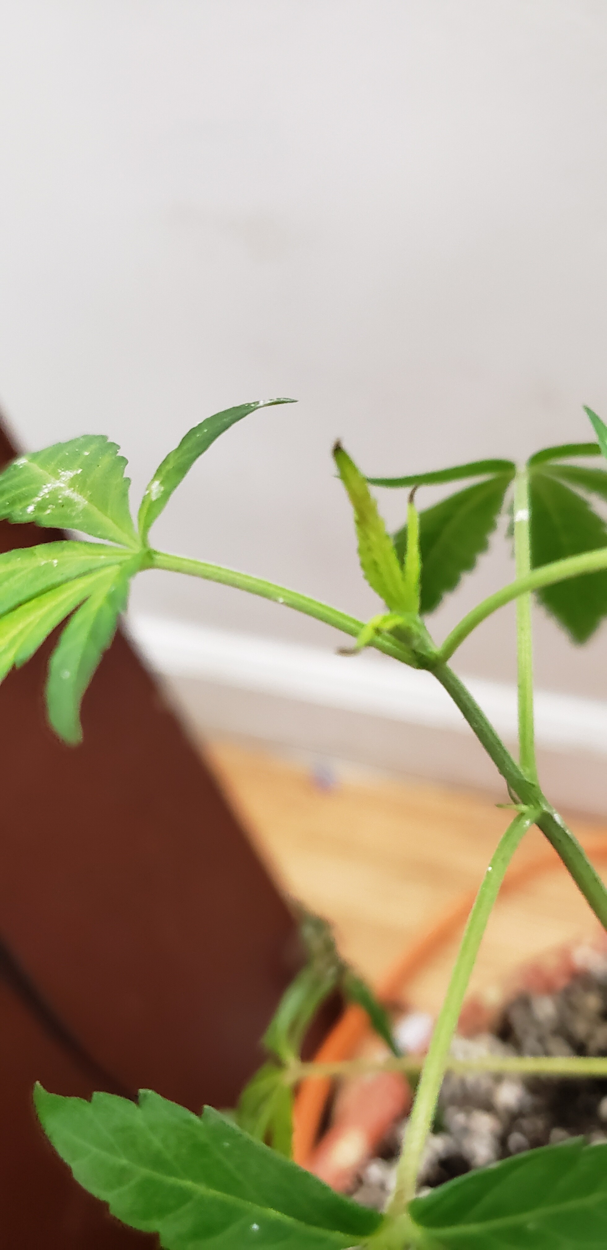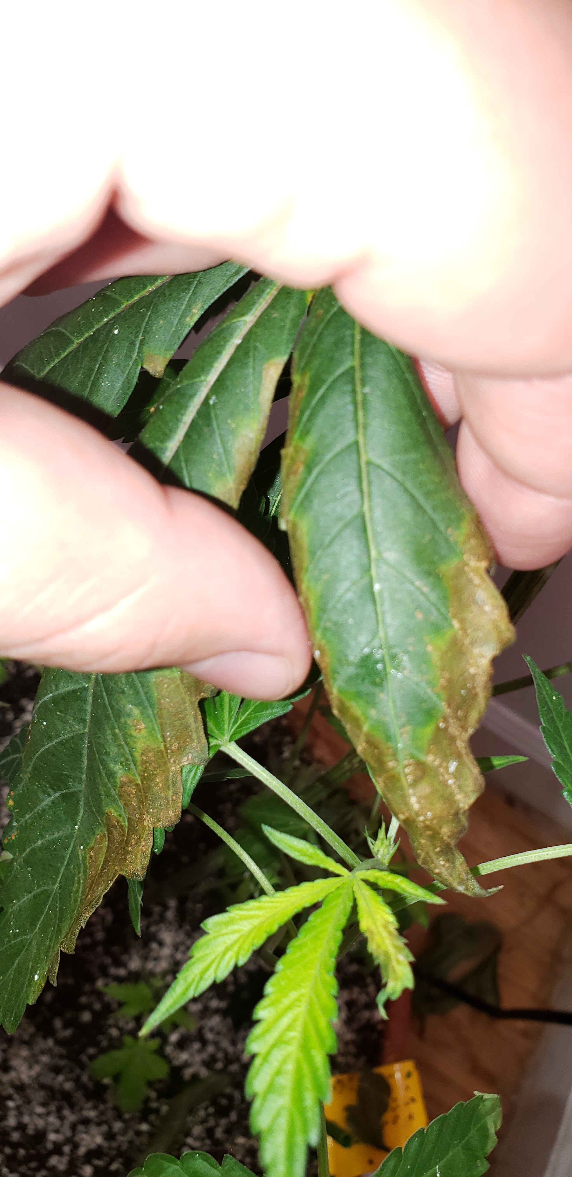I am growing indoors what I am pretty sure is a sativa from a bag seed indoors under 2 CFLs and a multi LED plant strip. I am using fox farm ocean forest for the soil with 20% perlite. Currently the plant is in a closet with a fan for ventilation on 12/12, RH is typically around 55. I haven’t really tried feeding actual nutes until recently, just occasionally using natural stuff like coffee grounds etc through veg.