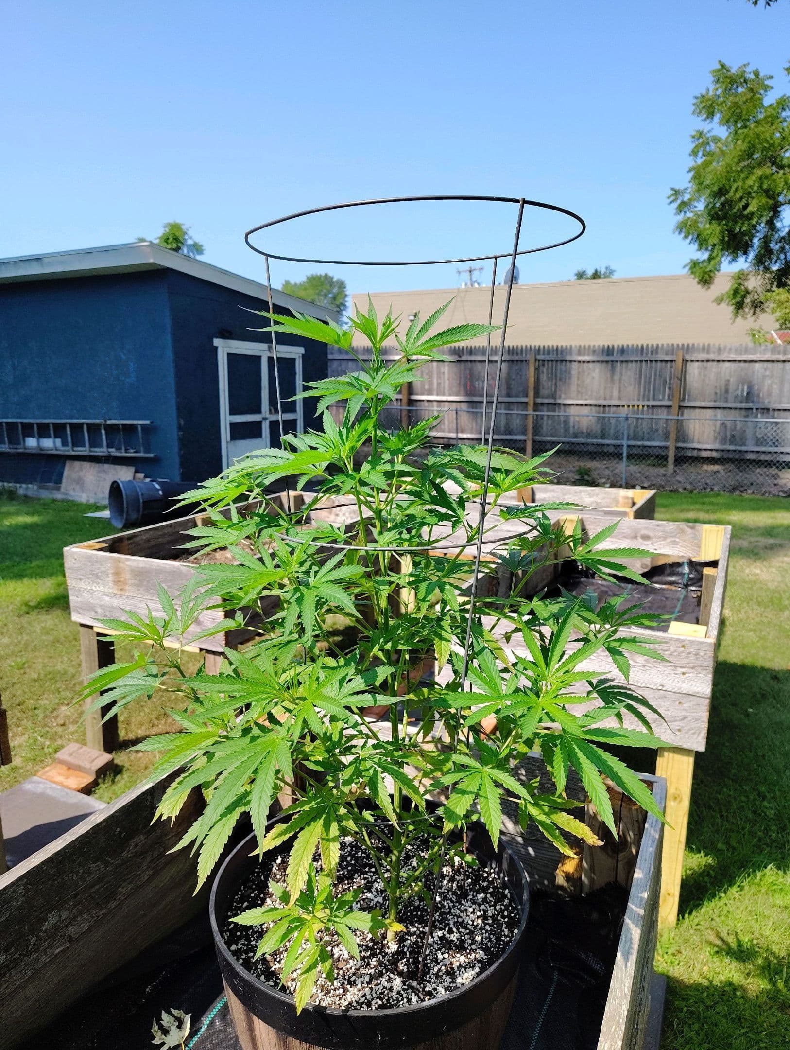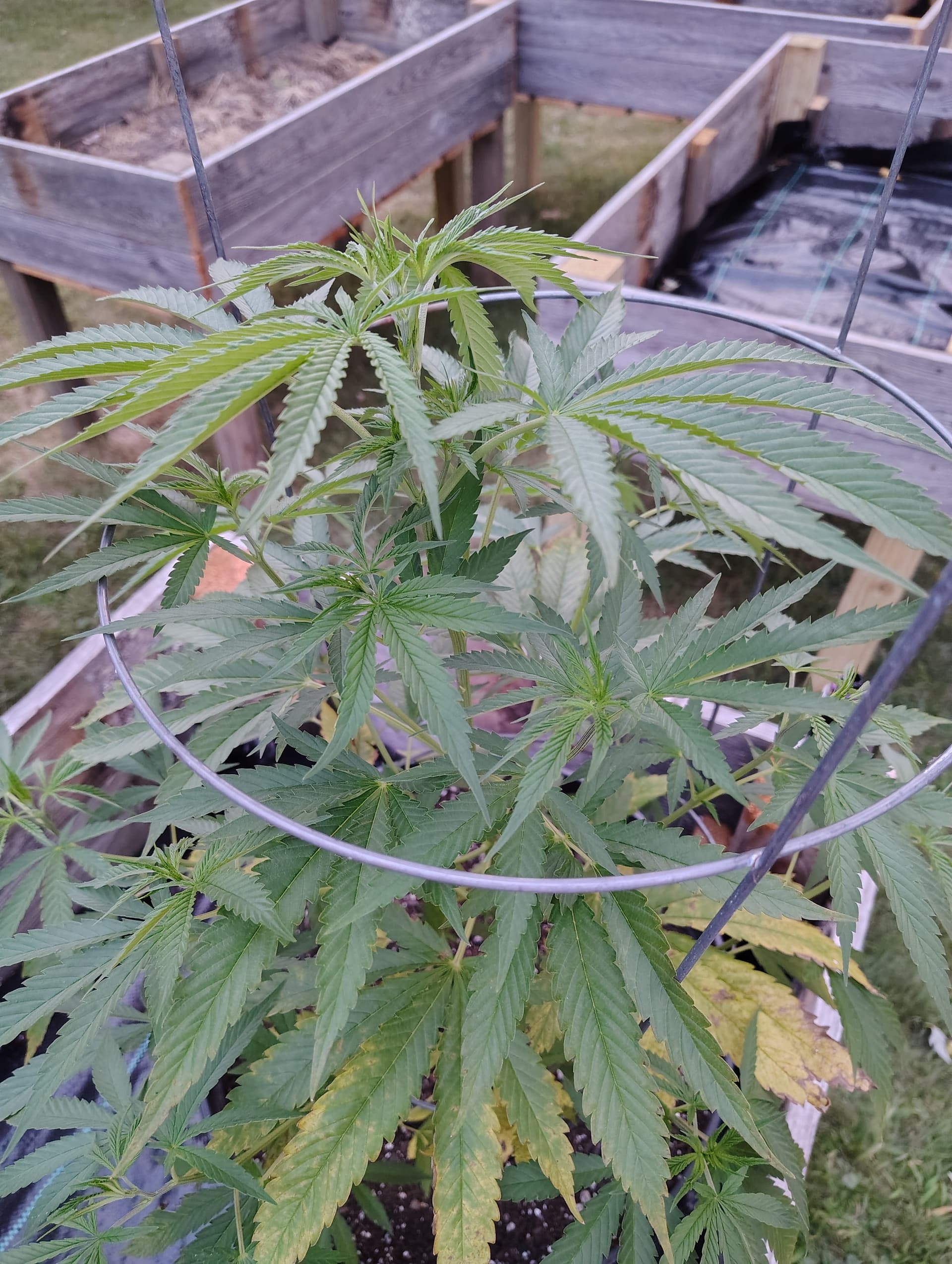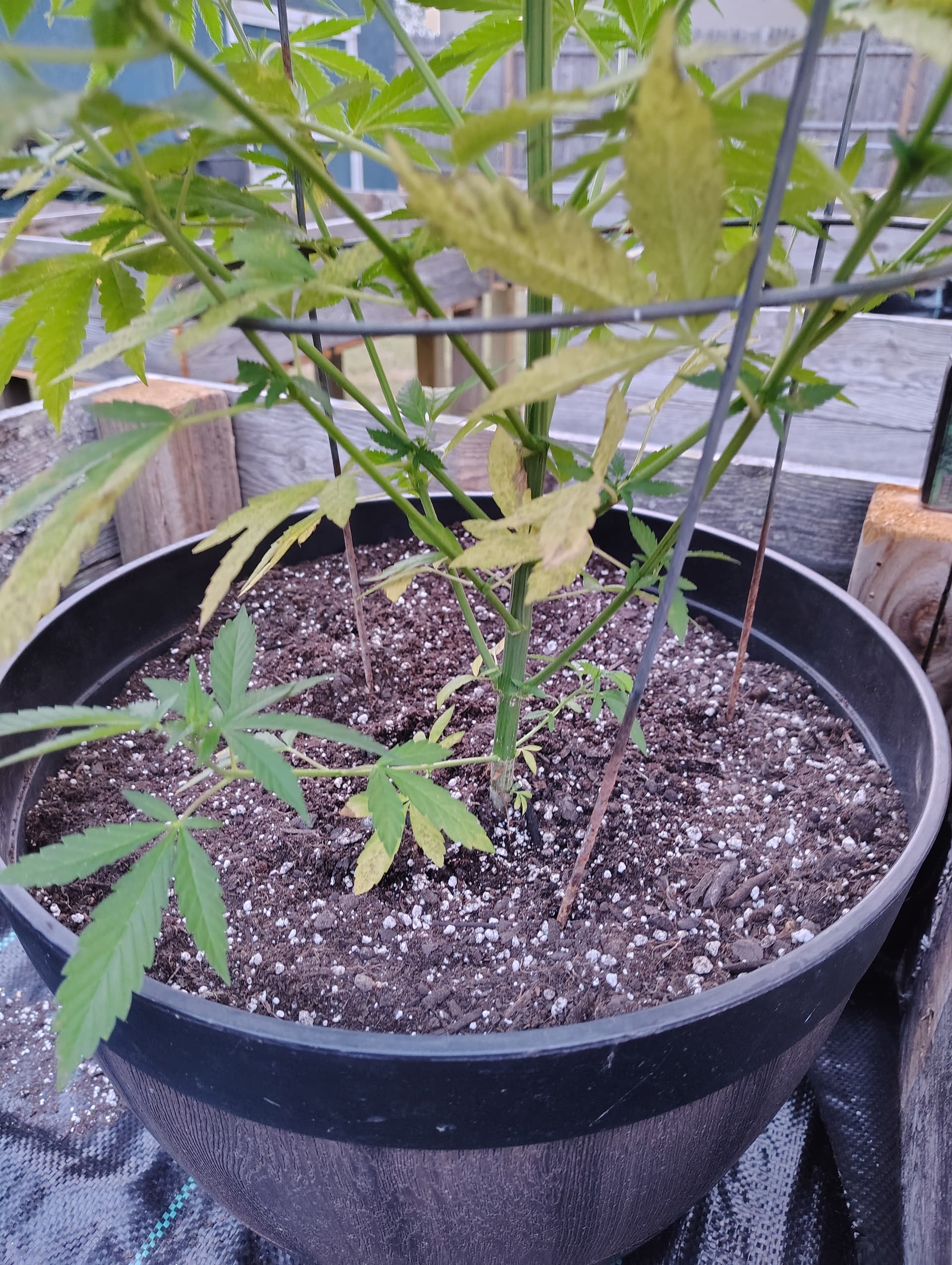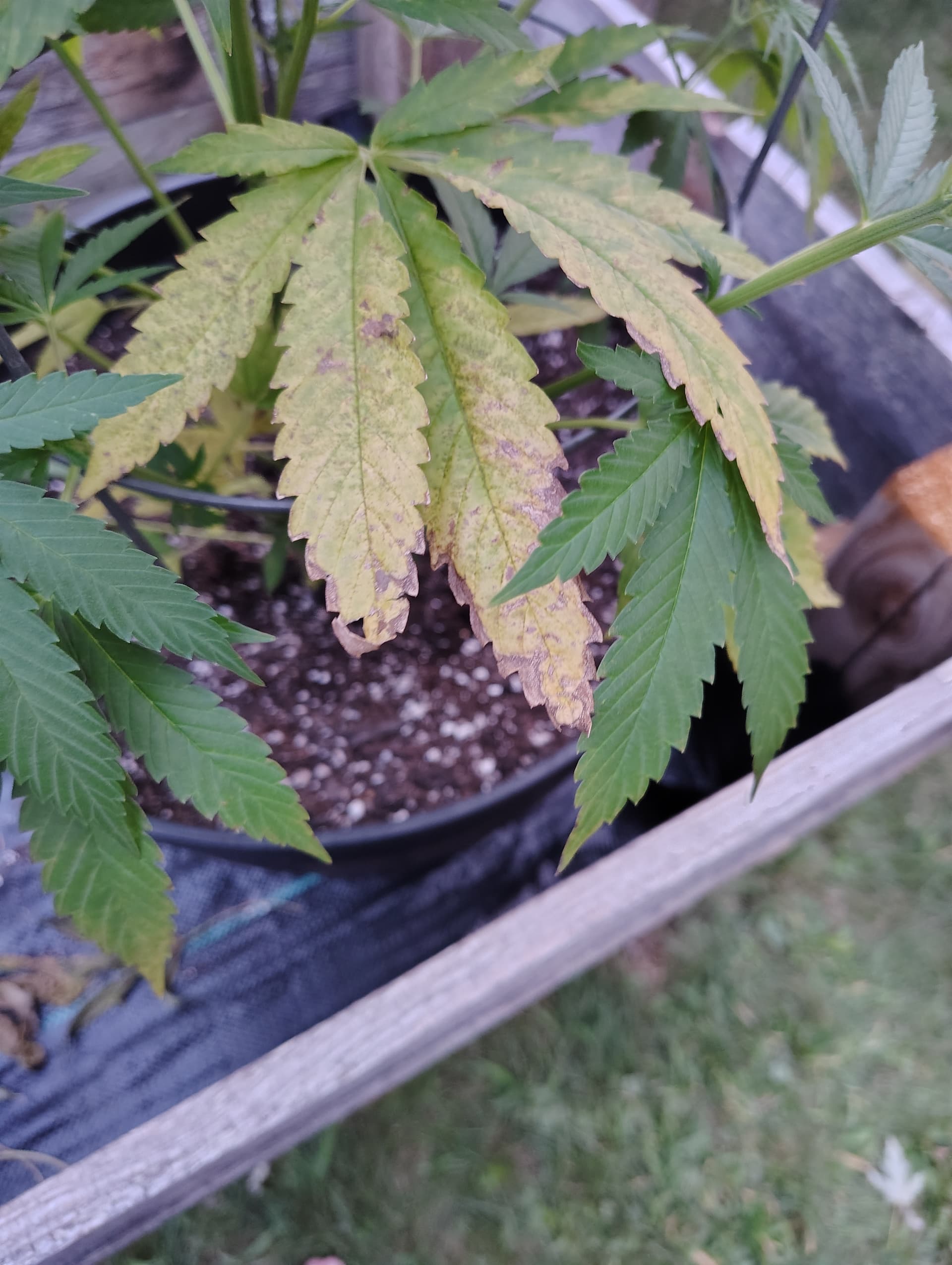Plant is still nice and green at the top and it other places. I have an auto flower growing in the pot next to it, and it looks fine.