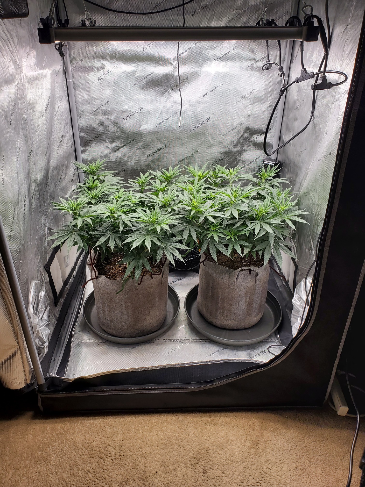 can’t tell from the picture if you have risers or not, you’ll want them. Don’t want the bottom of the pots sitting in runoff keep us updated! What strain are you growing?