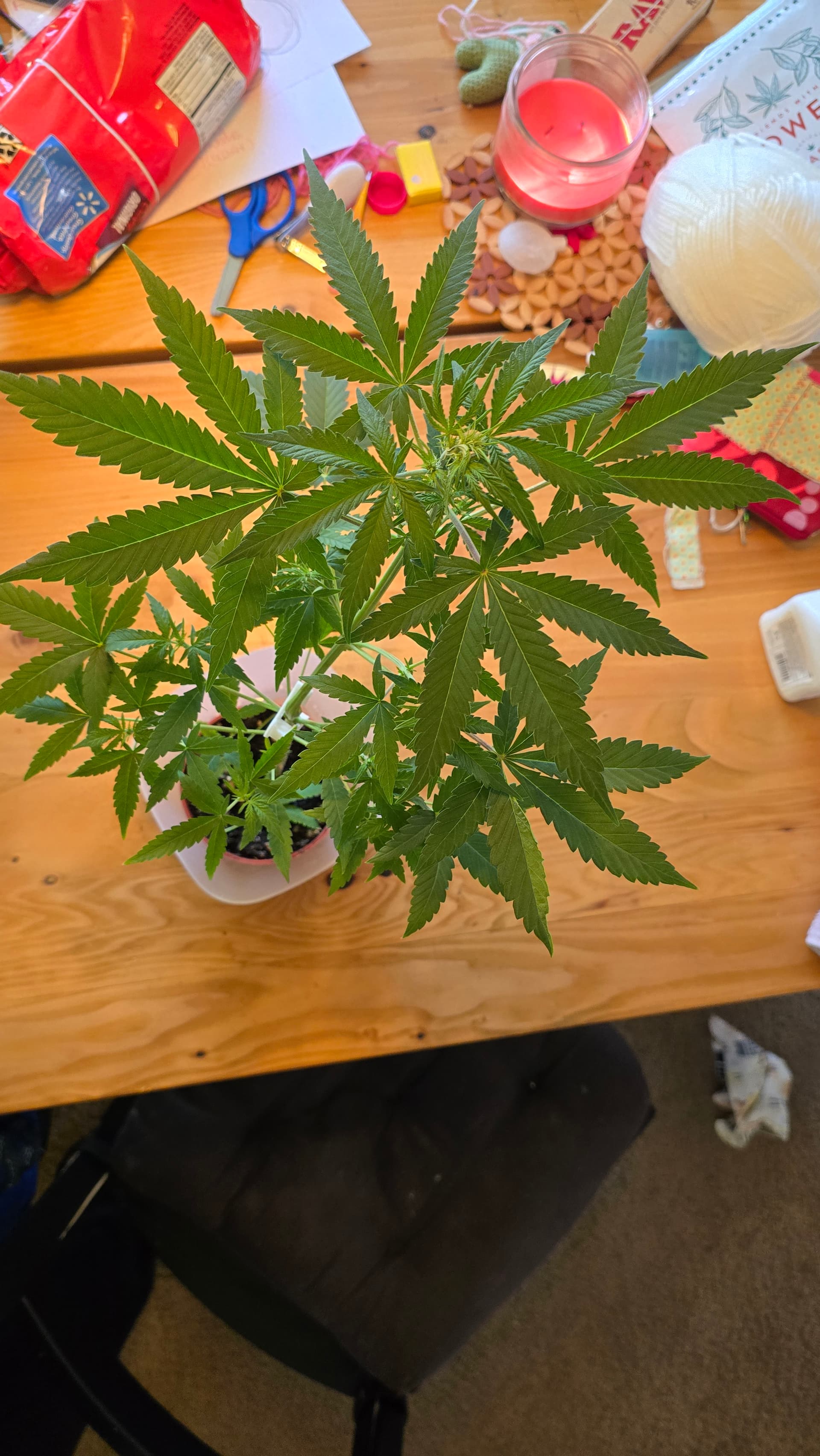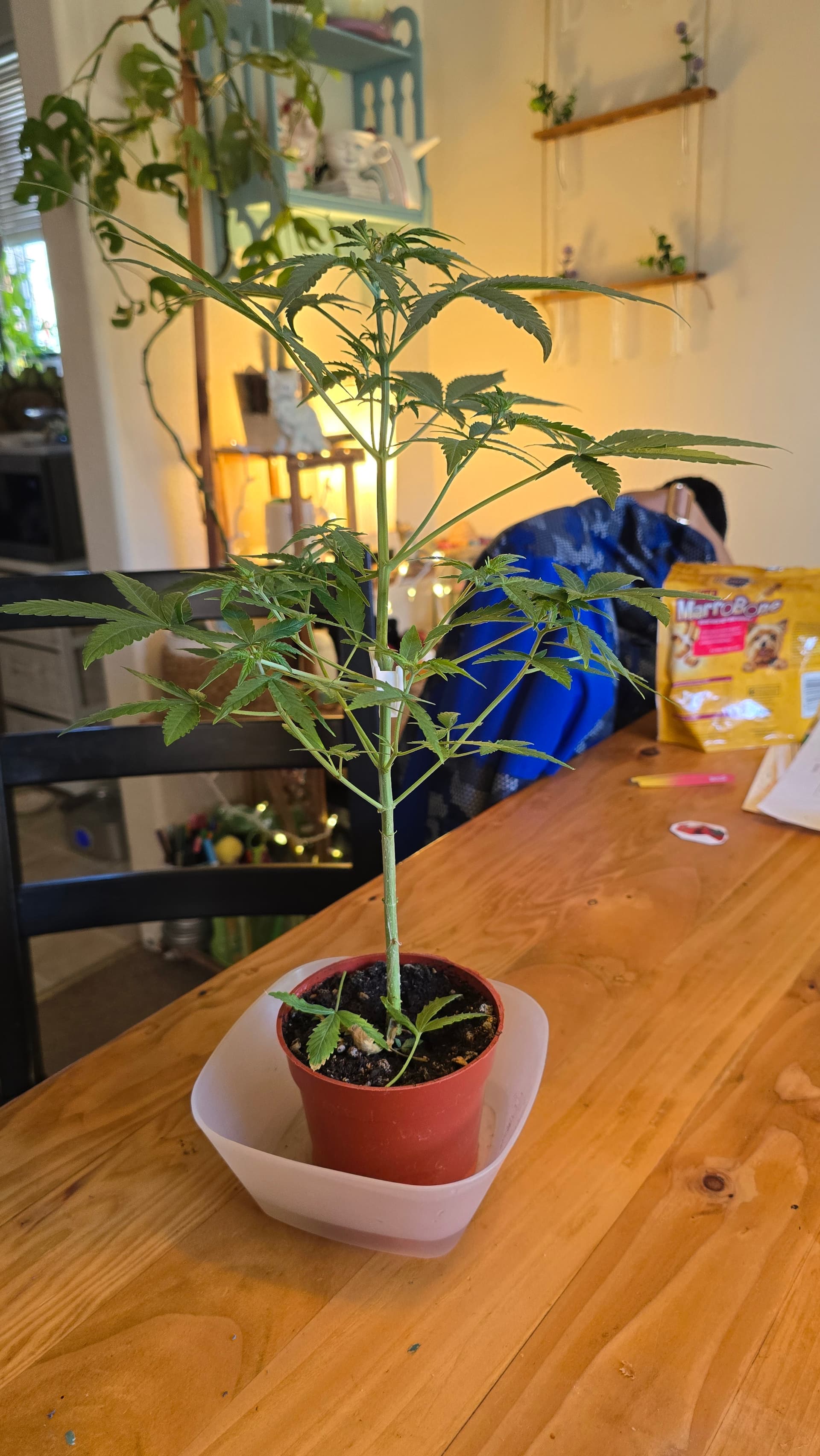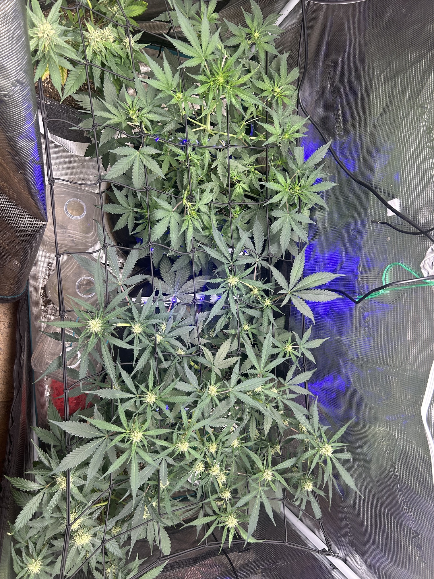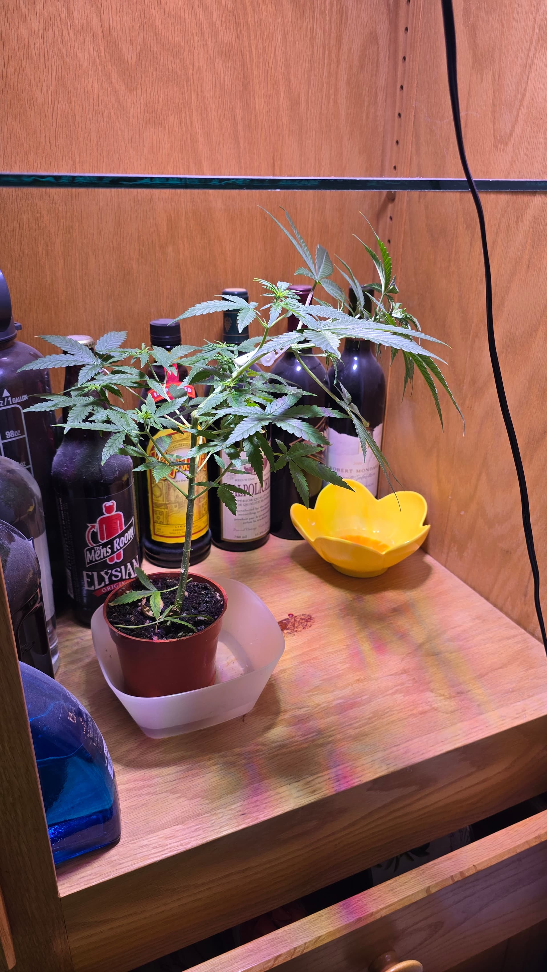 Purple kush auto. Cabinet grow! $20 amazon light. looking healthy and she is flowering! Had to bend her over again. Was hitting the glass shelf. Plucked off 2 small leafs near the bottom that had deformed before i got it feed from early veg.