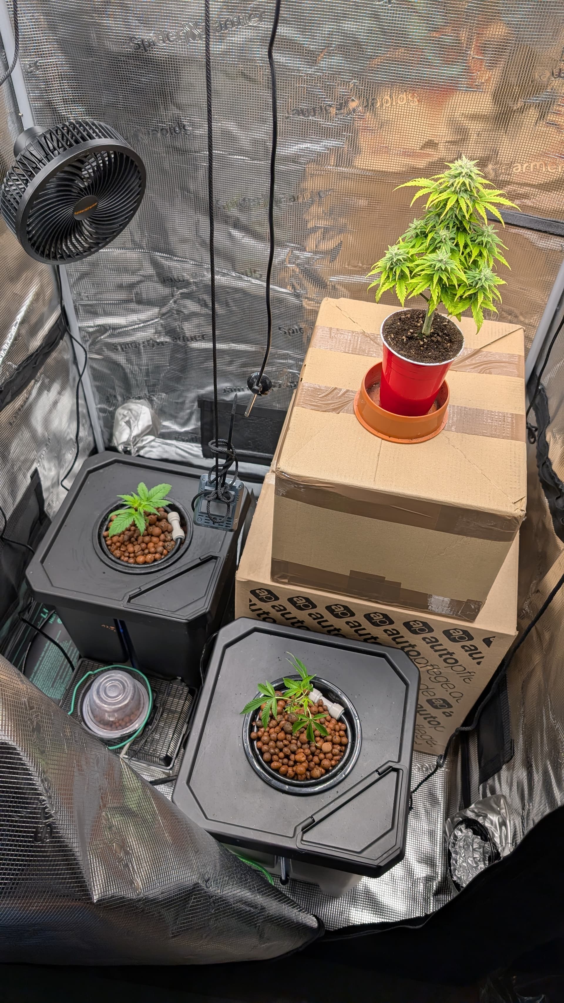 She’s slowly starting to look great again. And I can see some growth again. So the procedure was a success. I’m really happy it worked. I also received another clone from Austria today and immediately put her in the DWC. Weddingcake. This is the Airpot vs. DWC test.