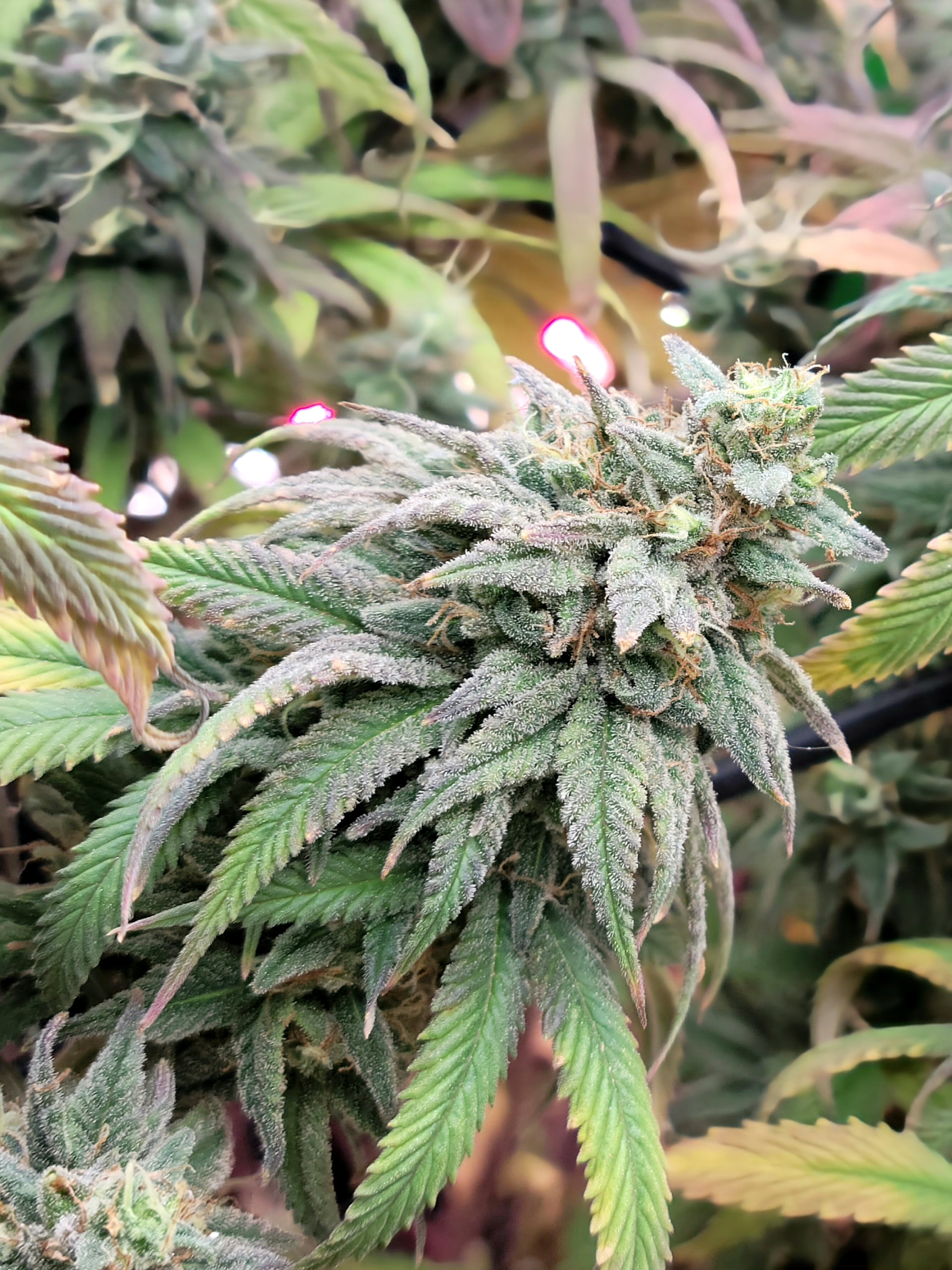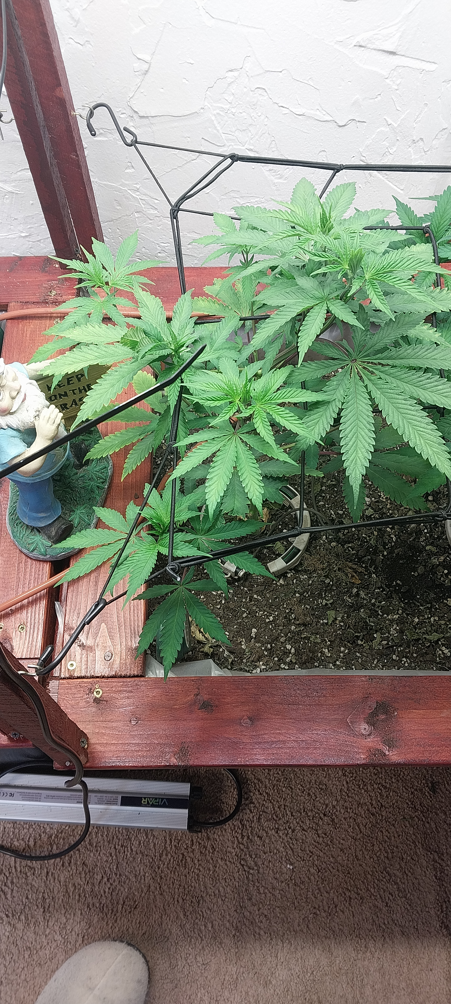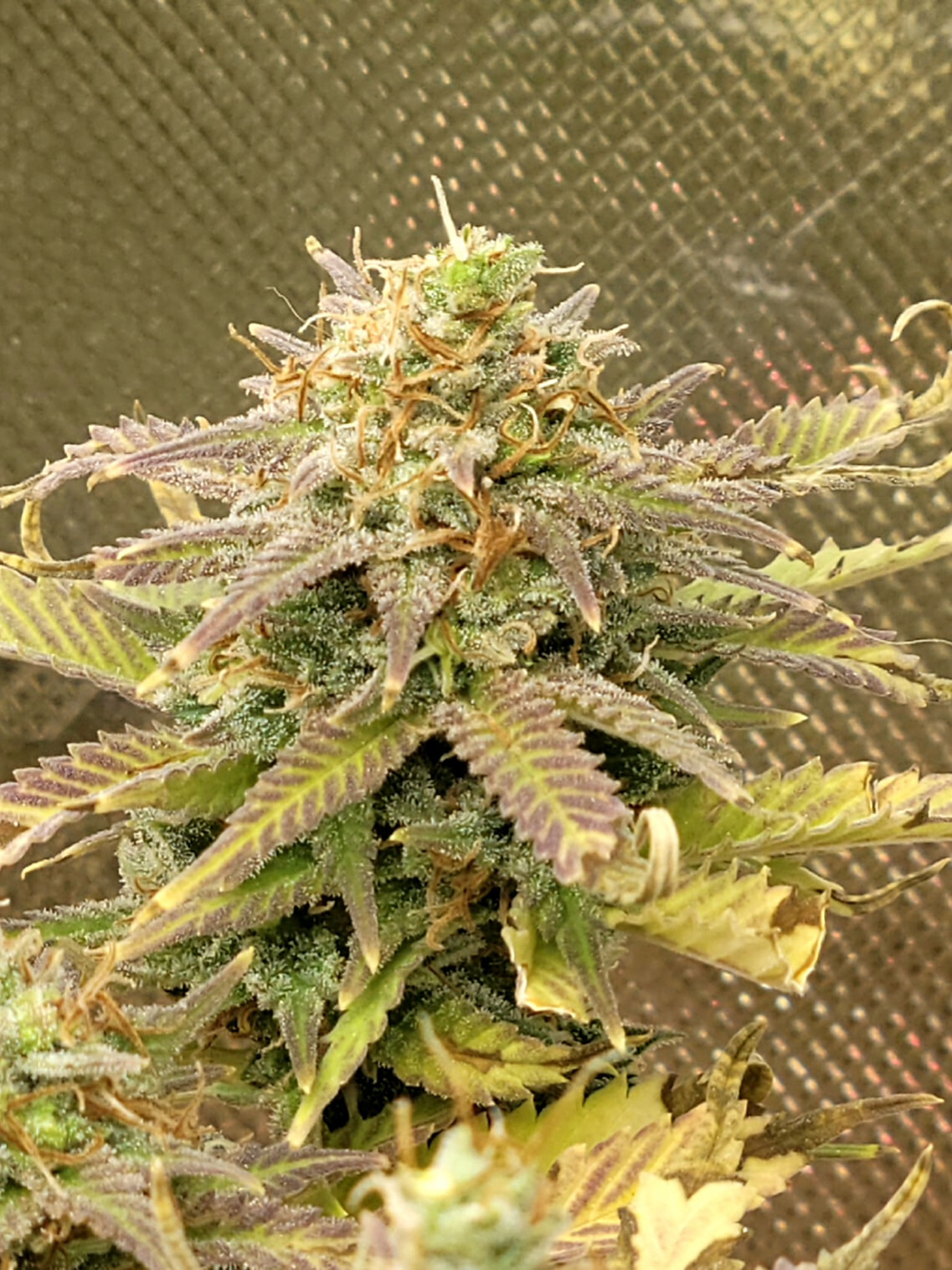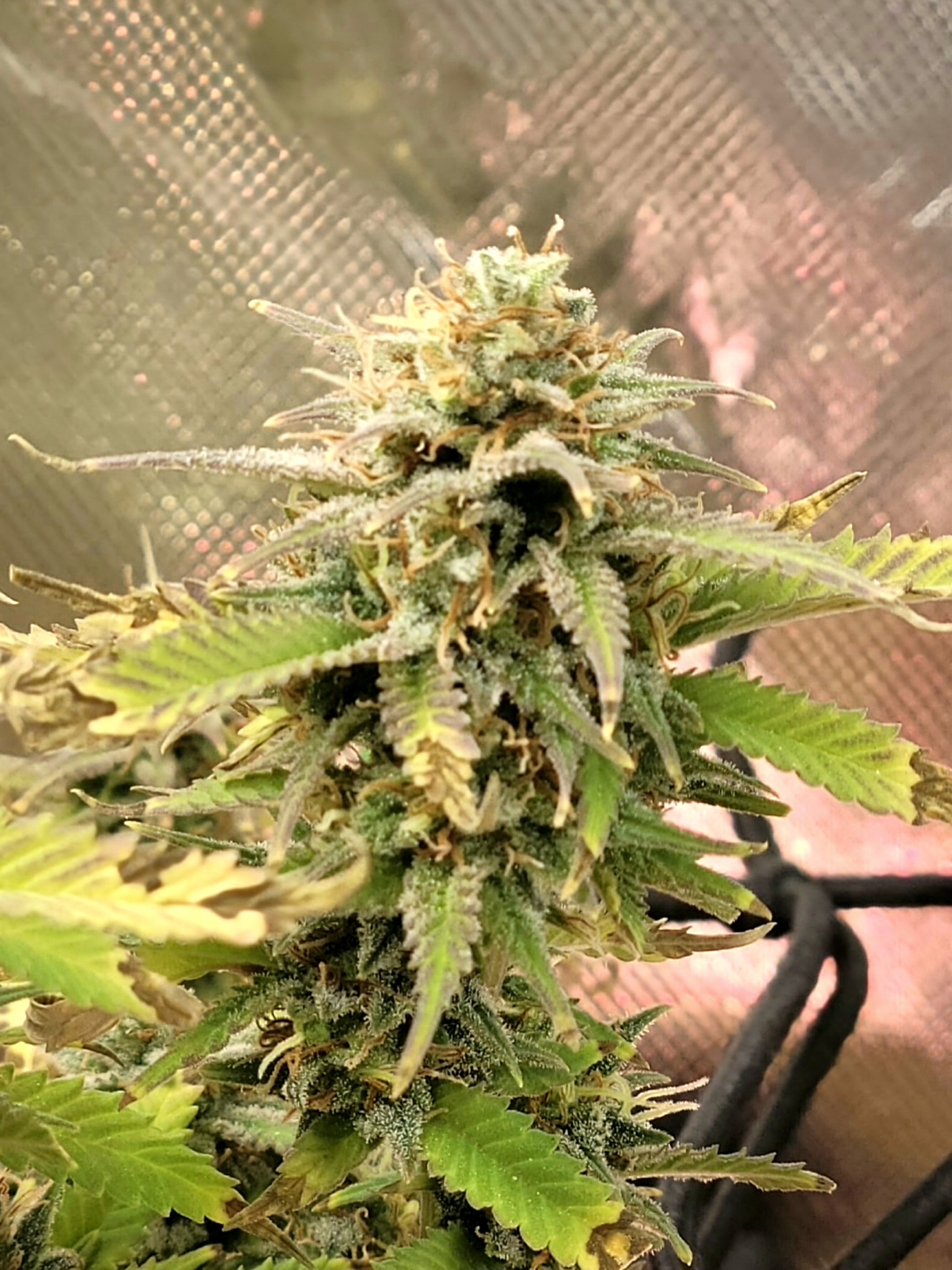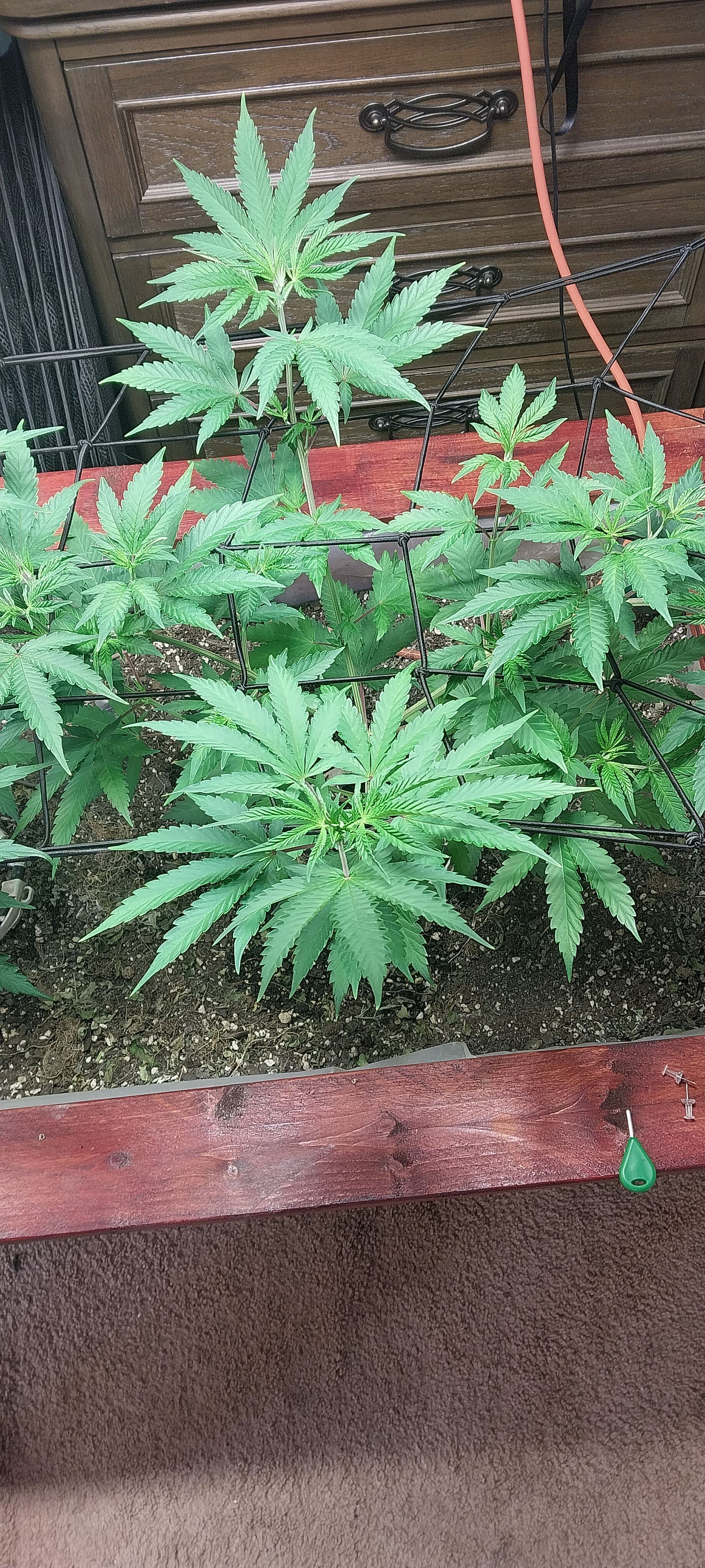 Removed the dead and dying fan leaves. Readjusted the trellis for better light exposure and air flow. Buds are dense and sticky. Amazing citrus aroma. Buds are getting heavy any starting to fall over