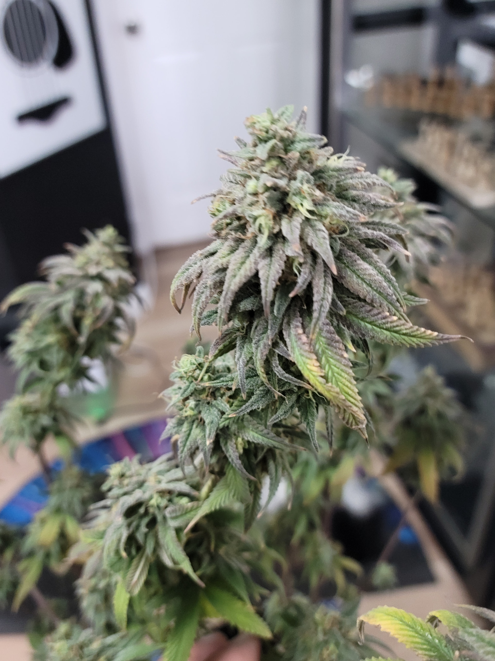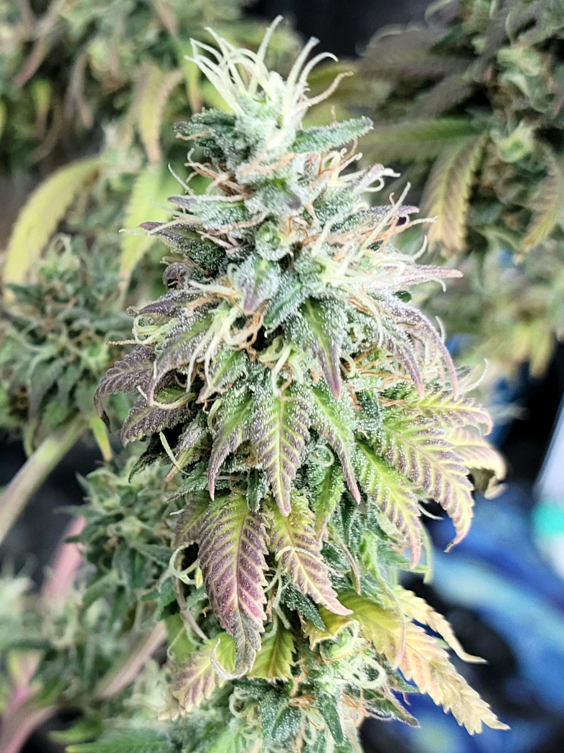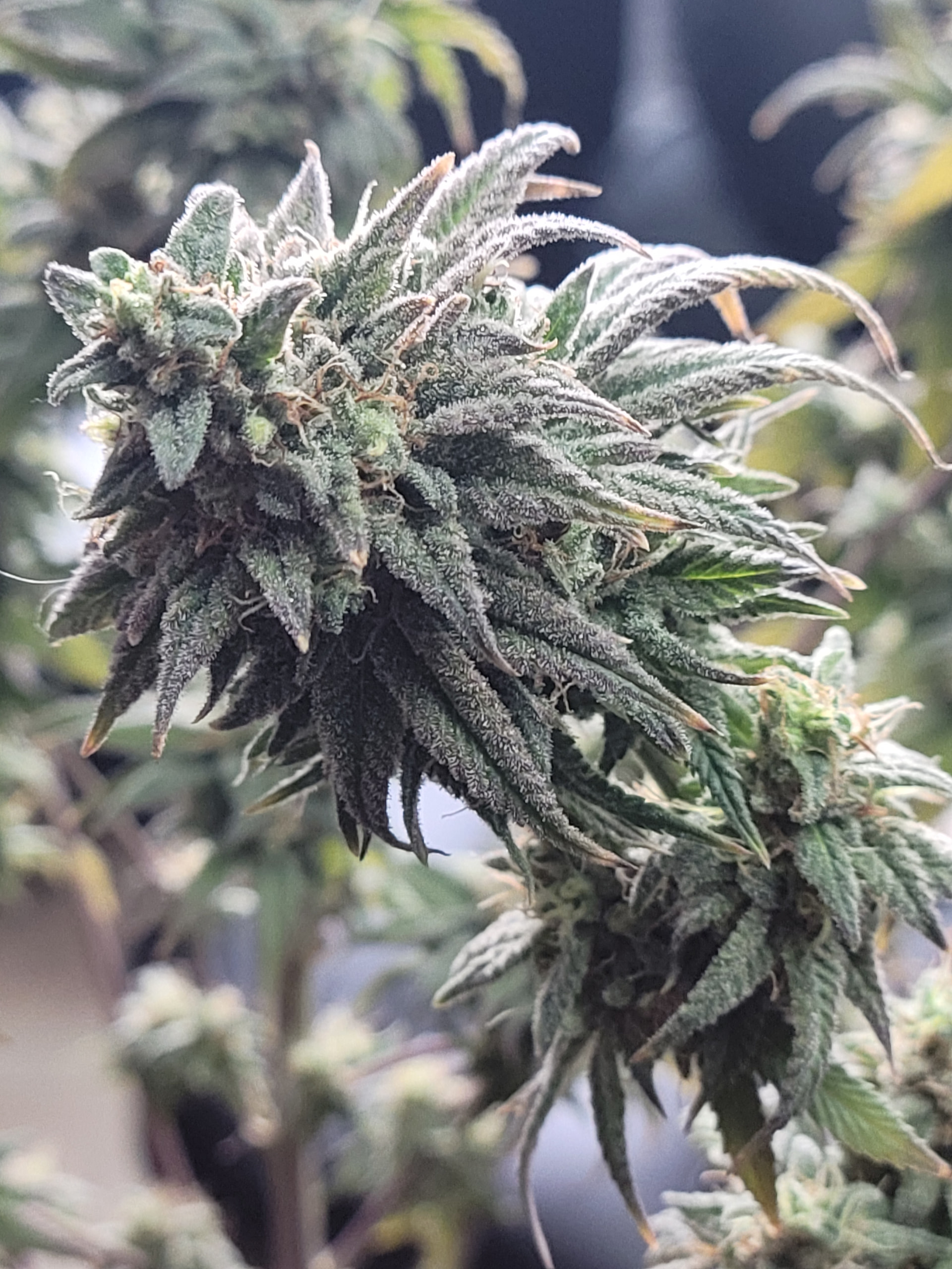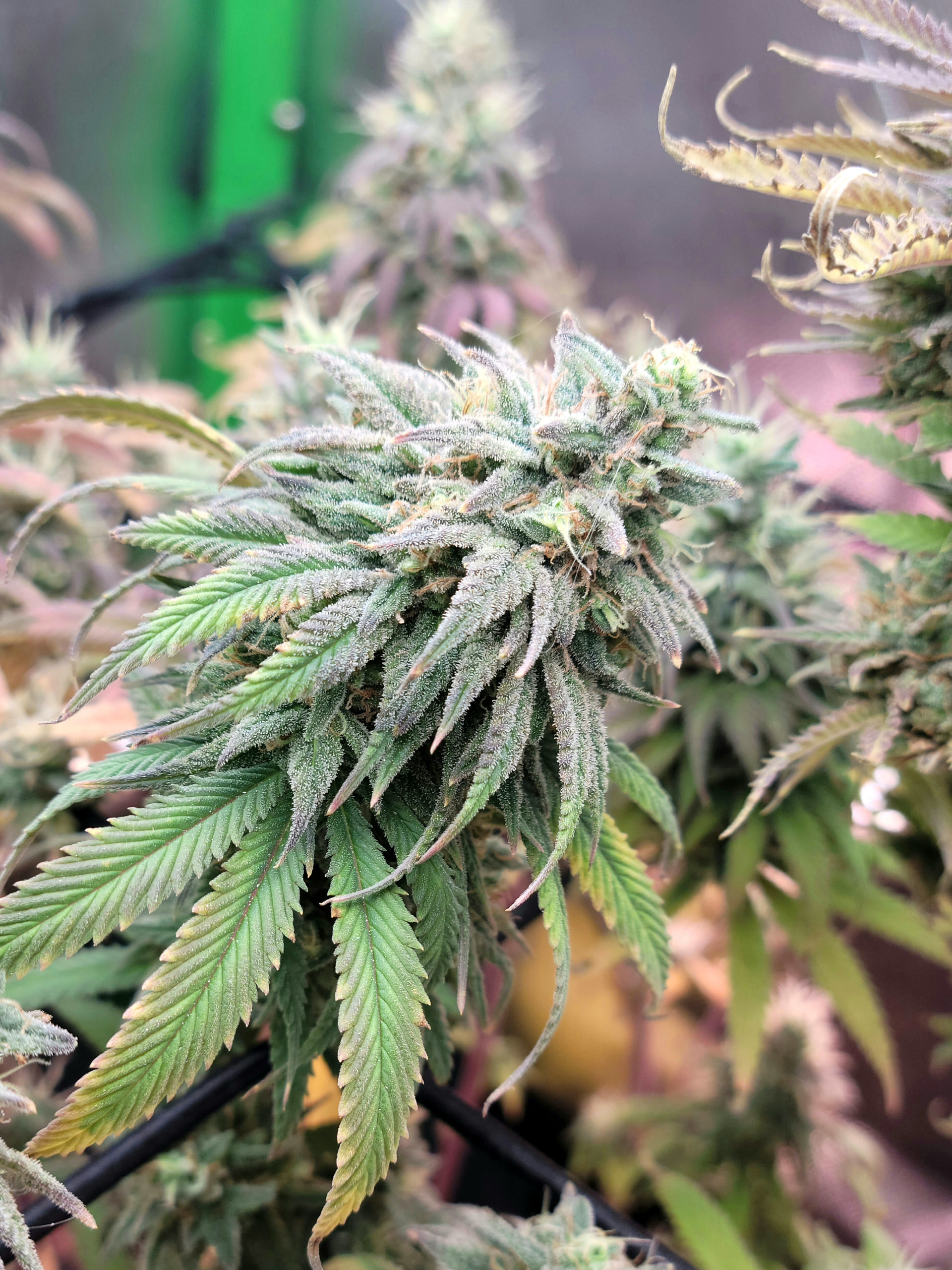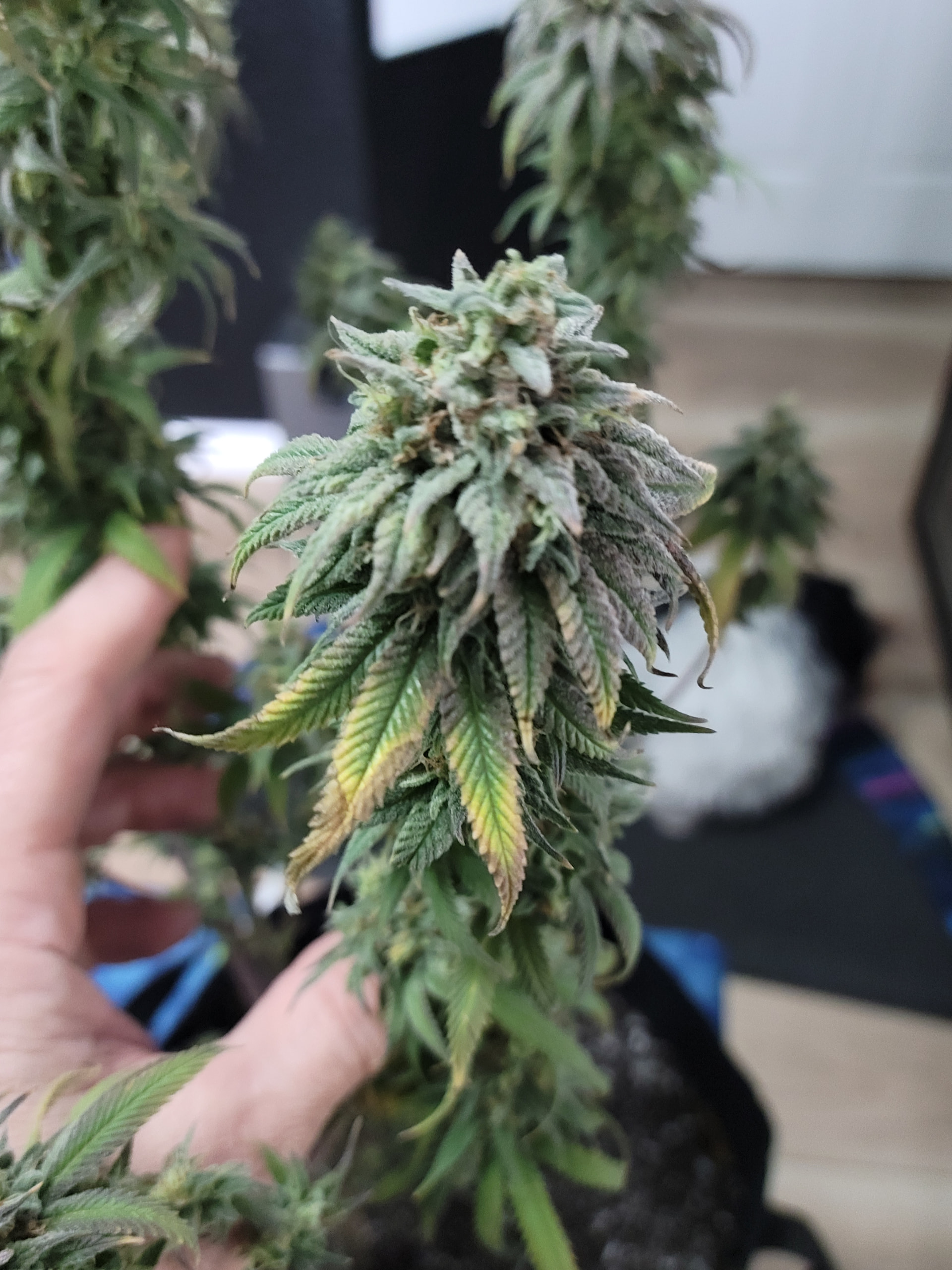 Removed the dead and dying fan leaves. Readjusted the trellis for better light exposure and air flow. Buds are dense and sticky. Amazing citrus aroma. Buds are getting heavy any starting to fall over