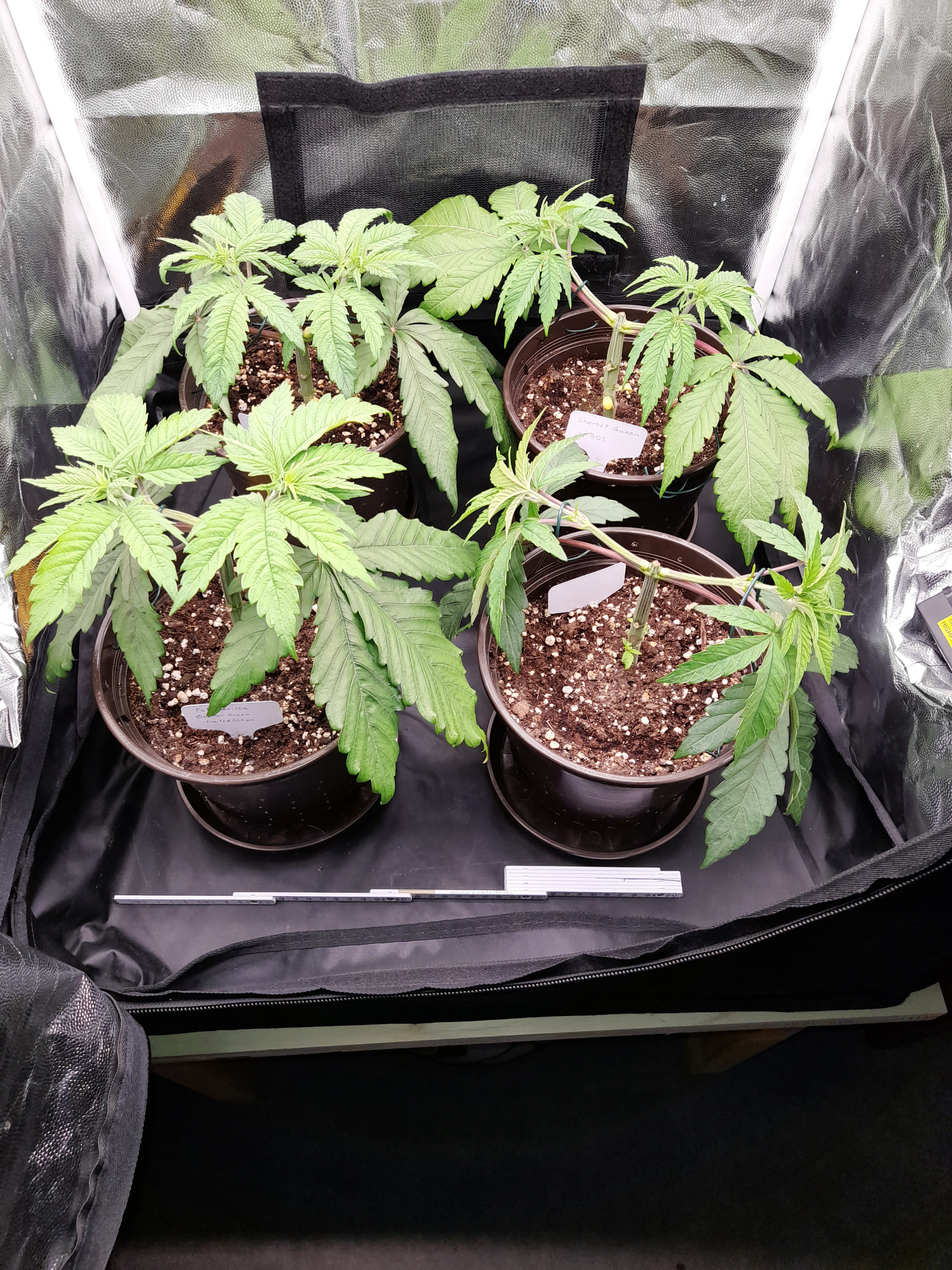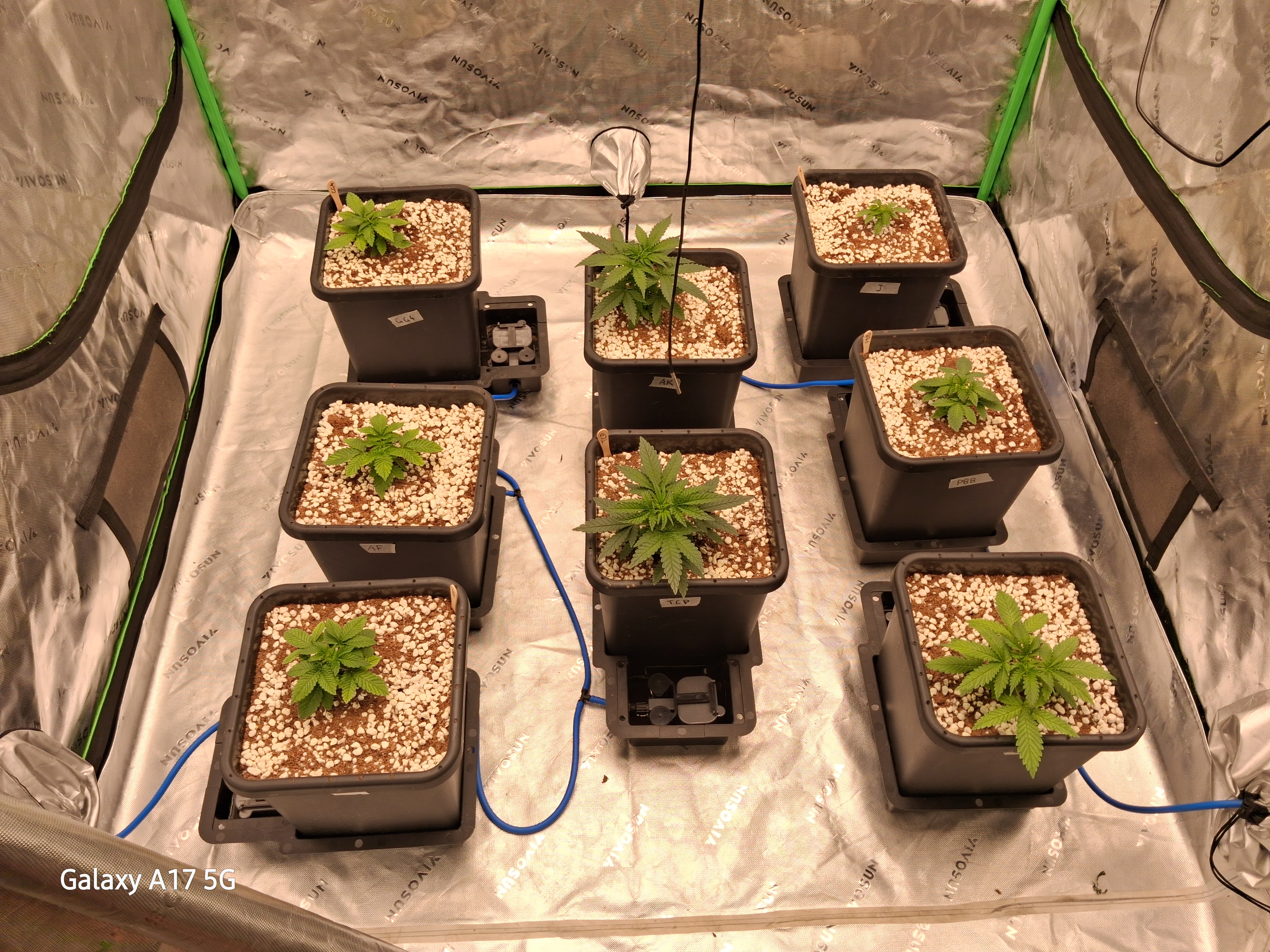 and then we have the ladies in the pots from top to bottom. 1, space wrangler. 2,turbo kush “fast”. 3, rock salts. 4, cherry sunrise. 5, head candy. 6, head candy