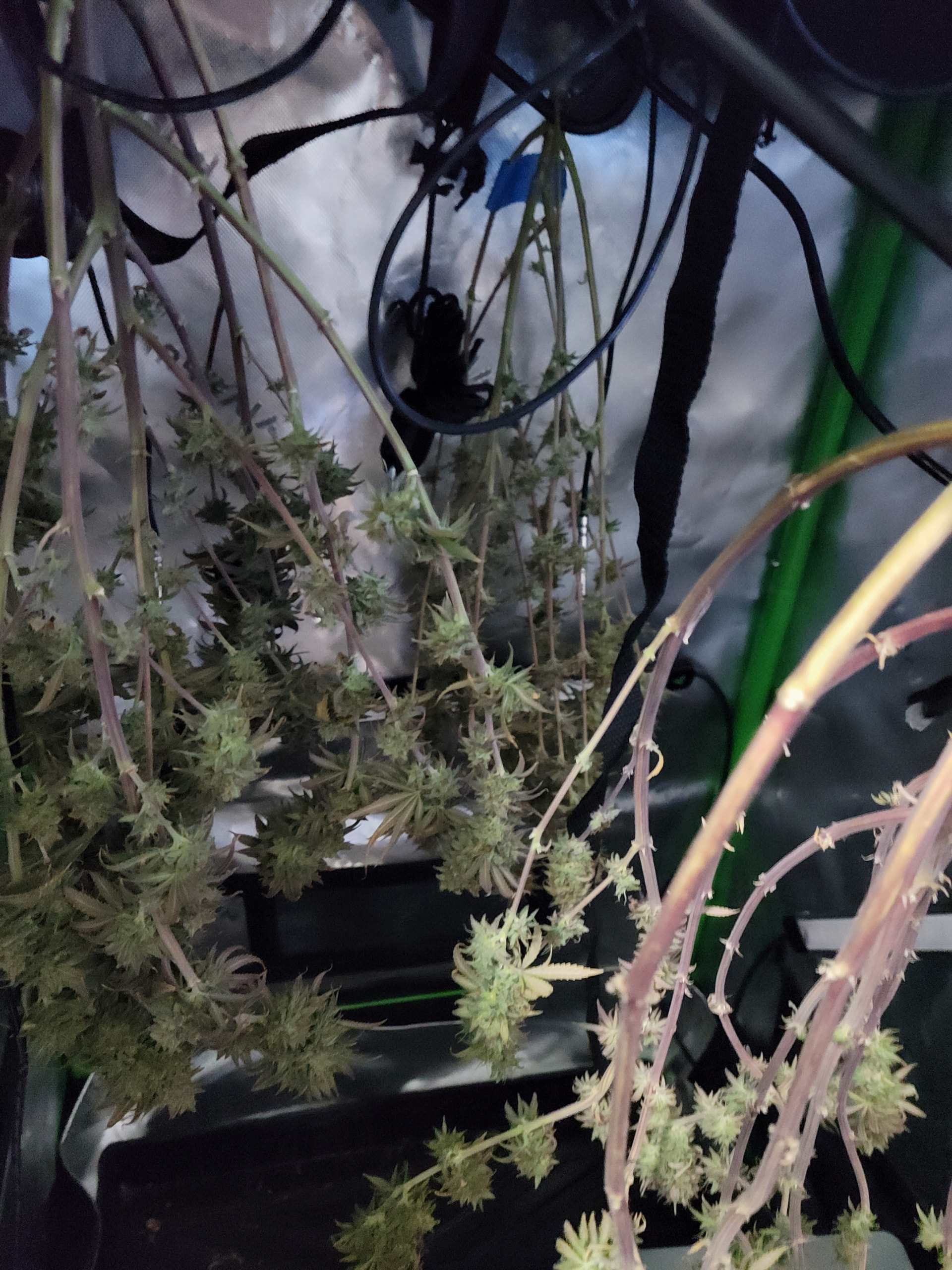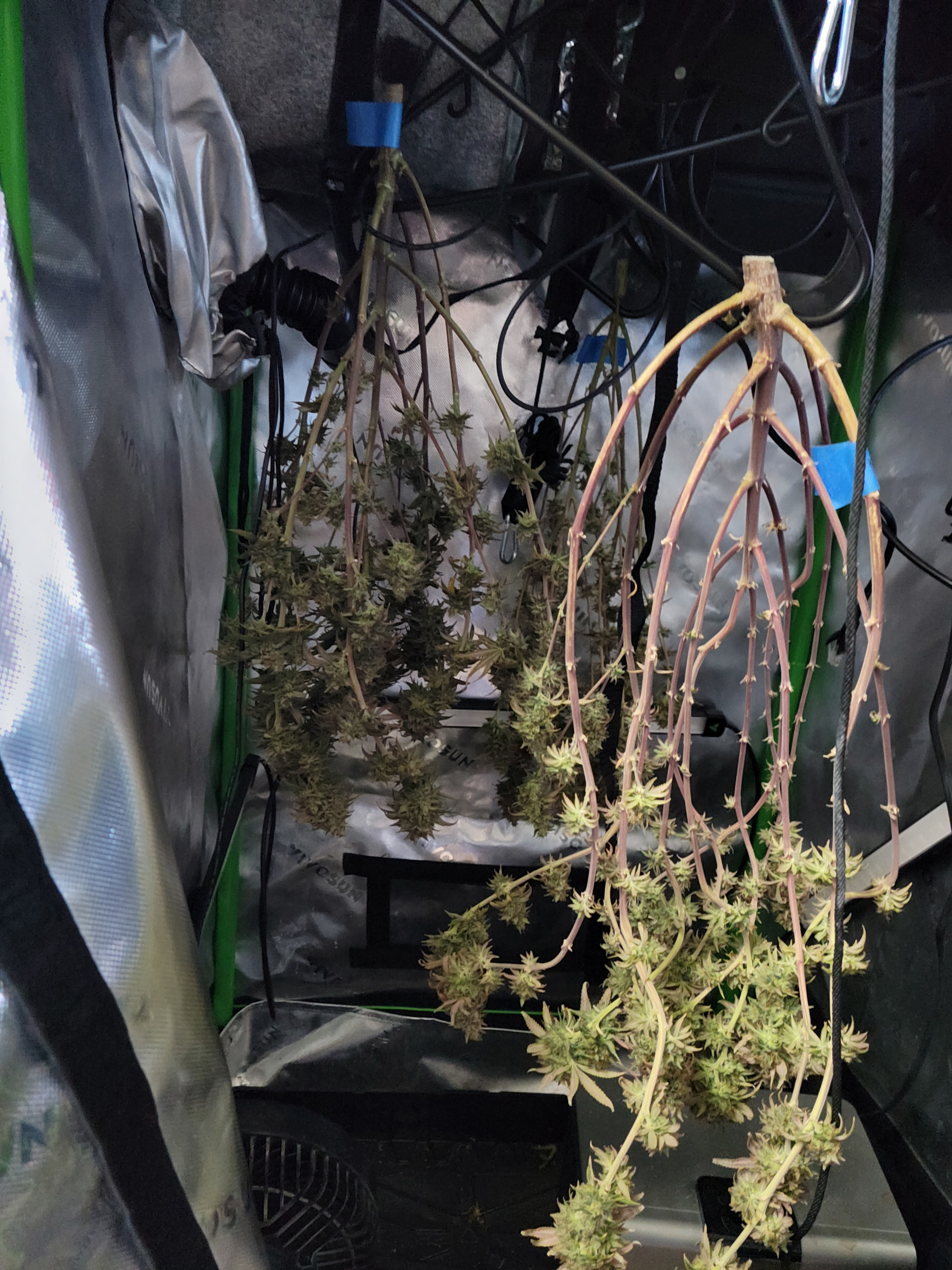I checked the trichomes on Thursday and they went from sparkly white to dull. There were about 10%+ amber. I cut them down early Friday morning, a half hour before lights on. Removed the fan leaves. Using Brandon Rust’s dry & cure method.