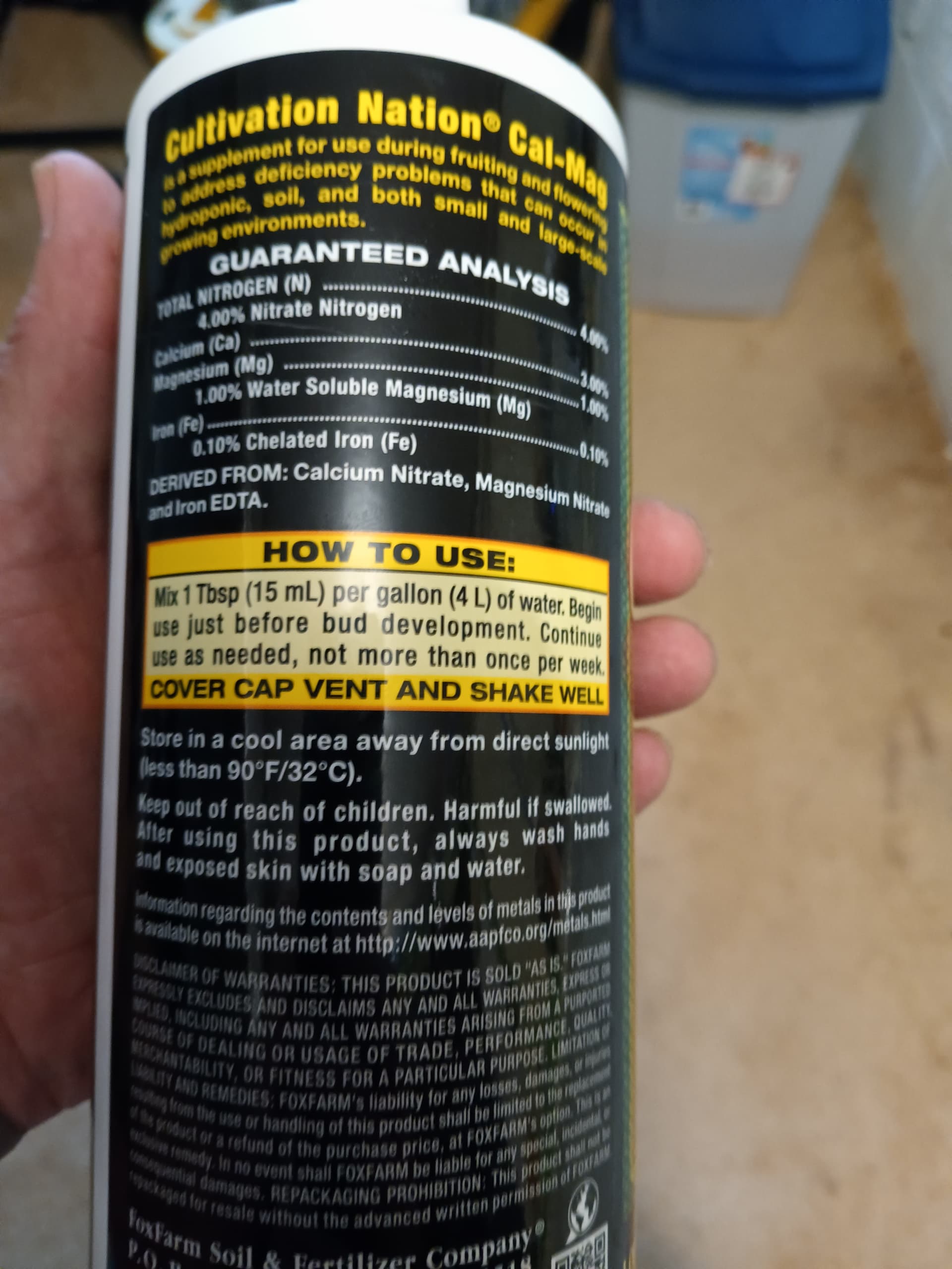 Mine Calmag says 15 ml per gallon per week during flower…