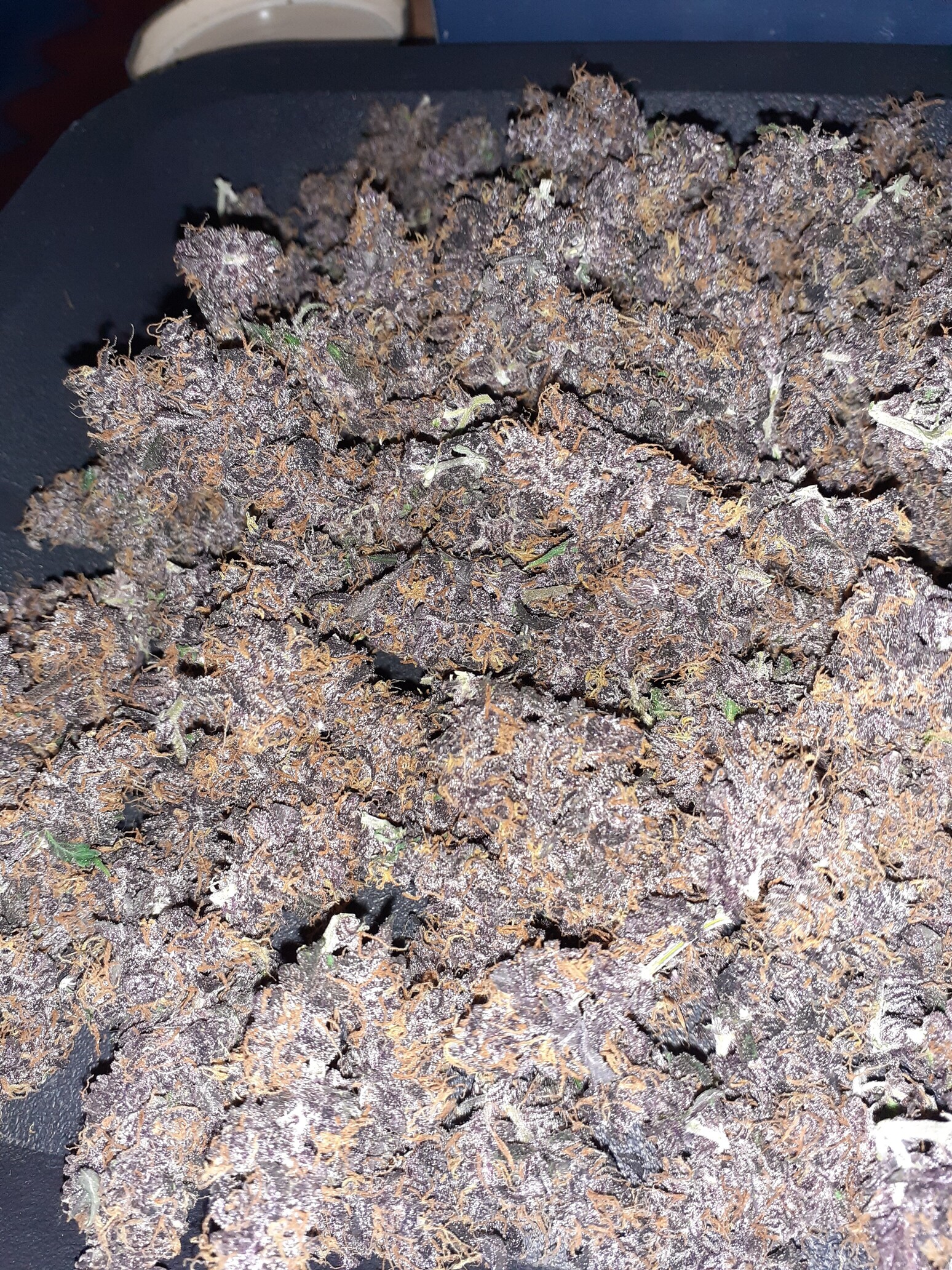 The harvest on my Mystery Seed, which I think may be the King Kong x Sapphire OG seed I propagated, yielded 1.75 ounces. I probably could have increased this with better training when they started growing wonky around week 5-6 of flower. Also I could have let them grow a little longer. I called them a few weeks early because the amber was creeping up on them. Effects are great a nice mood boosting body relaxing effect with with waves of paresthesia that start at the back of the head and work down the spine. Proving to be a good strain for my spinal pain!