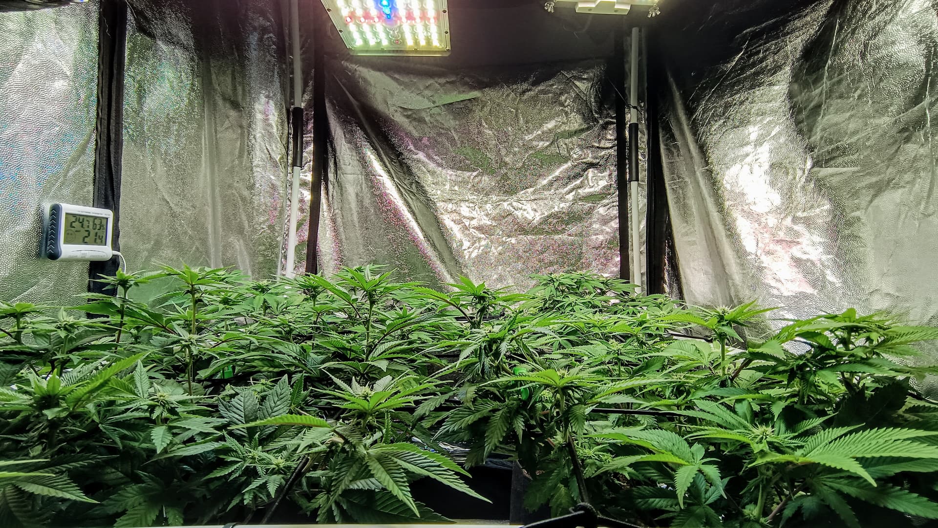 Hola @Ale65 que tal? Pues por ser tu primer Scrog la verdad que lo estás haciendo bien. Se ve genial! Si quieres un consejo, antes de que las flores se vayan madurando y creciendo, te aconsejaria de hacer una defoliacion y quitar todas las hojas más grandes que tapen o cubran las flores y ramas más bajas. Eso porque cuando las plantas empiezan en respirar o sea “respiracion aeróbica” las hojas sueltan mucha humedad y sobretodo entre las hojas debajo de los tallos que llegaron a pasar la malla y creando esa humedad si tienes las flores formandose puede que tenga problemas de botrytis. Entonces lo mejor que puede hacer Defoliacion de las hojas más grandes y cuando esten madurandose incorporar en tu armario de cultivo un deshumidificador para bajar también la huemdad relativa del cuarto de cultivo asi que tus flores se queden a salvo de cualquer moho o hongos debido a excesos de humedad.