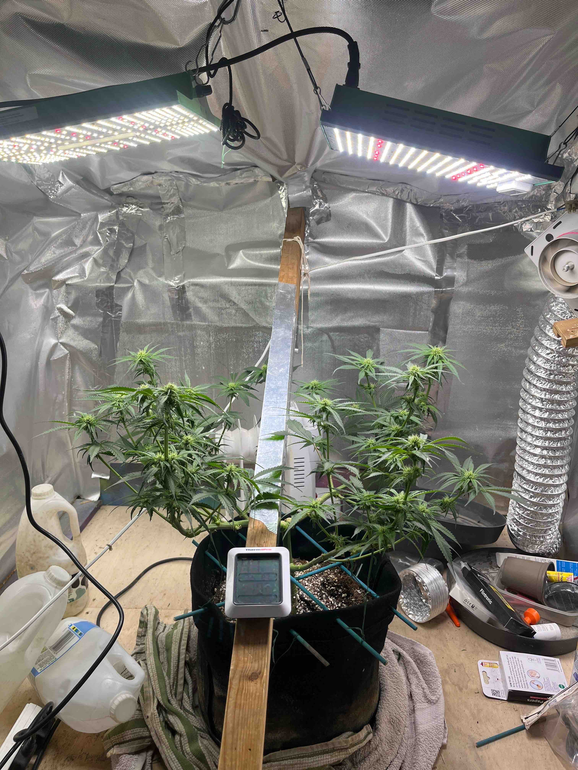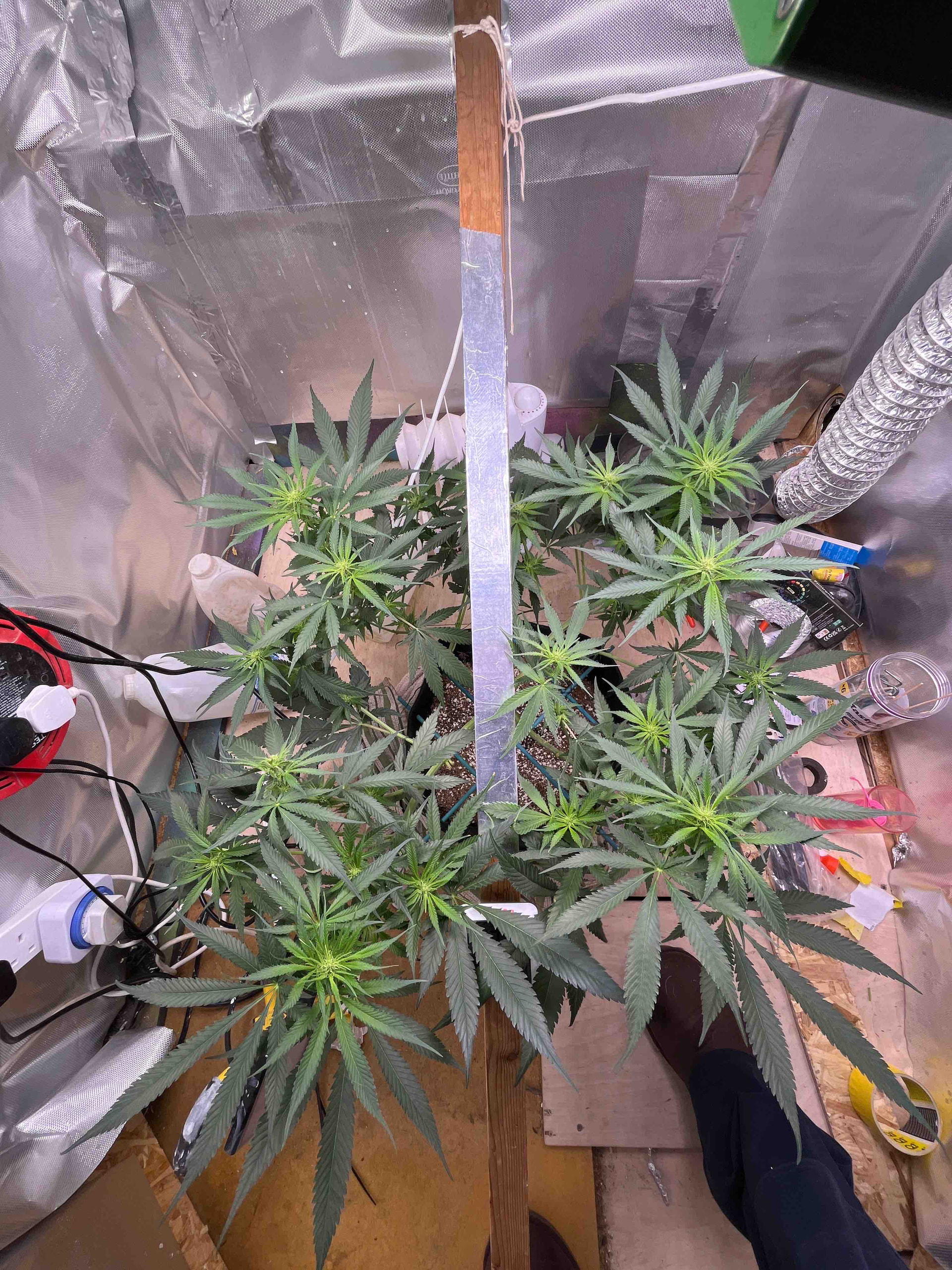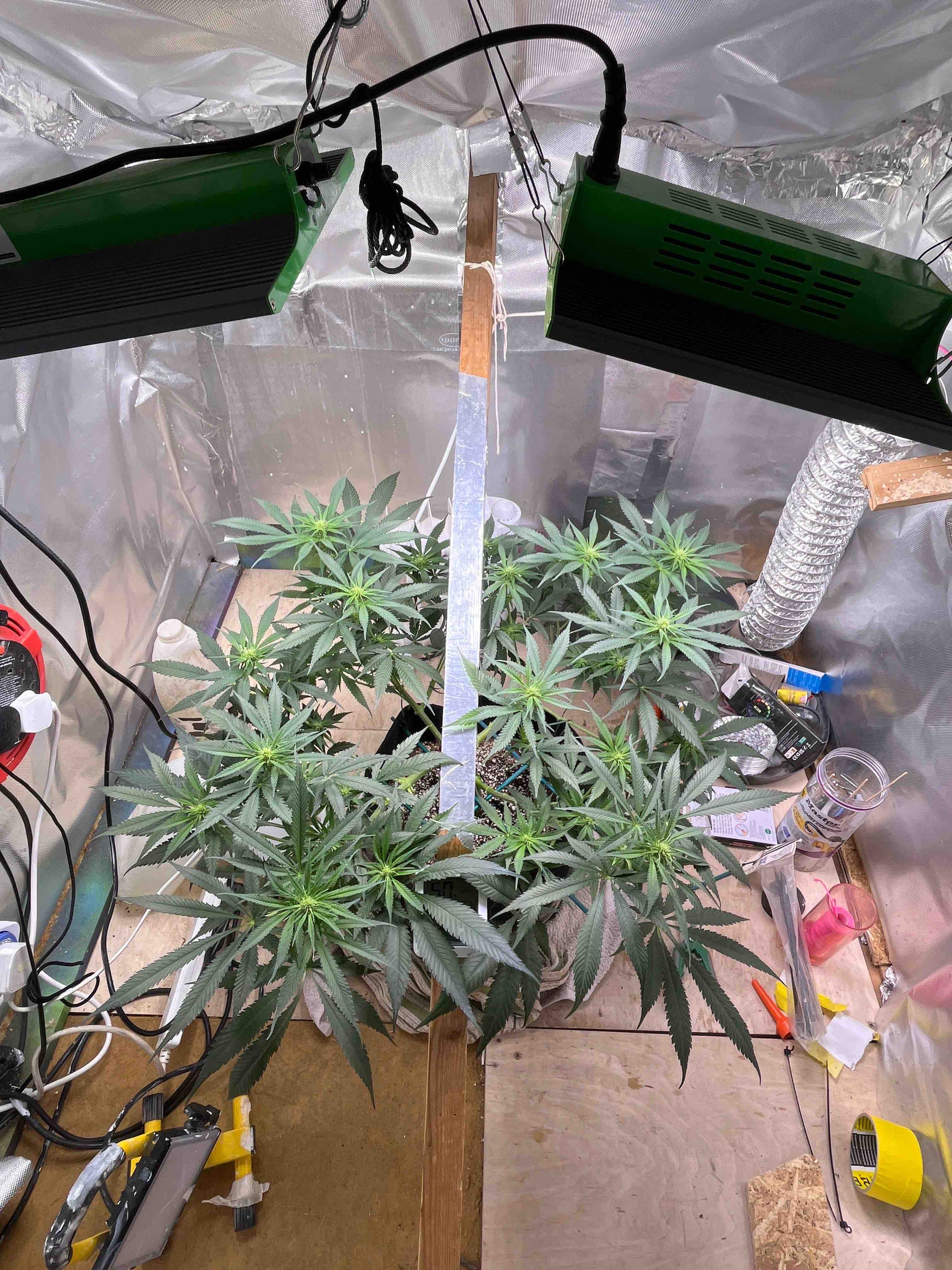 She’s now day21 of flower and after watching a Scotty real video I’ve decide to do a heavy heavy defoliation of the big fan leaves in hope that it encourages bud and sugar leaf growth . Ppfd is running high at around 8-900 but until I see signs of distress I’m gonna keep on running it high. Will do another update in 2 weeks