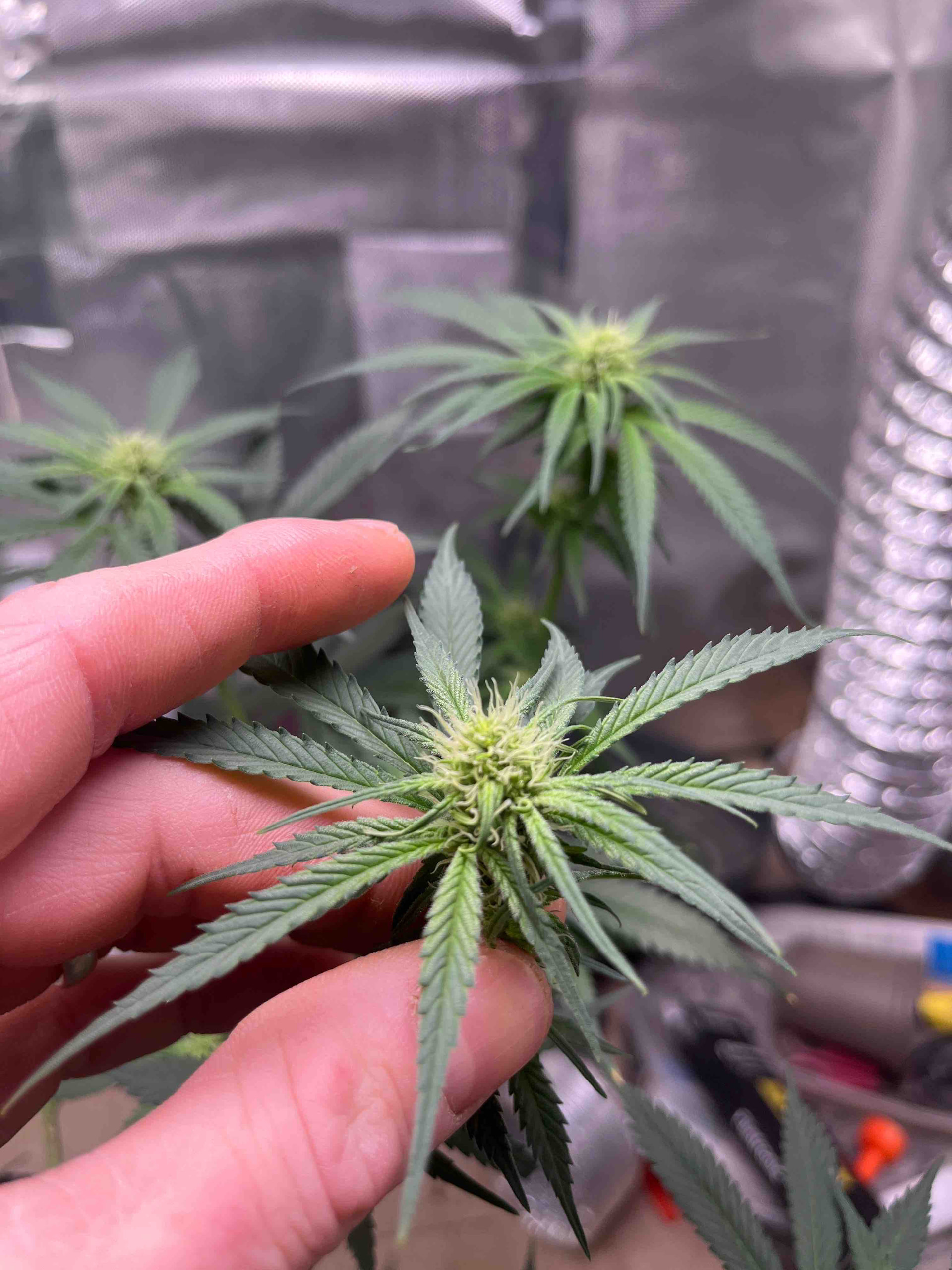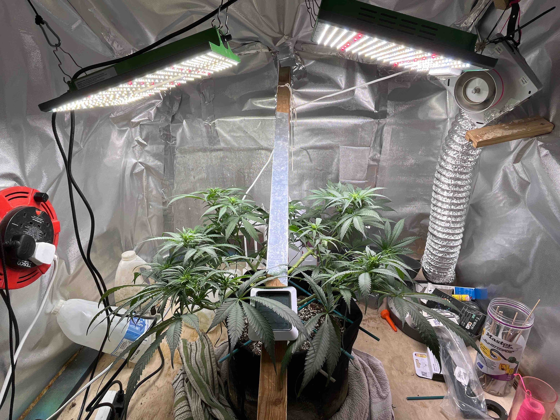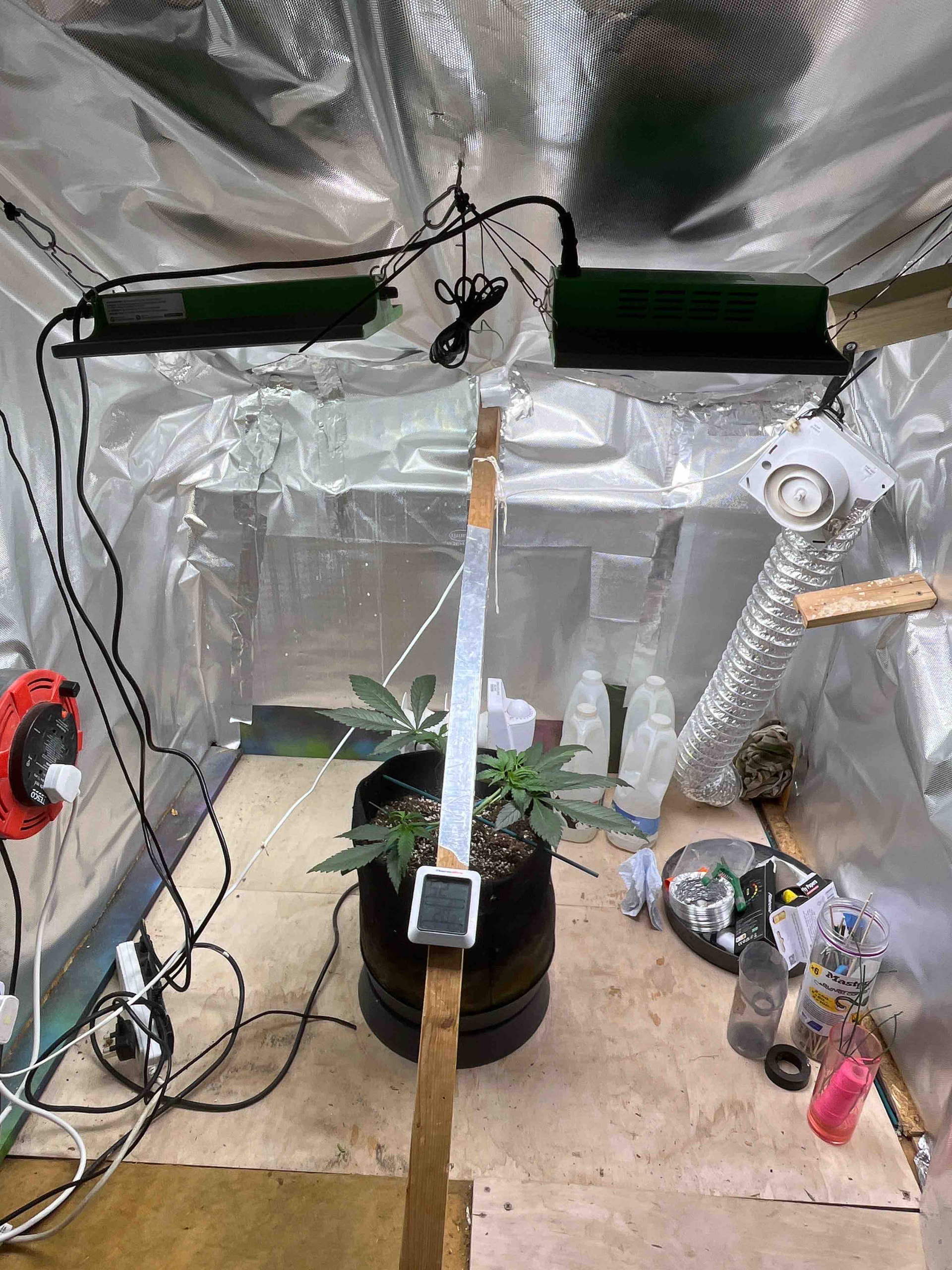 She’s now day21 of flower and after watching a Scotty real video I’ve decide to do a heavy heavy defoliation of the big fan leaves in hope that it encourages bud and sugar leaf growth . Ppfd is running high at around 8-900 but until I see signs of distress I’m gonna keep on running it high. Will do another update in 2 weeks