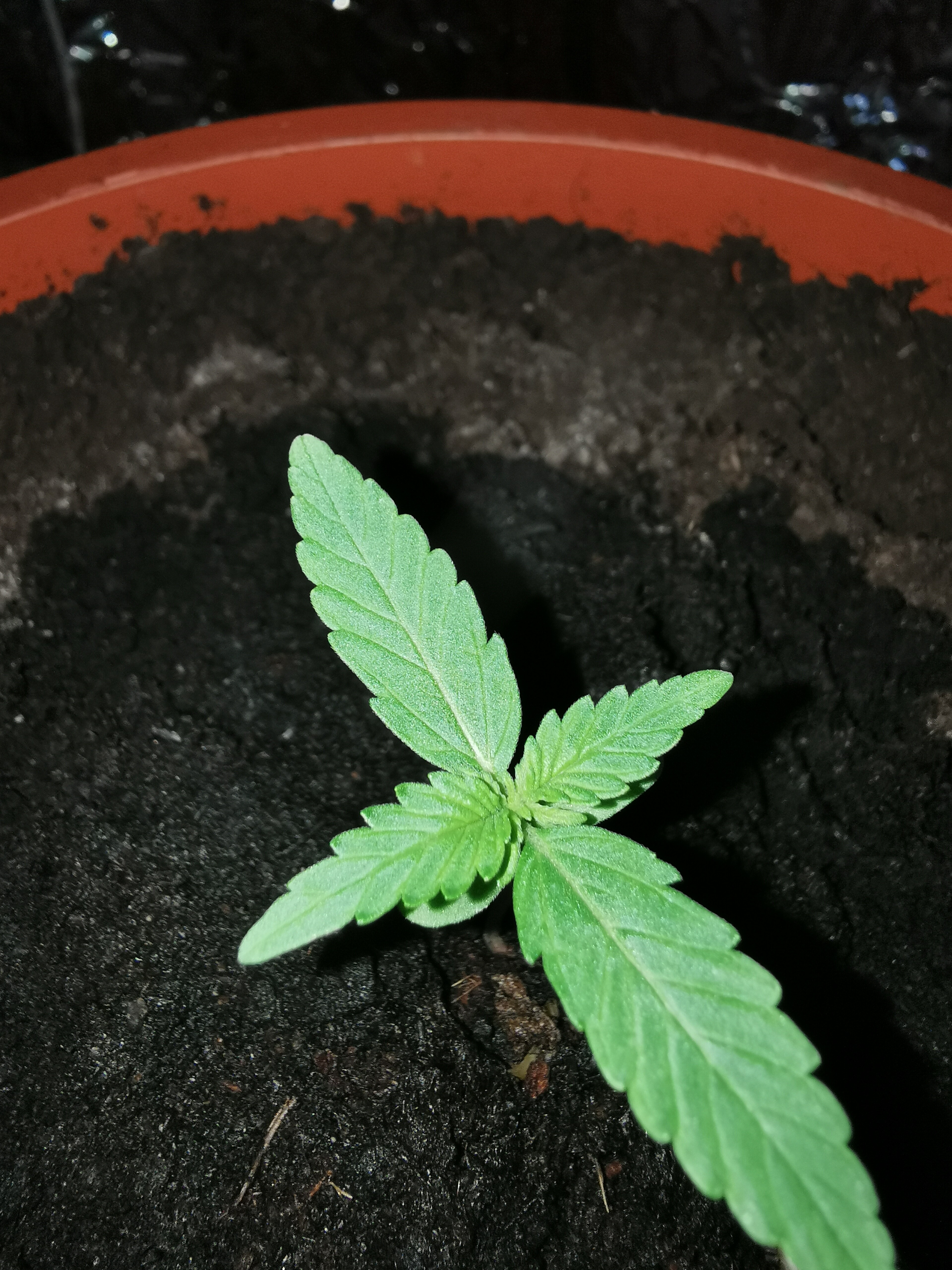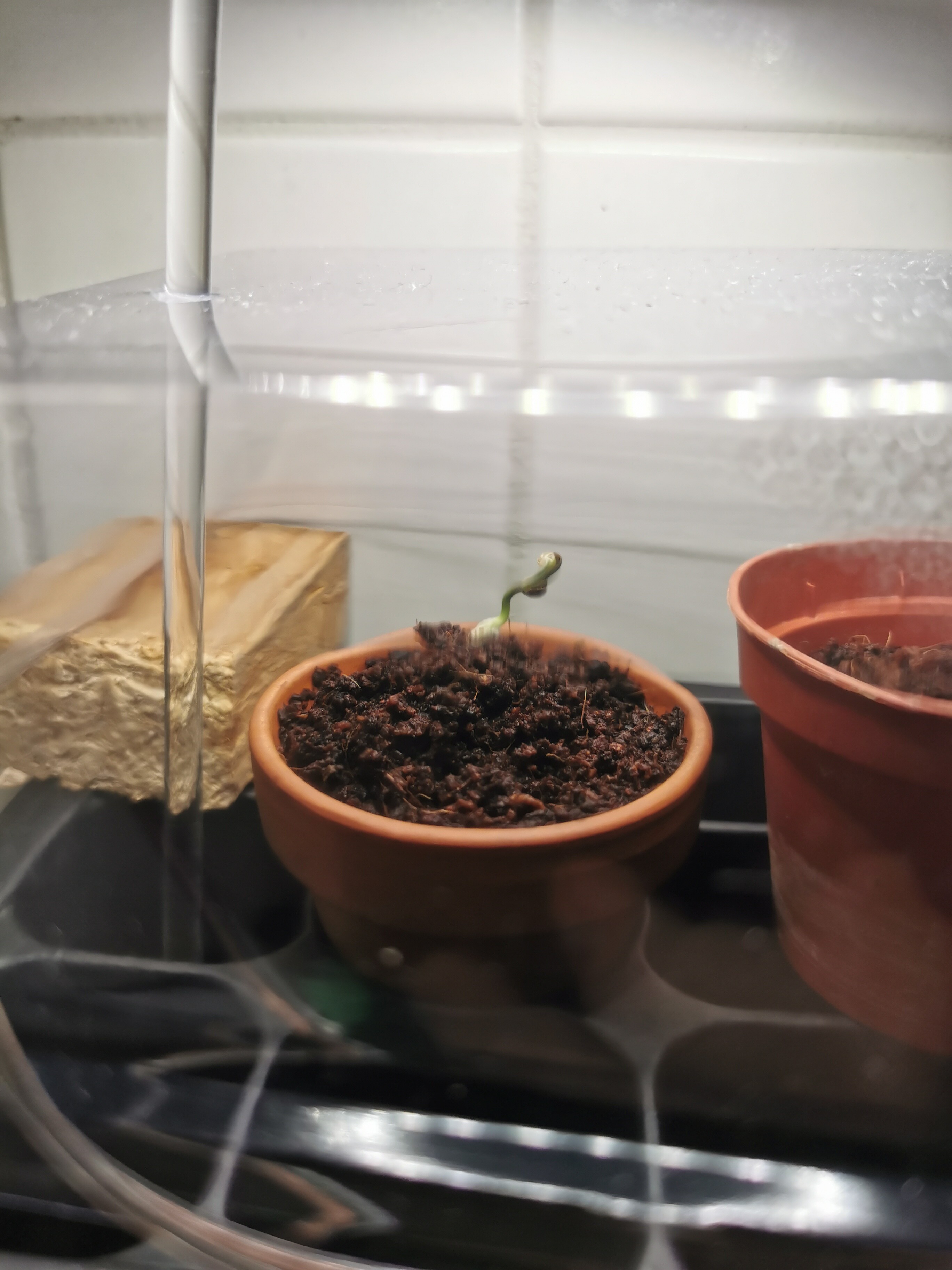 in the second the pic is a little blurry, is the seed casing off or still on, if it is still on the leaves cannot spread so you can help by removing it, gently. if it is stuck you can spray it with a little water and try again.