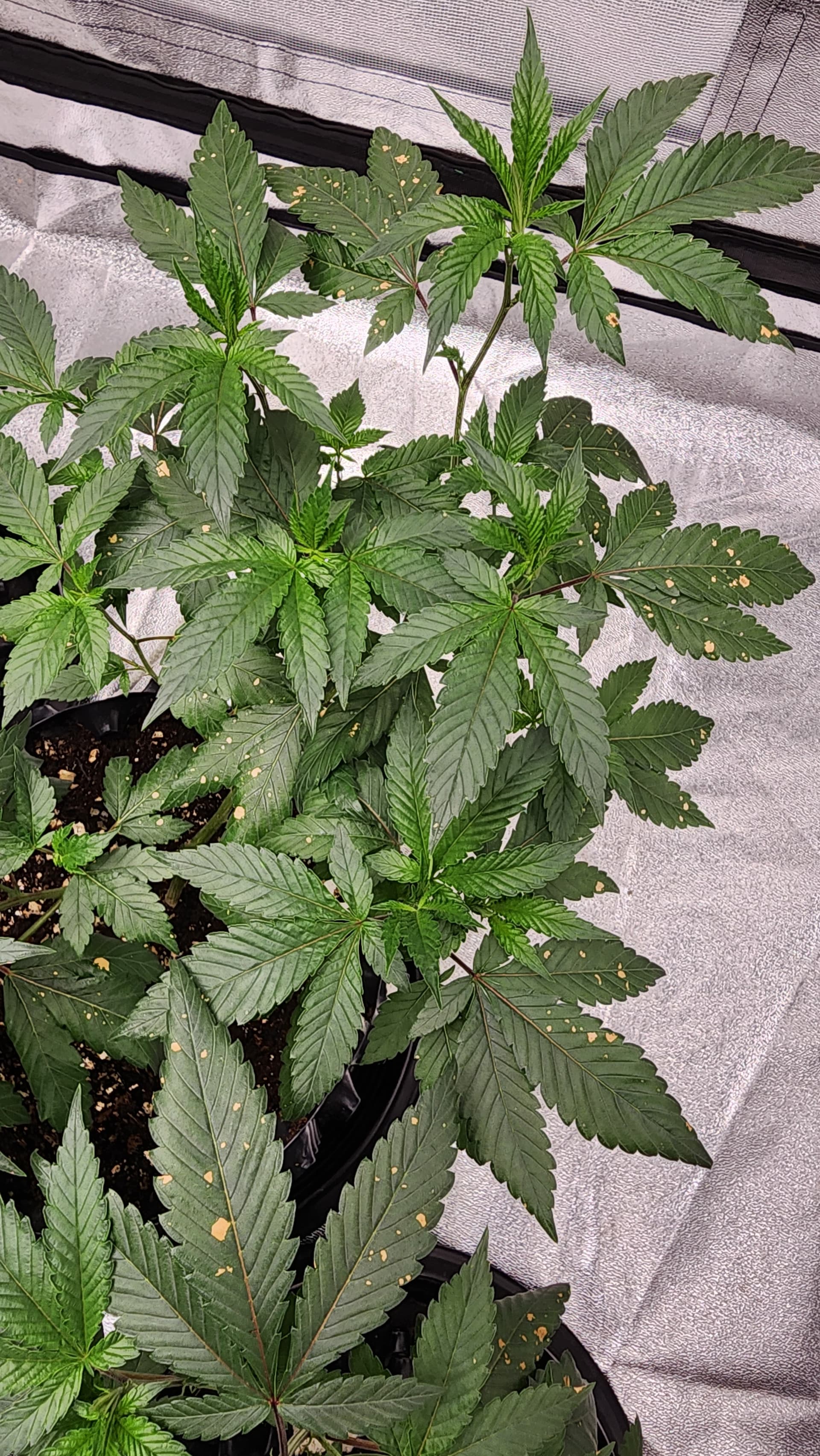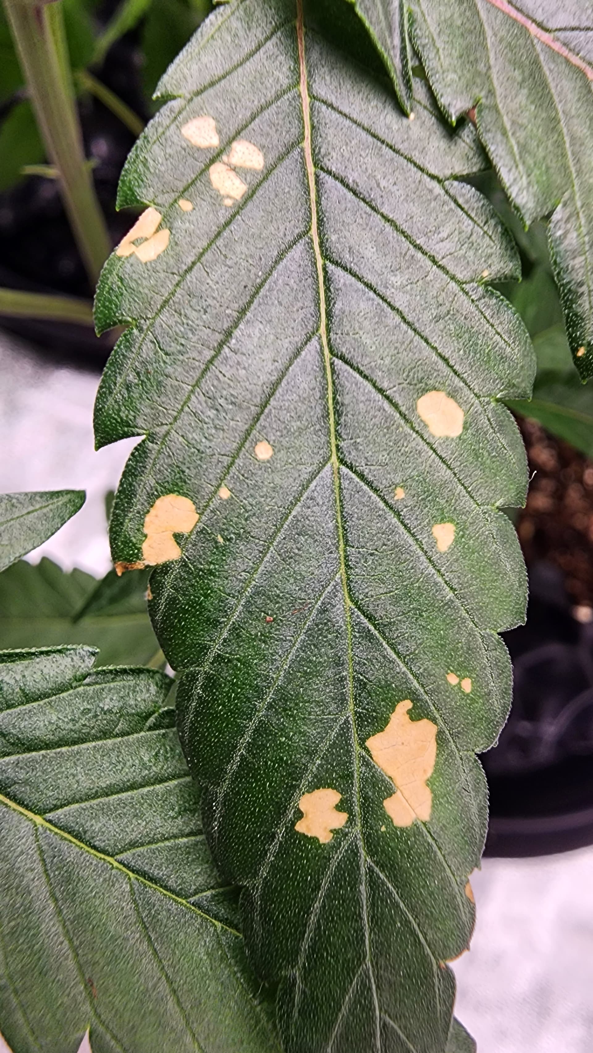The orange sport appeared on all 5 of my plants overnight. I attributed those to calcium/magnesium lockout due to the low pH at the roots. I already flushed the medium with higher pH and did some foliar spray with CalMag. The conditions didn’t seem to worsen over the past 24 hours. Any other thoughts on what this may be?