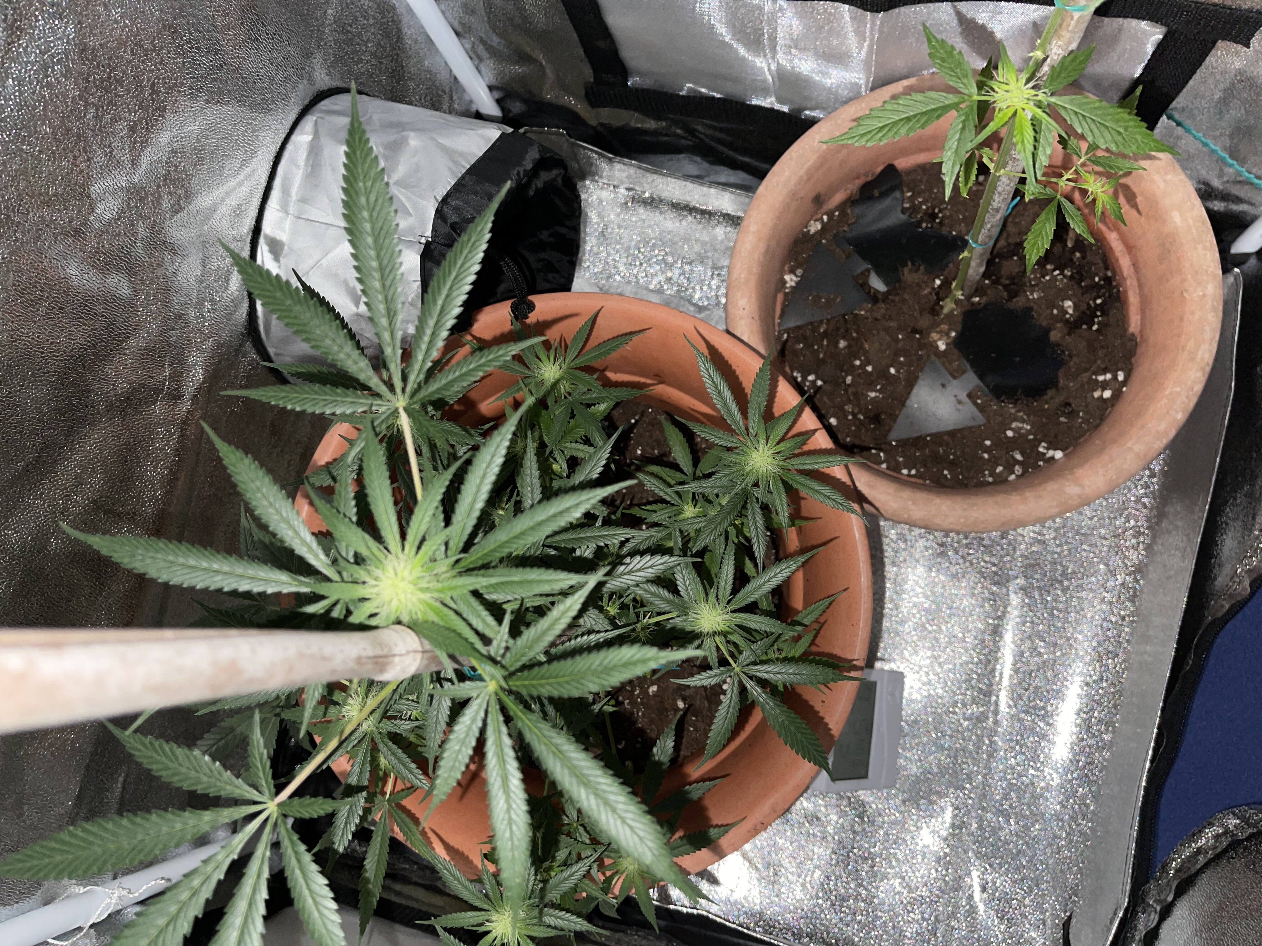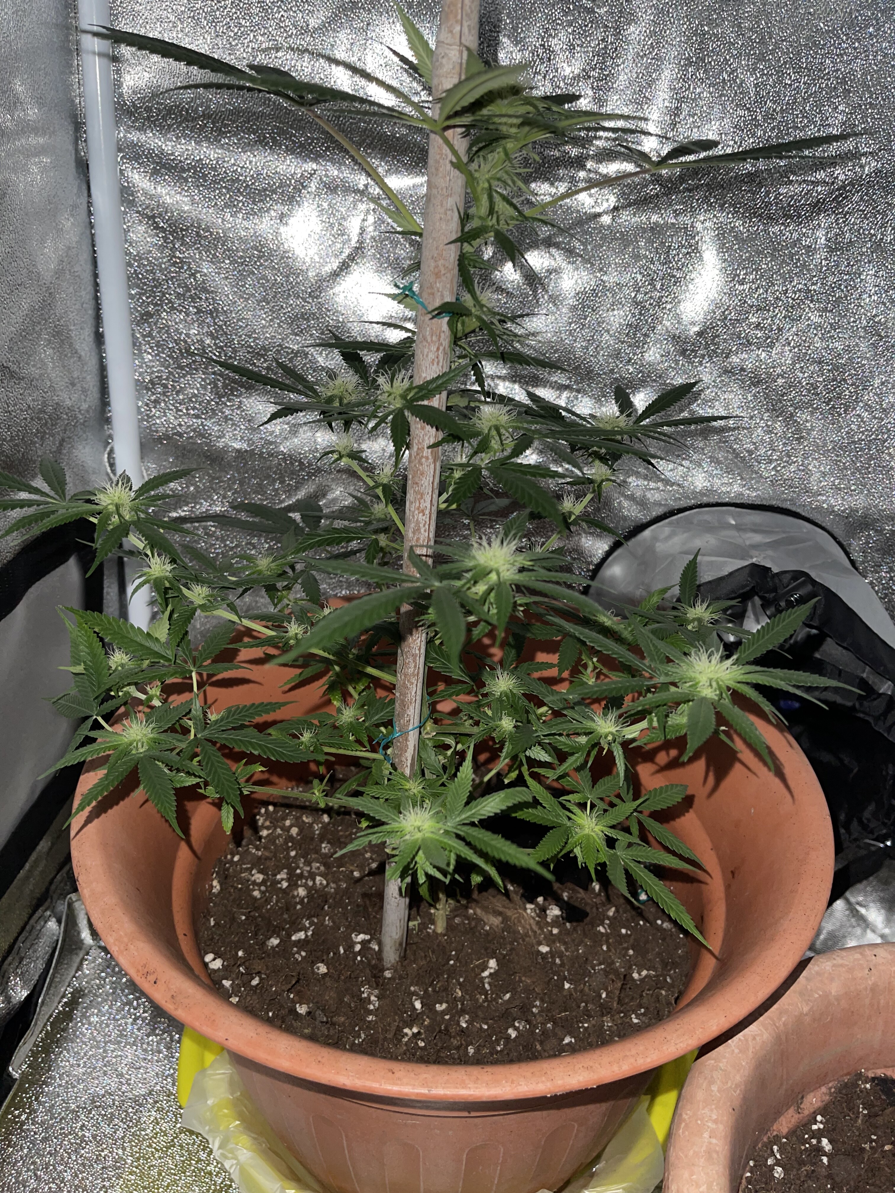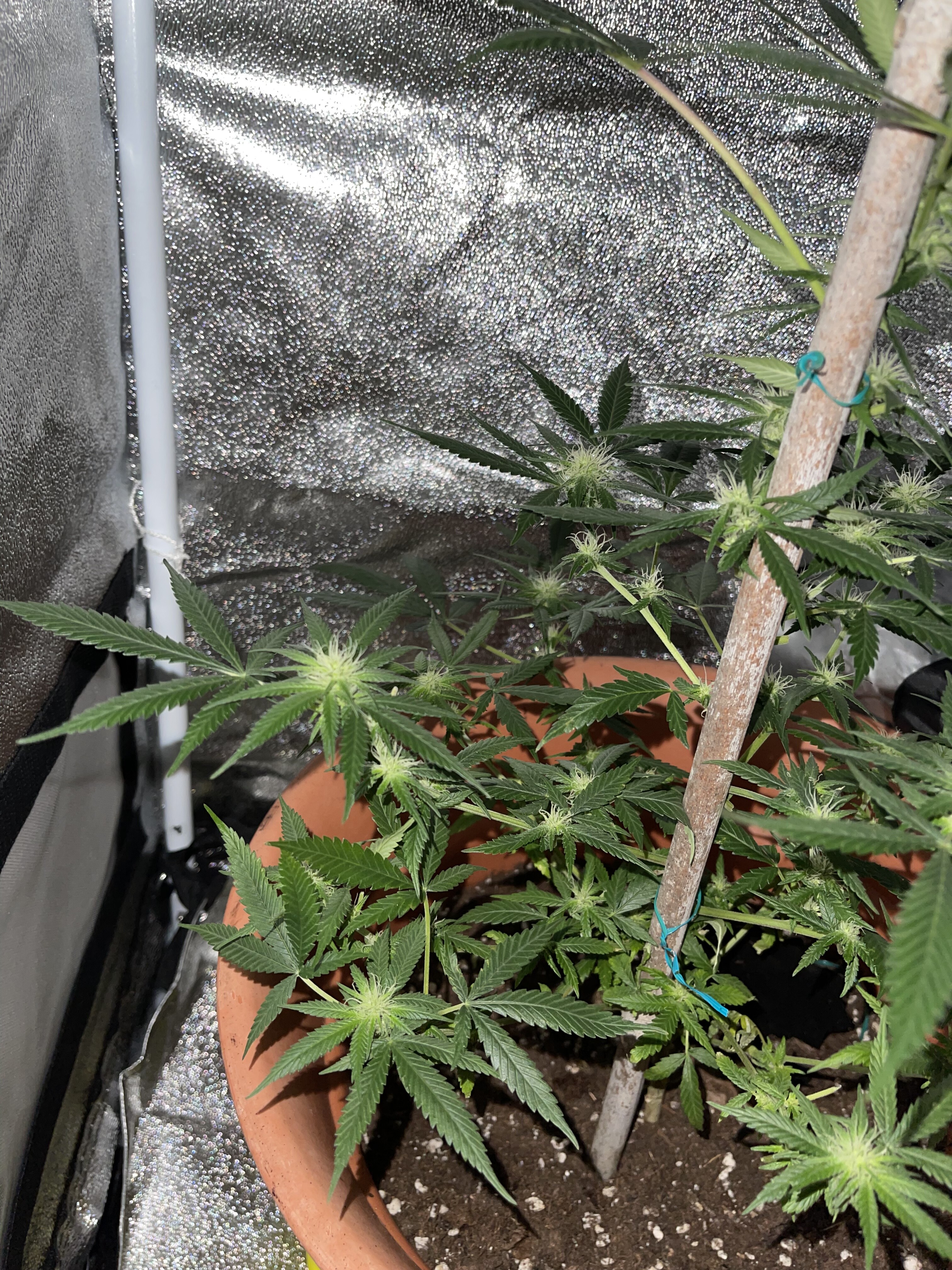Fem seed skywalker/Girl Scout cookie. I only have small grow space and is my first ever time trying to grow a plant so flipped her too flower early because of space. She hits 3 weeks flower sunday , I had a little mildew on few fan leaves so removed them and then removed leaves blocking bud sites.12/12 light schedule bio nutes and bio mix soil. I worry that I’ve over pruned and stressed her too much
