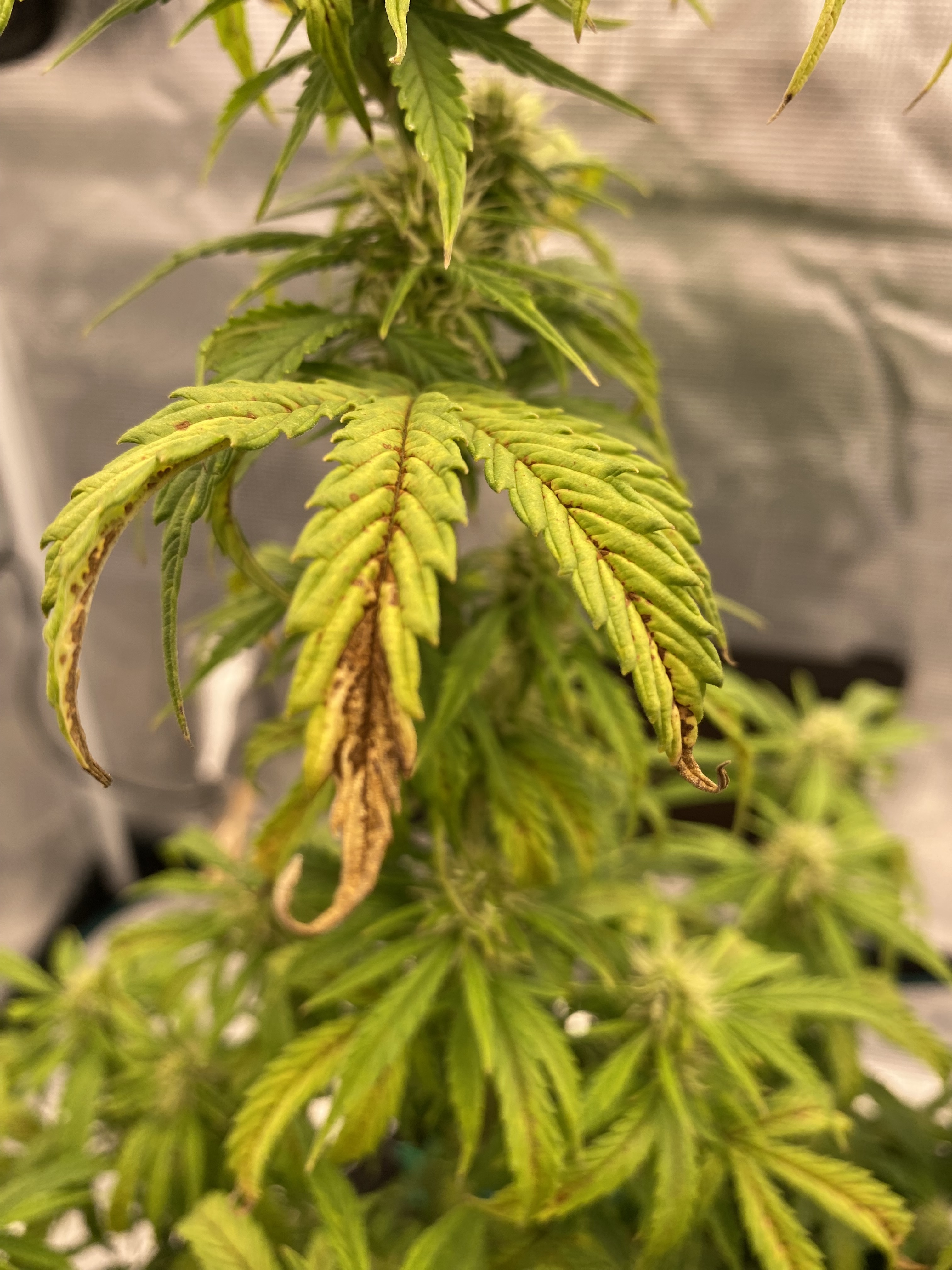The yellowing started as rusty looking spots mostly near the upper branches. It really got bad after the last two feedings that’s when the leaves starts yellowing and the tips started browning and dying but the light green color and dark green veins have been going on for a month or so. She is 46 days in.