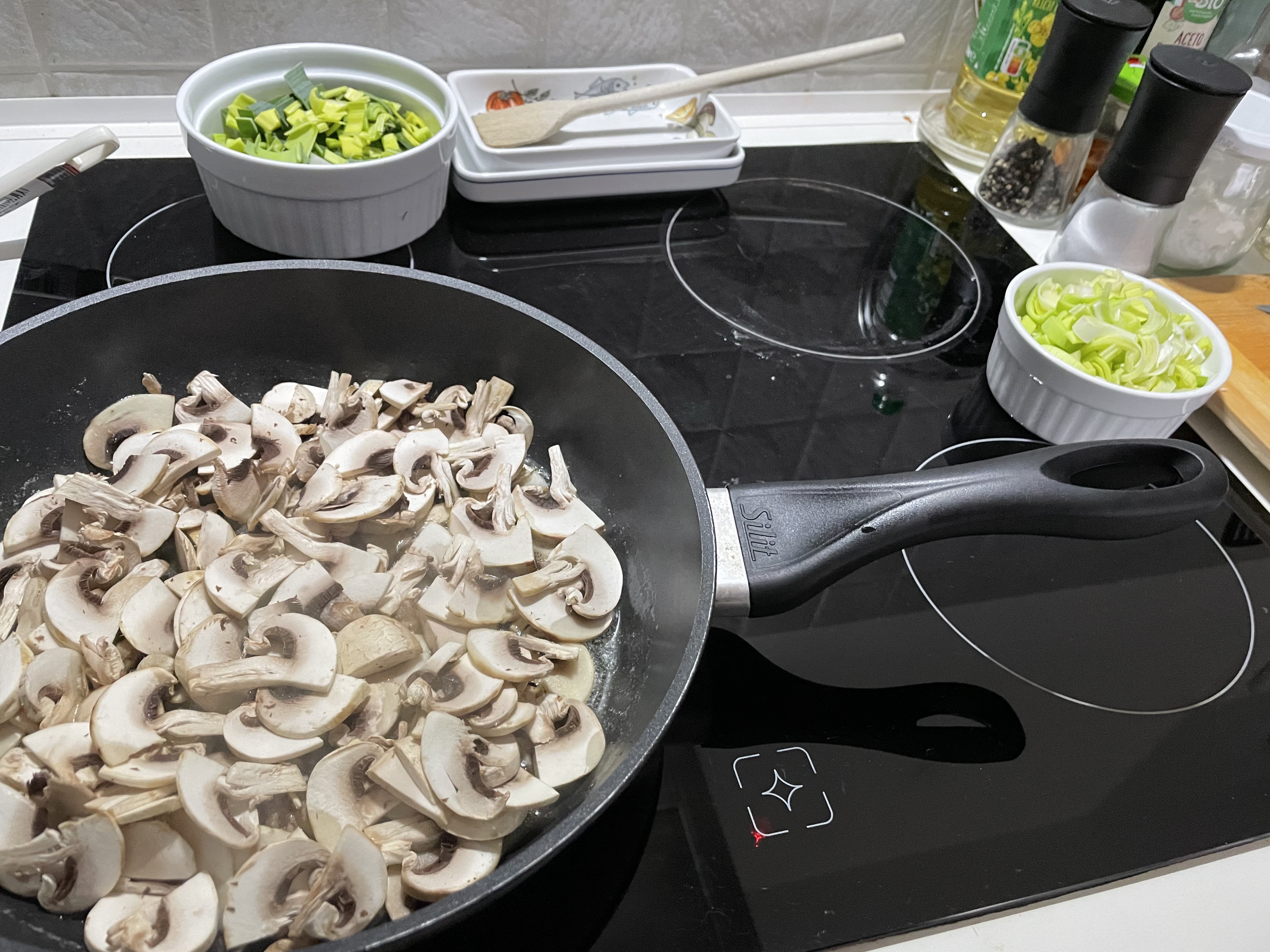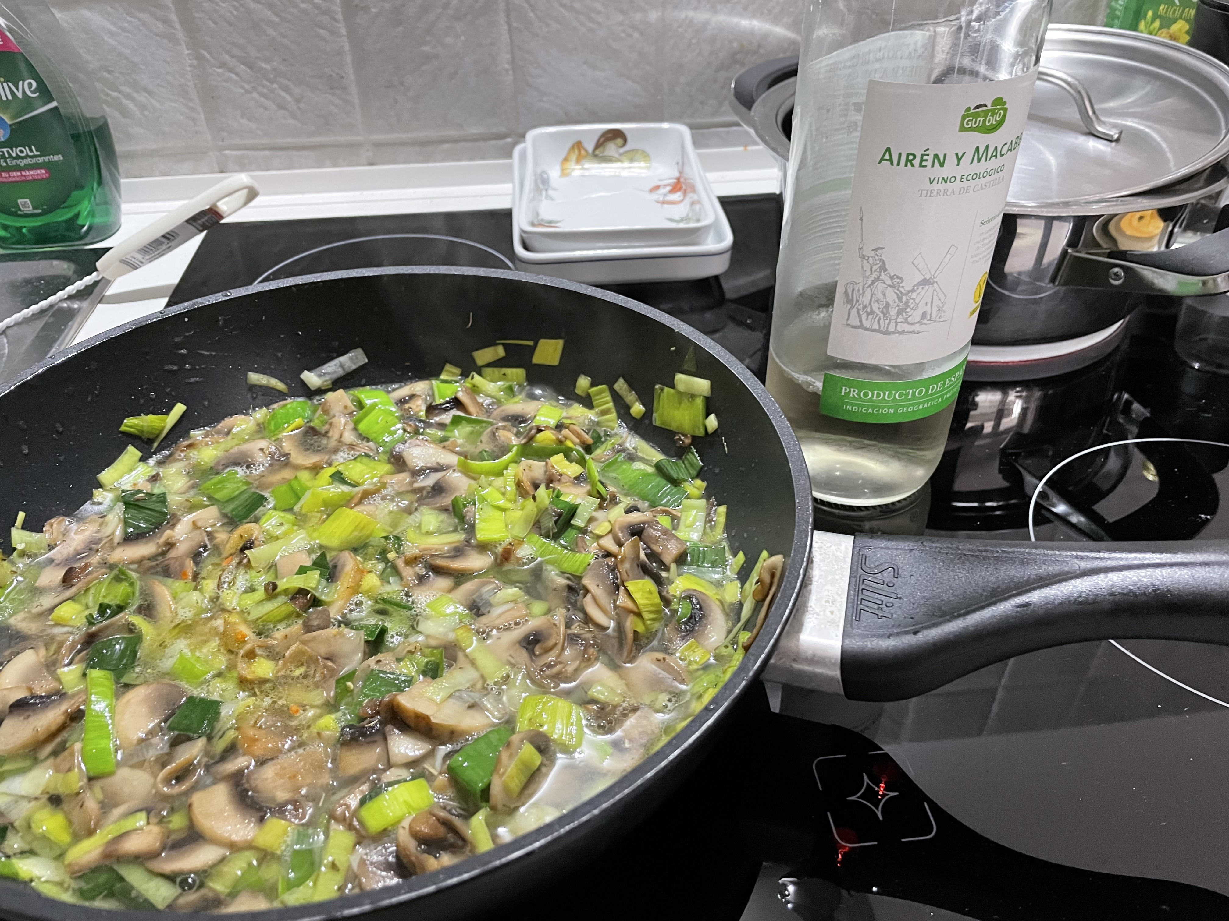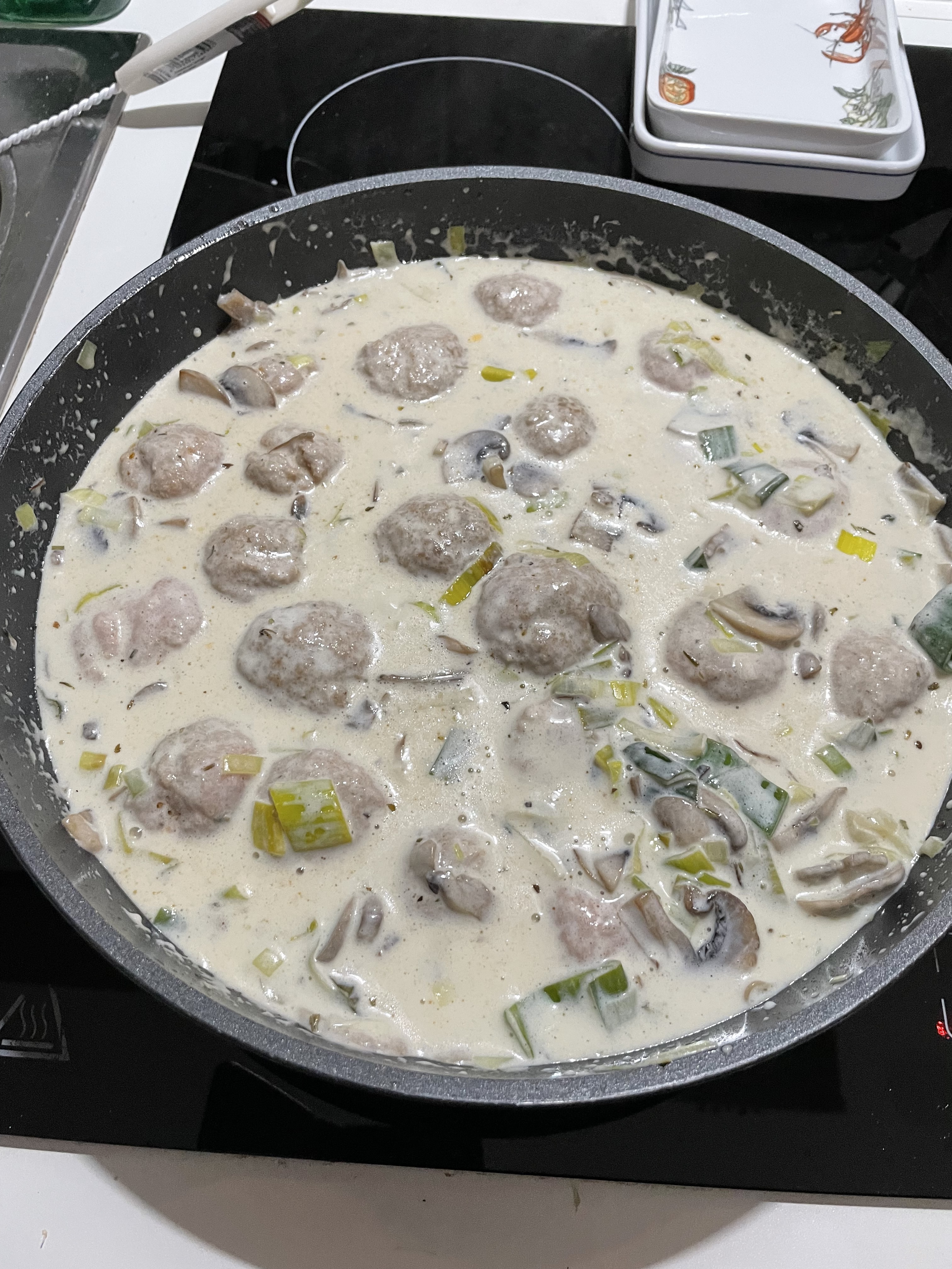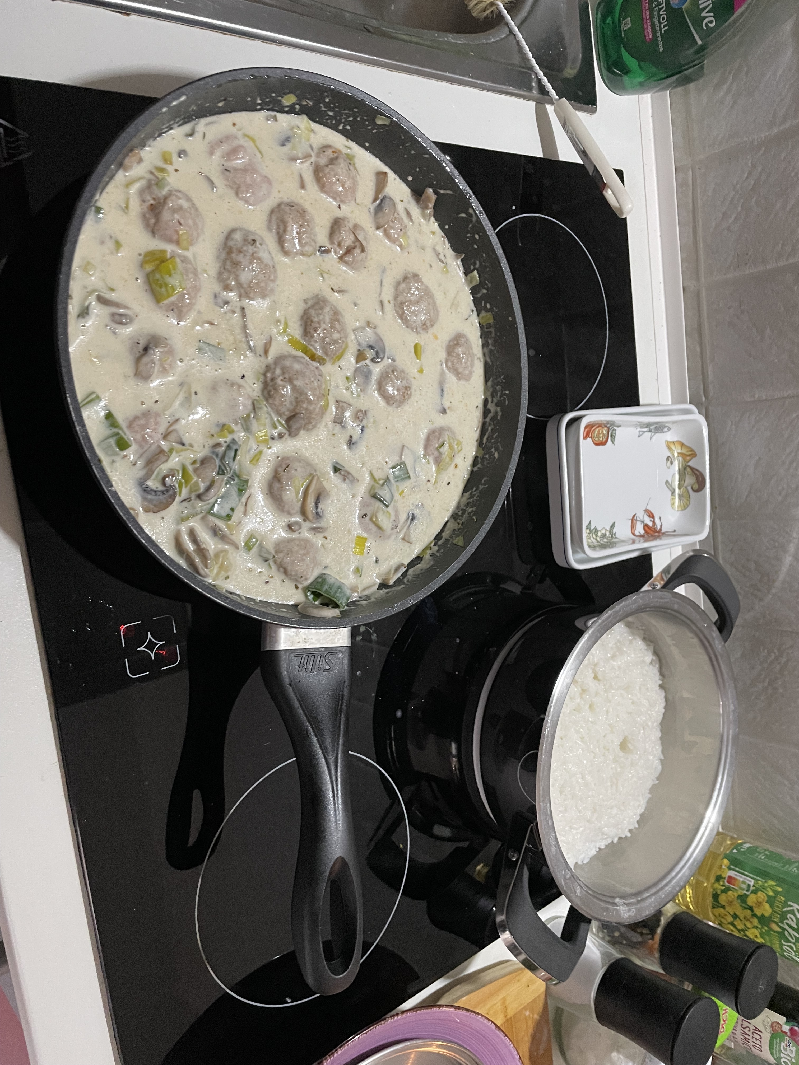 Rice with mushroom, leek, and cheese sauce on a white wine-cream base, with meatballs cooked in it. ![]()