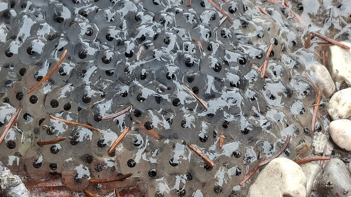 Those could be some; last week, I saw a few by our river that were already heading to their spawning grounds. I caught one for my children so they could look at it, and then I let it swim away. But they could also be from frogs. I’m not that familiar with it. A beautiful stream flows there; I almost feel at home.