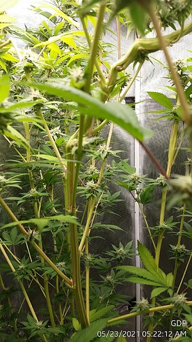 I have a Canteloupe Haze that has outgrown its environment. The light is as high as it can go already and she’s touching it again. Just now in early flower.