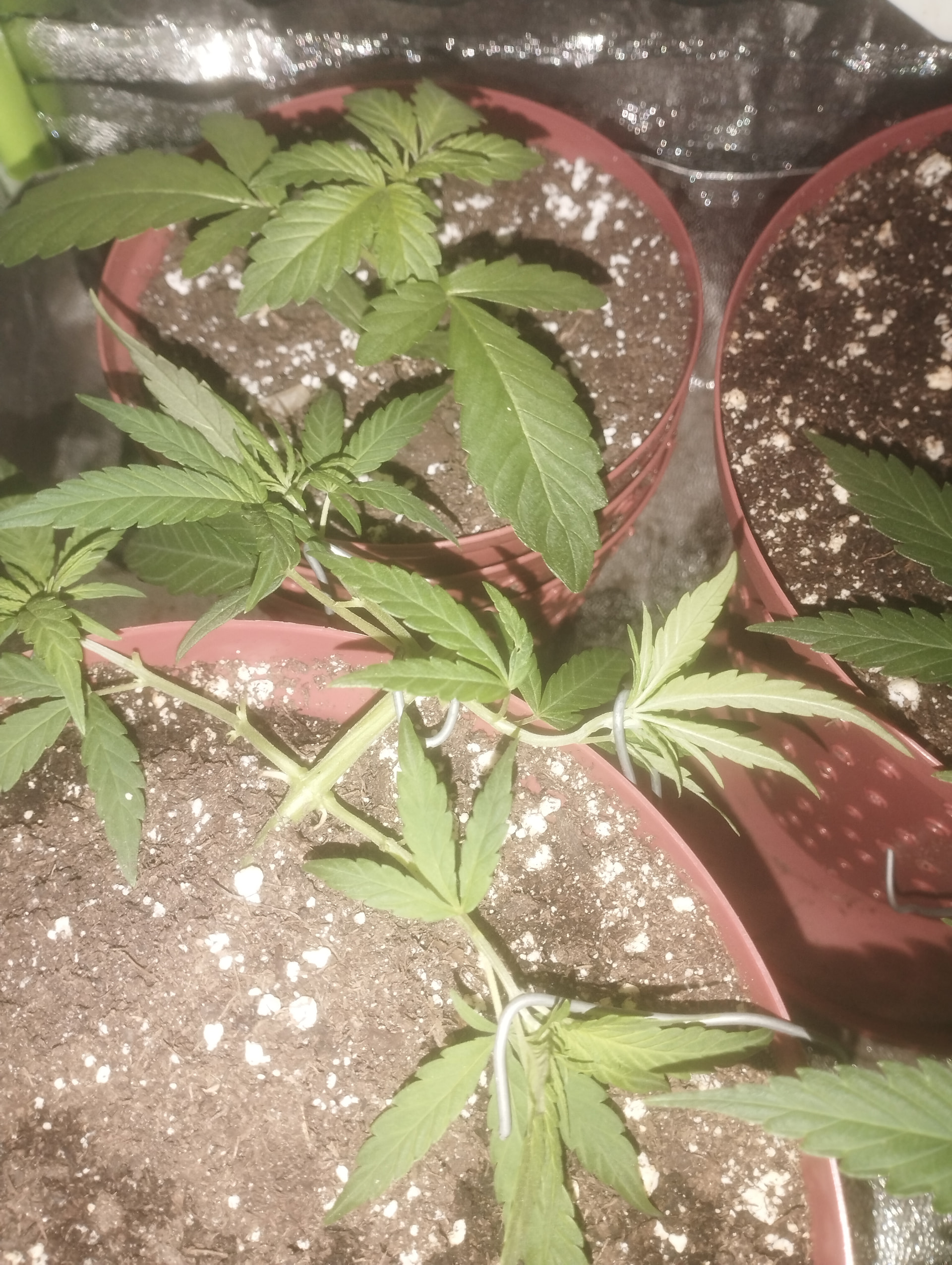 it’s the one in the lower left corner with 4 apical colas and aggressive LST due to a 40’x40’x1.20’ tent… let’s hope to make magic in this small tent. I will be uploading the entire process and the watering and nutrients I use over time, it’s worth mentioning that we were very lucky, of two I put to germinate, one stayed in the process of opening cotyledons and burned, and the other one, well, here you see it, and guess what? Good news, before the apical cut I was able to notice that this regular is female ![]()