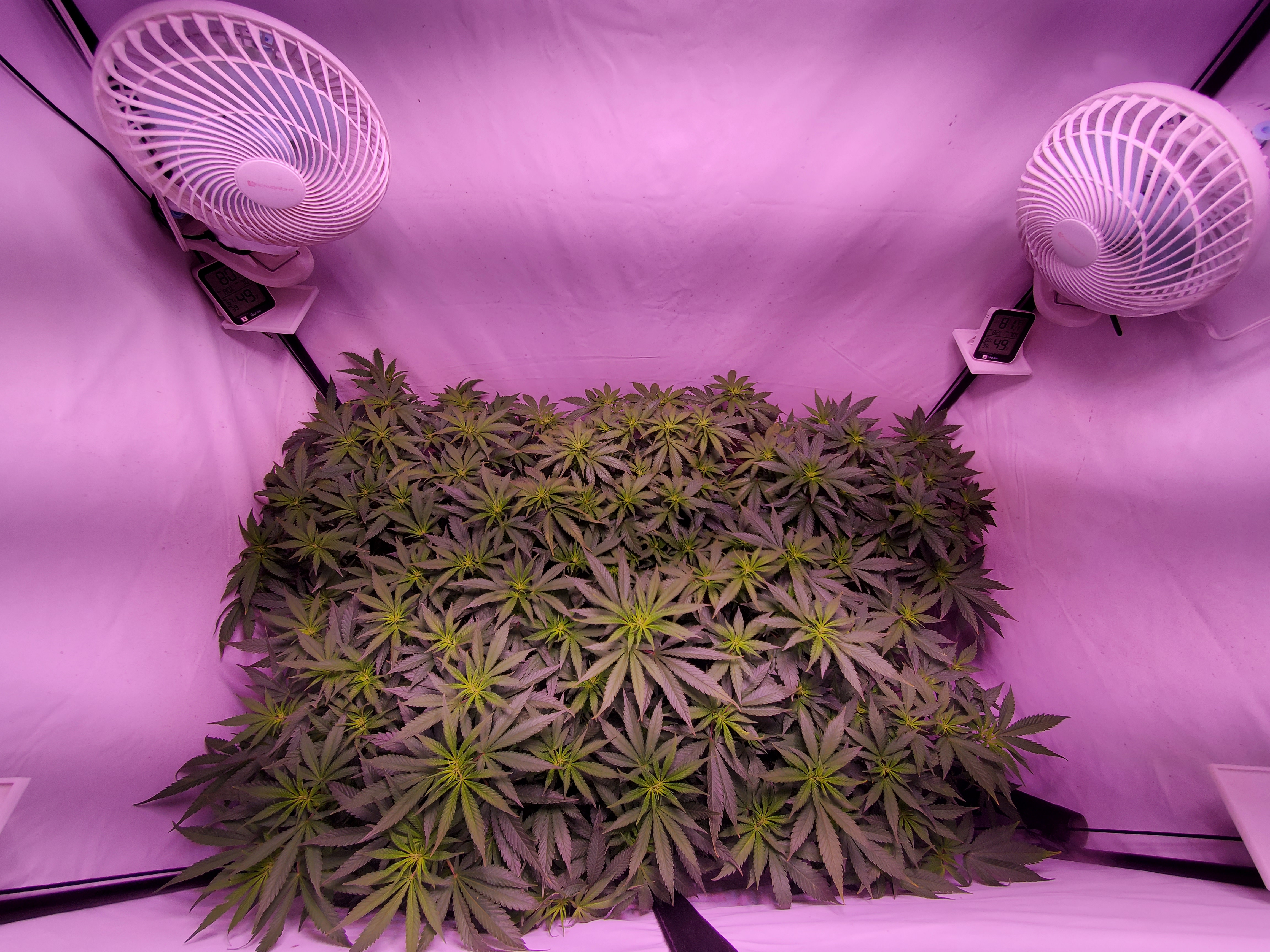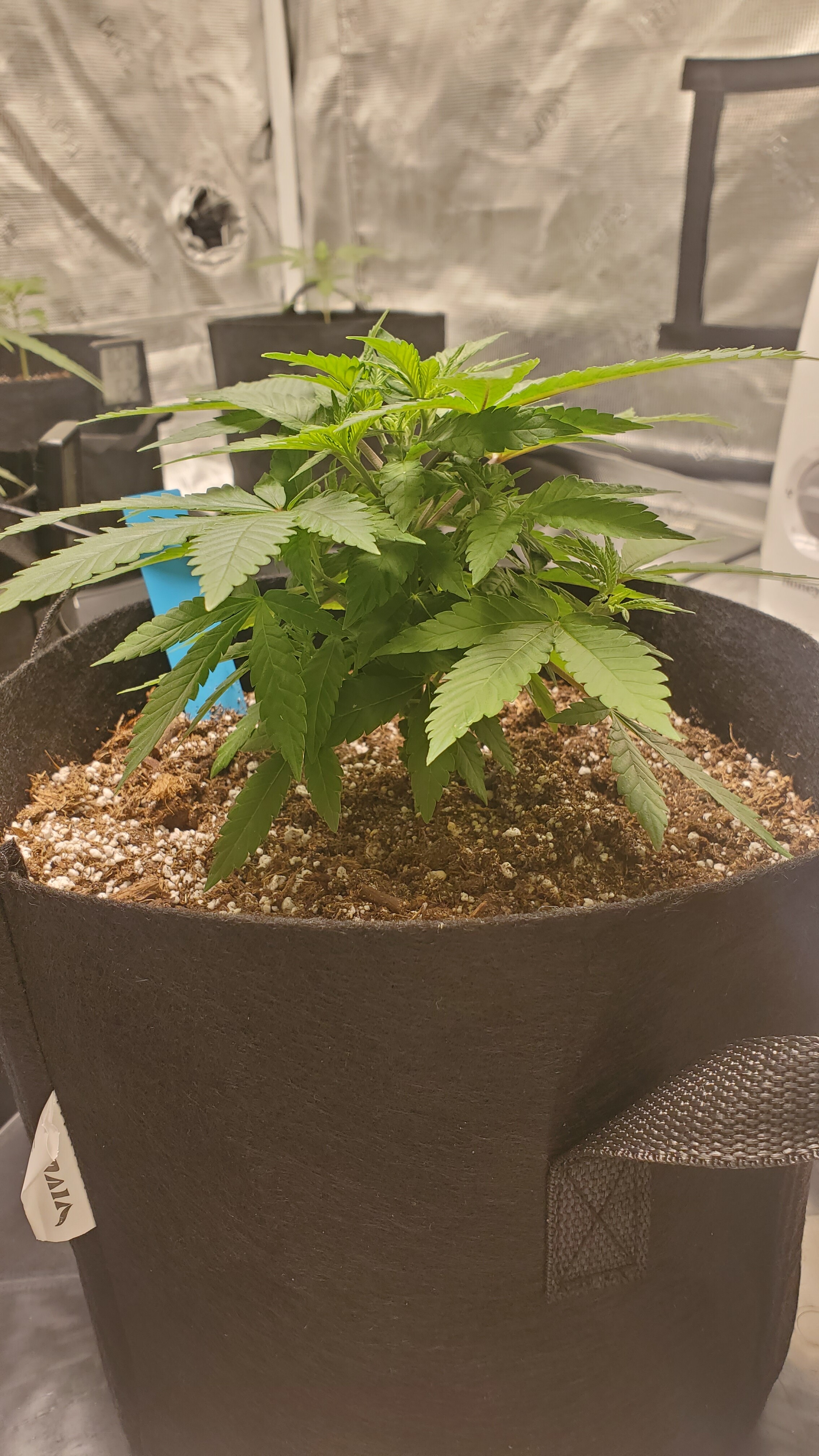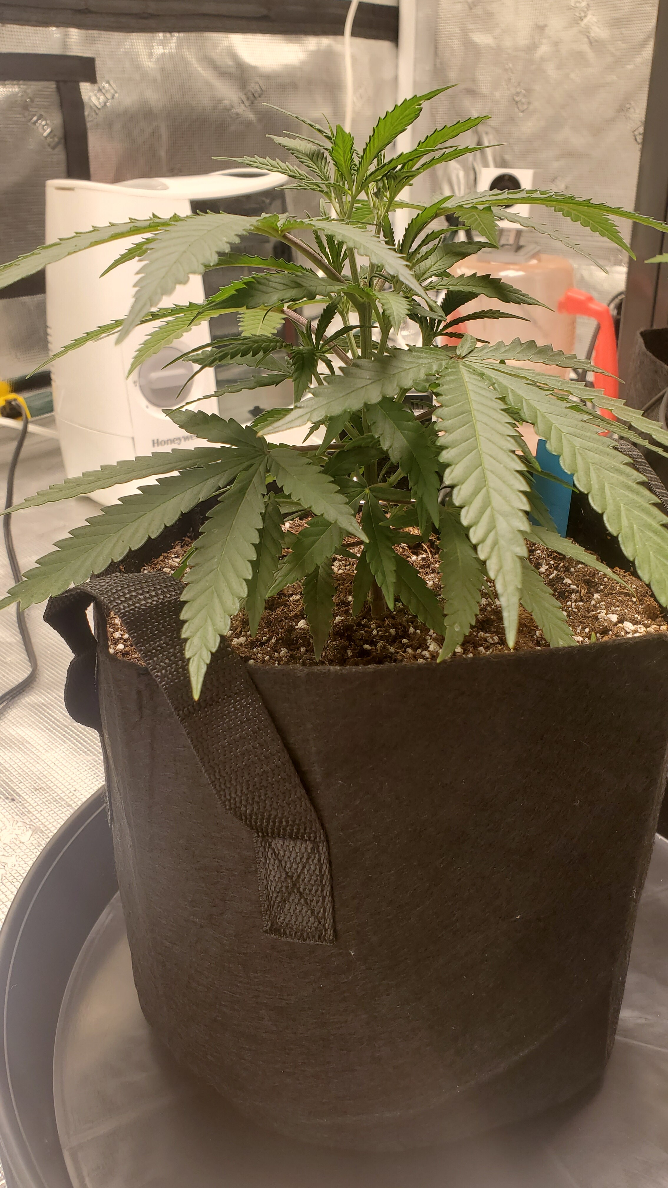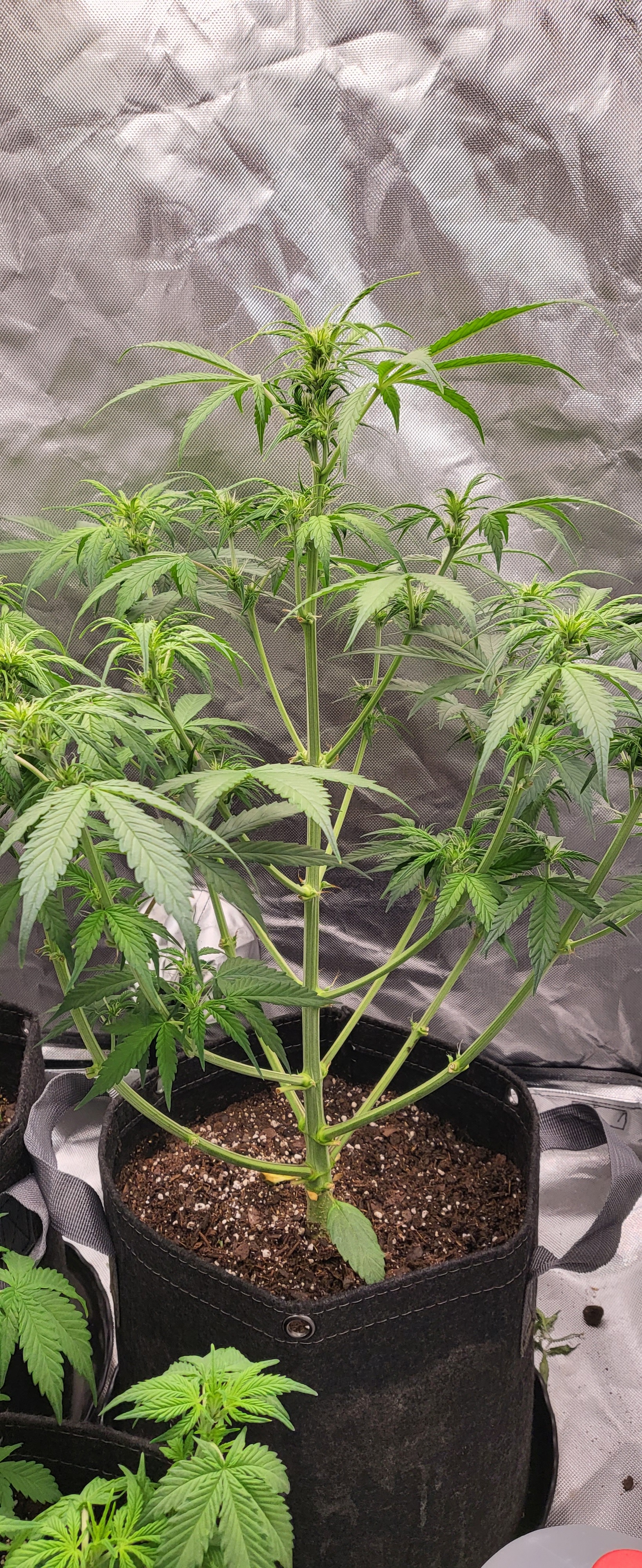 Hi All! These 2 plants are about 3 weeks into veg. The taller gorilla glue is about 6.5 inches and the Bruce banner is about 5.25 inches. The Bruce banner is very bushy and the big fans seem to be blocking out the bud sites below. The gorilla glue is also some what bushy, but not like the bb. Just wondering if I should snip some of the big, older fans yet? The pics uploaded wrong. The first and last pictures are the gorilla glue.