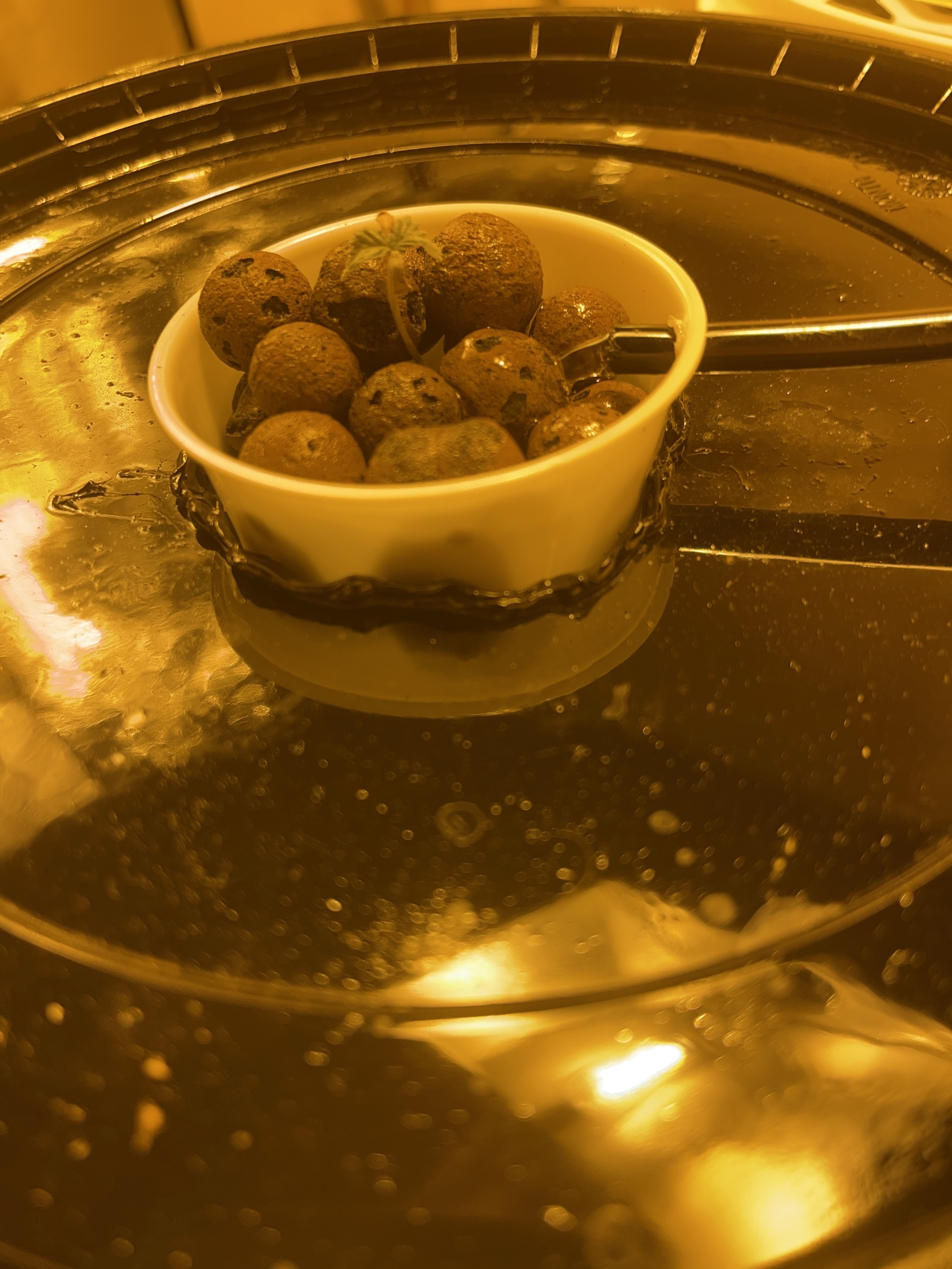 Is that a constant water feed above the plant. If so, you’re going to want to stop that. With my seedlings I keep them in a dome until the roots are popping from the root riot cubs. The water under your pots will keep the root environment close to 100% humidity, twice a day I’d top feed. Some people have this set on a timer. Constant water at this stage will drown the plant. I also keep humidity above 90% until they go into the grow room. Keep you VPD between .93 and 1.10 until flower. (Example 77F and 70Rh is about .95VPD)