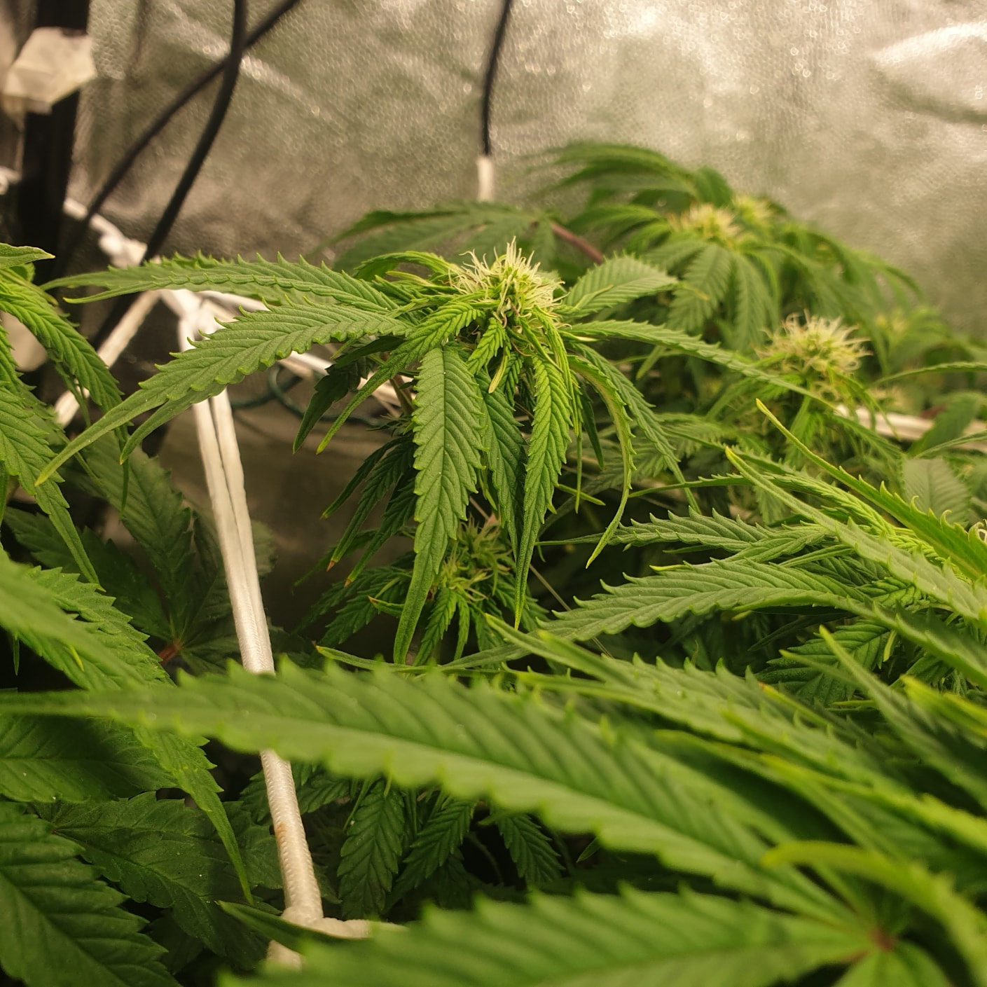 , it seems to me that it has transpiration stress: - VPD (it’s usually normal, yes! but it shouldn’t be…. Maybe a fan blowing between the panel and the canopy of each one could be the solution, it doesn’t hurt to try…. that’s why the leaves are sad, droopy, and serrated at the tips… I’ve seen it in my grow and it’s entirely due to the relative humidity in the environment or (VPD) which is kept in check with certain regulators and thermometers… that would be more pro grows where pure Co2 and VPD control are used, they need between 55-45 in the flowering stage but my experience speaks and it’s more about the grower’s eye and genetics, no plant is the same as another, they all respond differently….try to raise the humidity or you can raise the LED but maybe it won’t help much with the bud fattening​