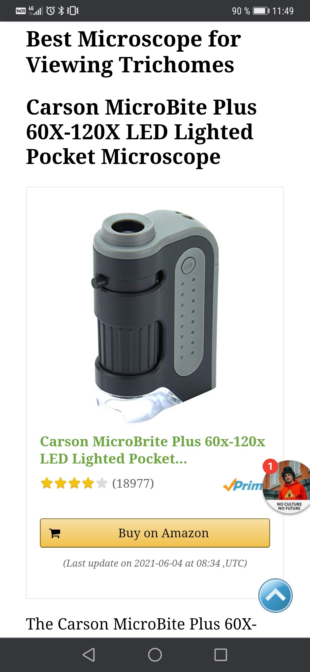Yeah that’s the same scope I’ve been using for the last couple grows! Won’t lie it can be tricky to use at first but I normally take a small sugar leaf from the top flowers and set it on a table and examine it and when I see amber on the sugar leaves then I start zooming in on the flowers themselves, best way I have found is with the scope in your steadier hand use your other hand to wrap the lower half of your hand around the bud and use your index finger to wrap around the scope to keep the flower and scope steady, takes a little practice but gets good clean views of the trichs! @Nitrous