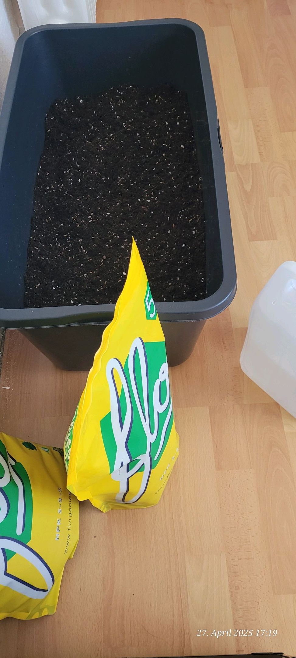 Nun fehlen nur noch der Feststoff Dünger . Da knalle ich 3 liter von rein , dann kann das aktivieren , oder sich auf puschen und damit komme ich am ende auf dann ca. 33 liter und damit mach ich die 18 er Töpfe voll . Unten her etwas Drainage und obenher Mulch und voll sind die Kübel . Auf 28 Liter , 3 liter Flo Dünger bringt mir um 10 % plus der Rest der eh schon munter in der Erde drunter .