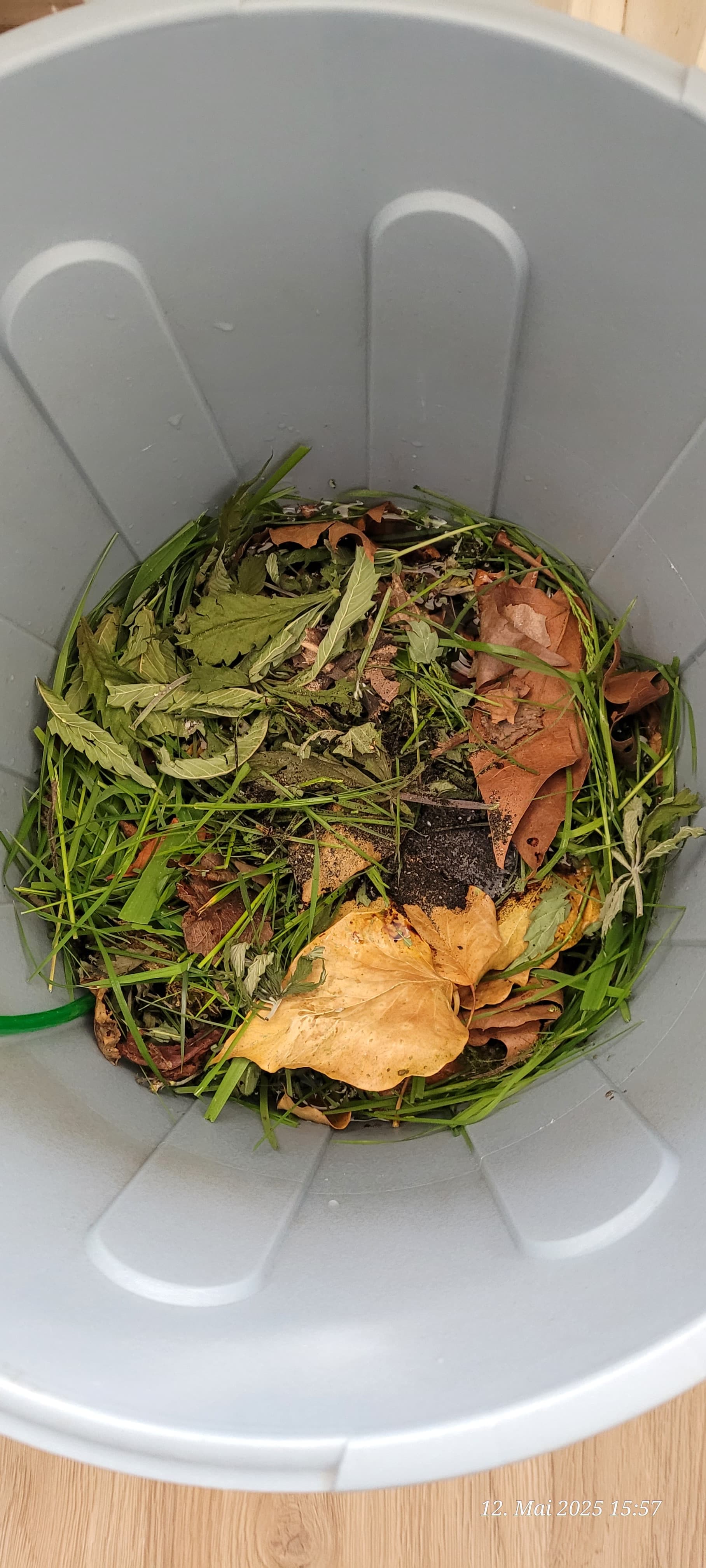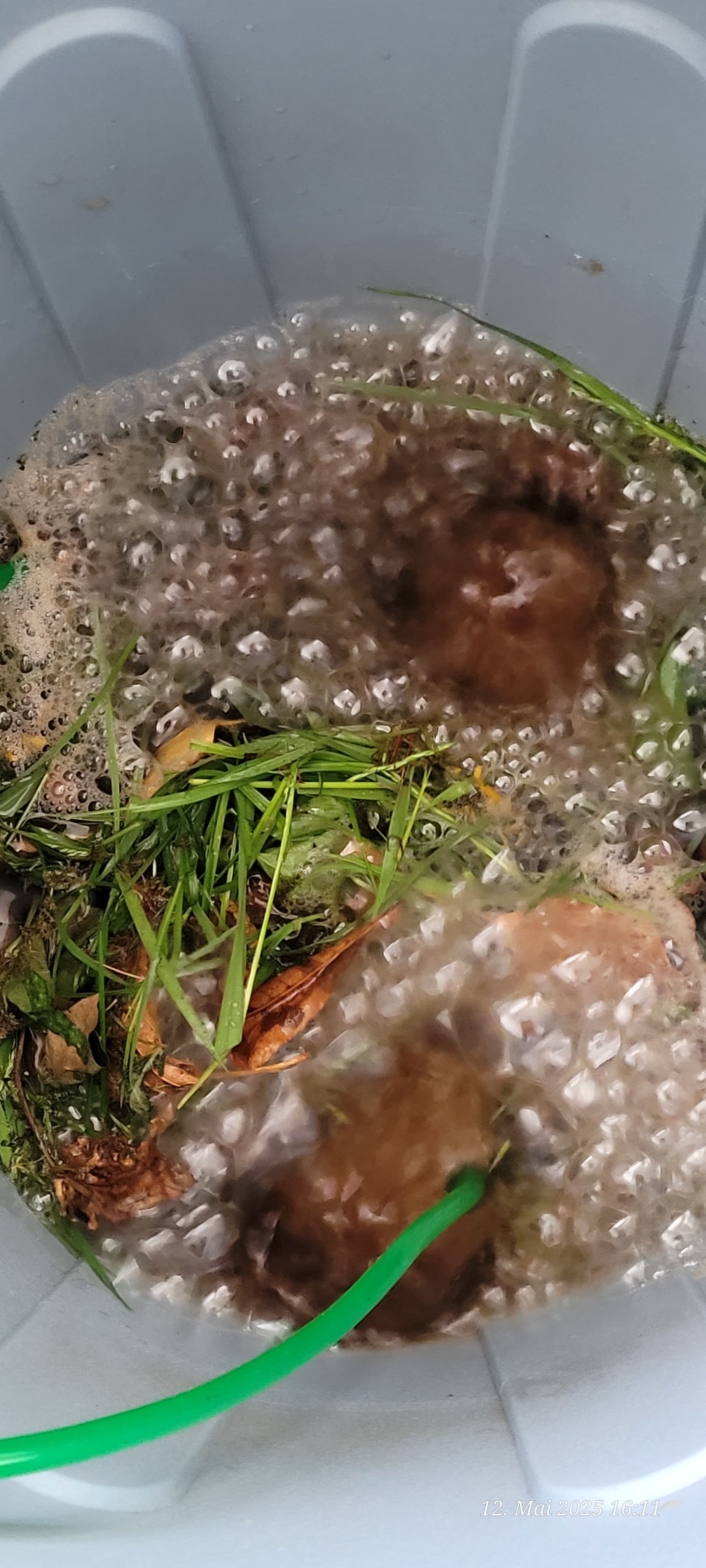 Habe nun mal was neues am Start. Rasenschnitt, alte Blätter, Blätter von Entlaubung der Damen und das blubbert nun in 7 Liter Wasser, mit etwas Bacteria, EM Aktiv, Bodenhilfsstoff, Wurzel Boost X und noch Super Mikrobes X mit 15 ml Melasse als Futter für die Bakterien. Mit der Brühe gieße ich in 4 Tagen von oben und die modrigen Pflanzenreste lege ich in den Töpfen auf das alte Mulch und mische etwas klein Tierstreu noch mit unter, um die Mulch Schicht oben her etwas auf zu füllen.