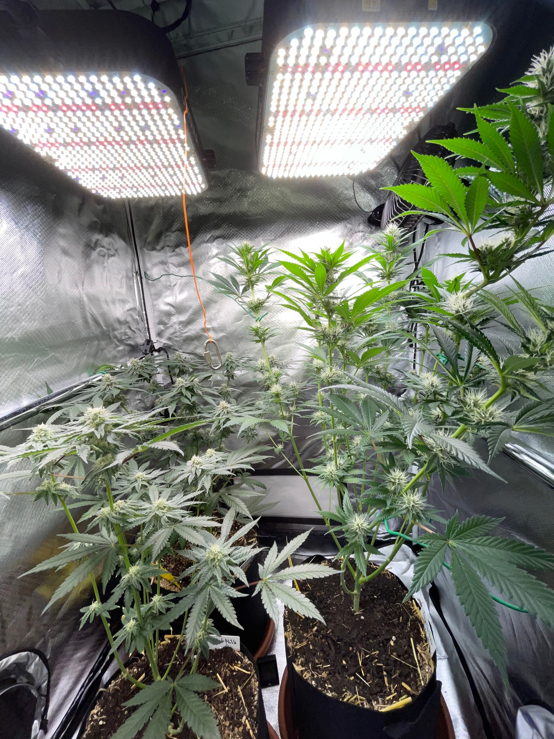 Back to the dehumidifier in the tent that runs with a compressor. This results in the temperature increasing, and that was OK during the dark phase. There was only a 2.5 degree drop compared to the day with light. But I don’t like these sudden ups and downs at all, and in the morning, with the lights on, it peaked at 30 degrees in the tent. Set to 55% humidity, it switches off when below that. Then the humidity rises again and the temperature drops. So it starts again and the temp rises, the humidity falls. But the fluctuations at the peak are a bit brutal for me. So I only operate the thing standing in the room to avoid these fluctuations. Today the ladies are on day 70 since germination and it is now flowering day 23. As it looks, not much more is happening in terms of height now. In terms of mass, it suits me and is becoming very pleasant.